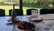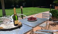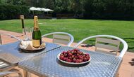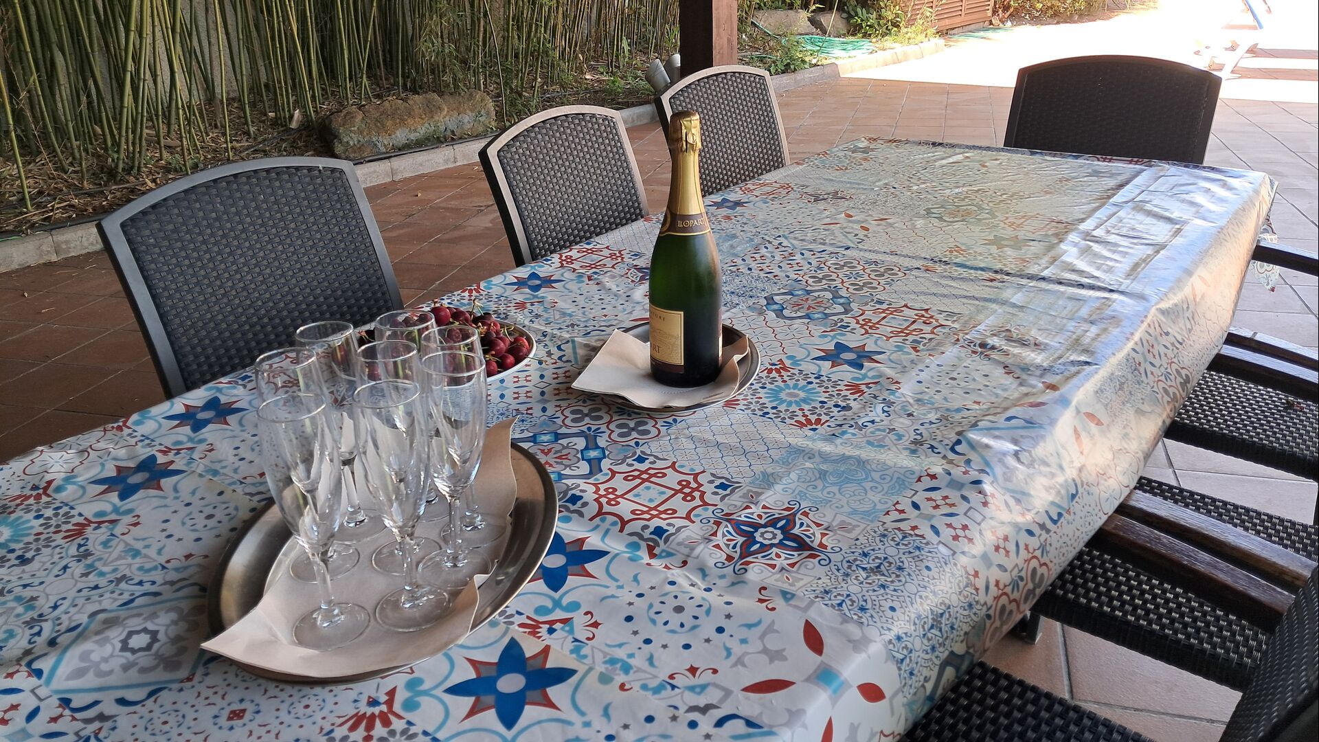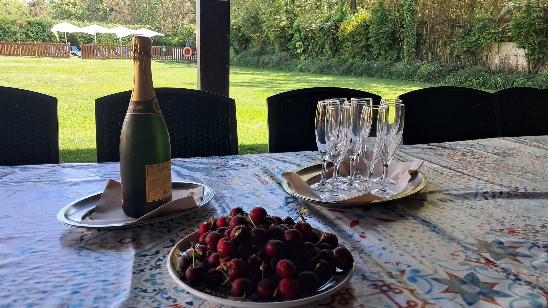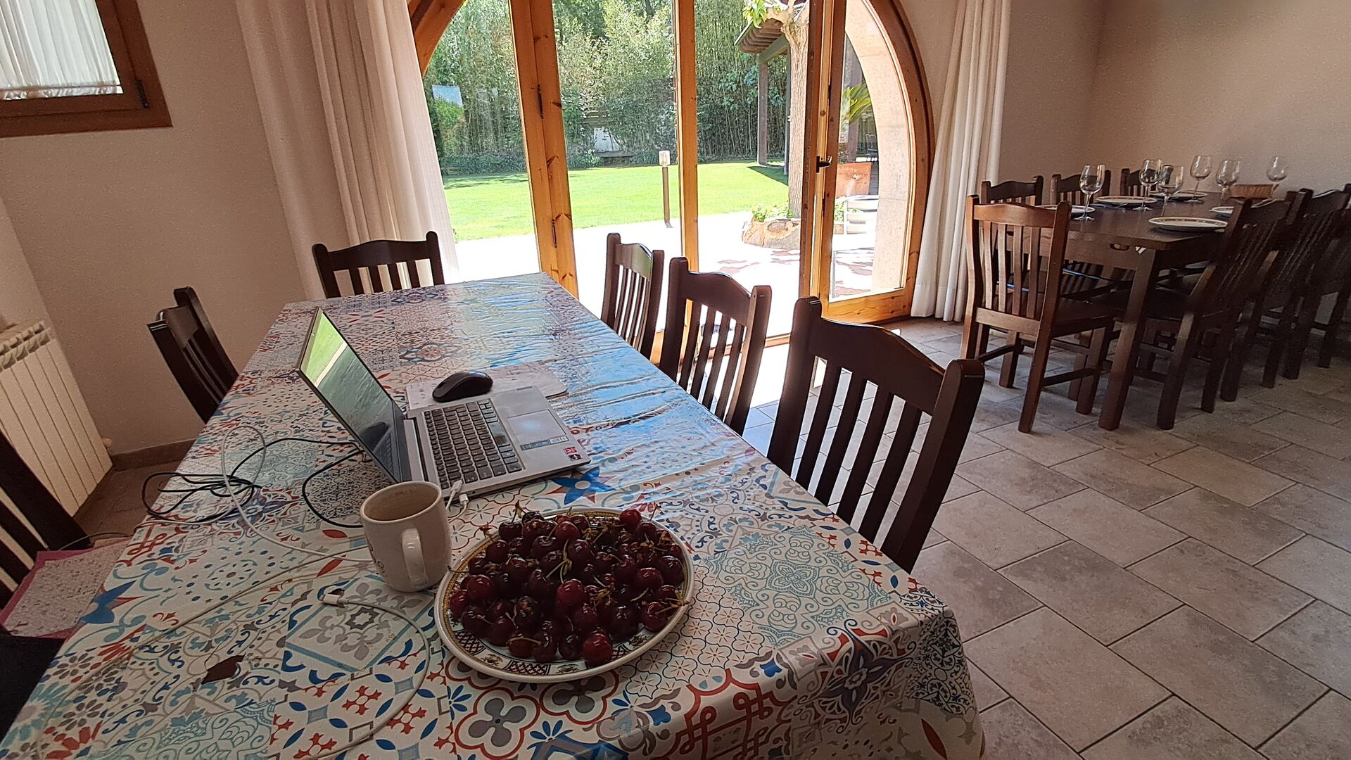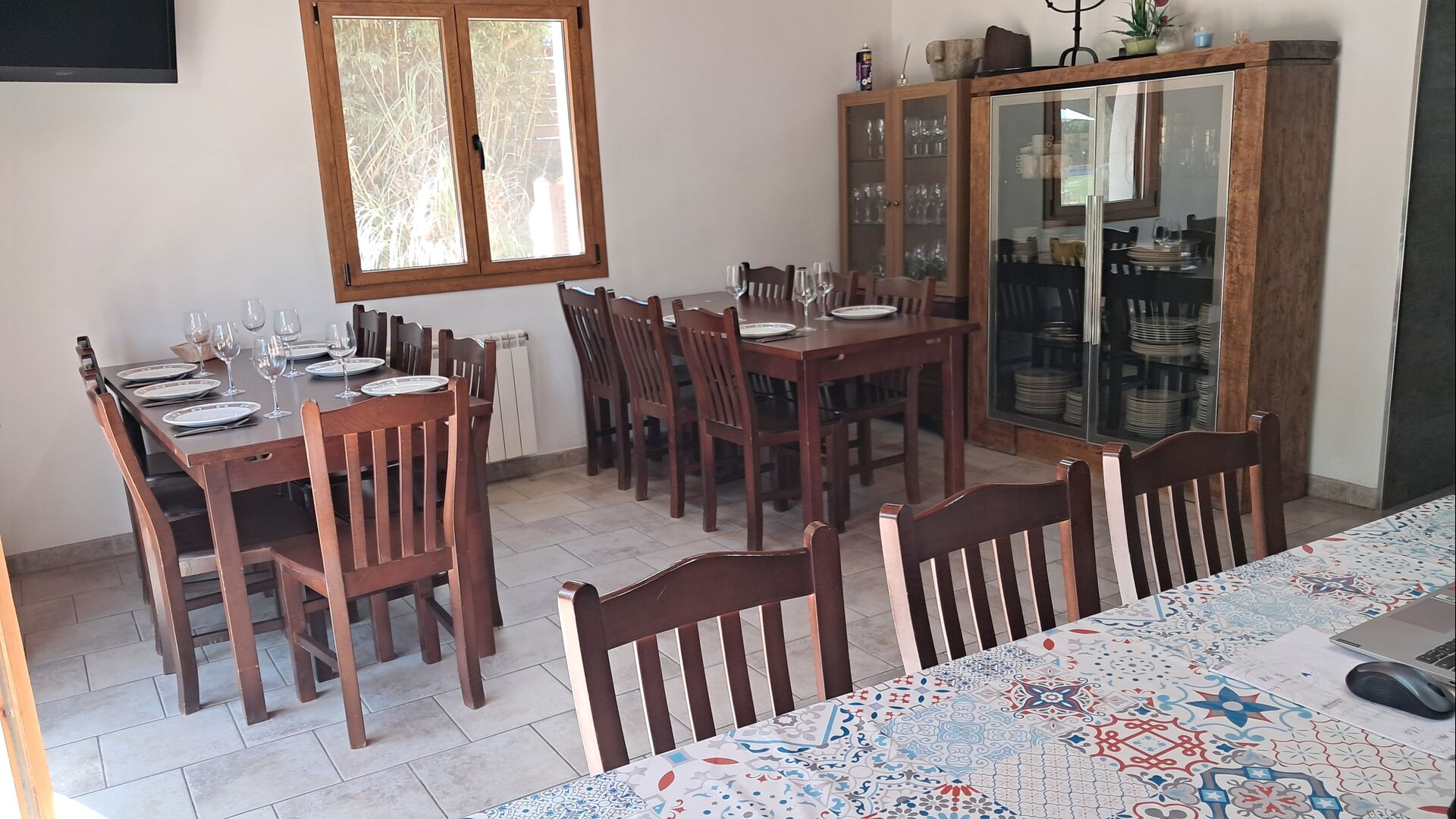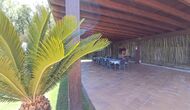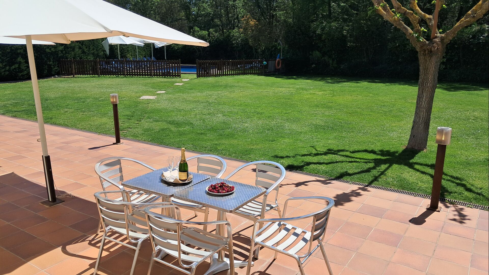 Es gibt eine große überdachte Terrasse, wo den ganzen Urlaubgruppe draußen sitzen und essen kann. Es gibt weiterhin ein großer Grill, auf dem man auch das Essen vorbereiten kann.