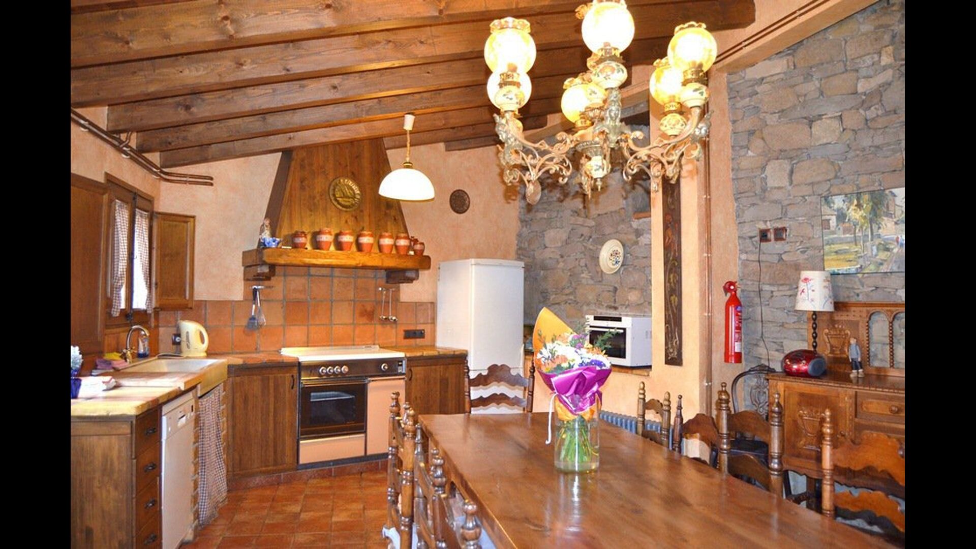 Im Ferienhaus Masia El Torre gibt es eine traditionelle spanische Küche im Landhausstil mit modernen Annehmlichkeiten eingerichtet. Für Mittagessen zu Hause gibt es einen traditionellen spanischen Esstisch, als Sammelpunkt. Das Wohnzimmer mit Blick auf den Garten und Kamin (wenn man es im Winter mietet und ein wenig mehr Wärme und Komfort braucht). Im Haus gibt es 4 Schlafzimmer, 2 Doppelzimmer, ein Dreibettzimmer und ein Schlafzimmer für 4 Personen. Insgesamt gibt es Platz für 11 Gäste im großen 250m2 Haus. Das Haus hat 2 Badezimmer.