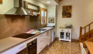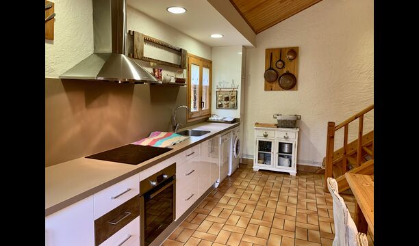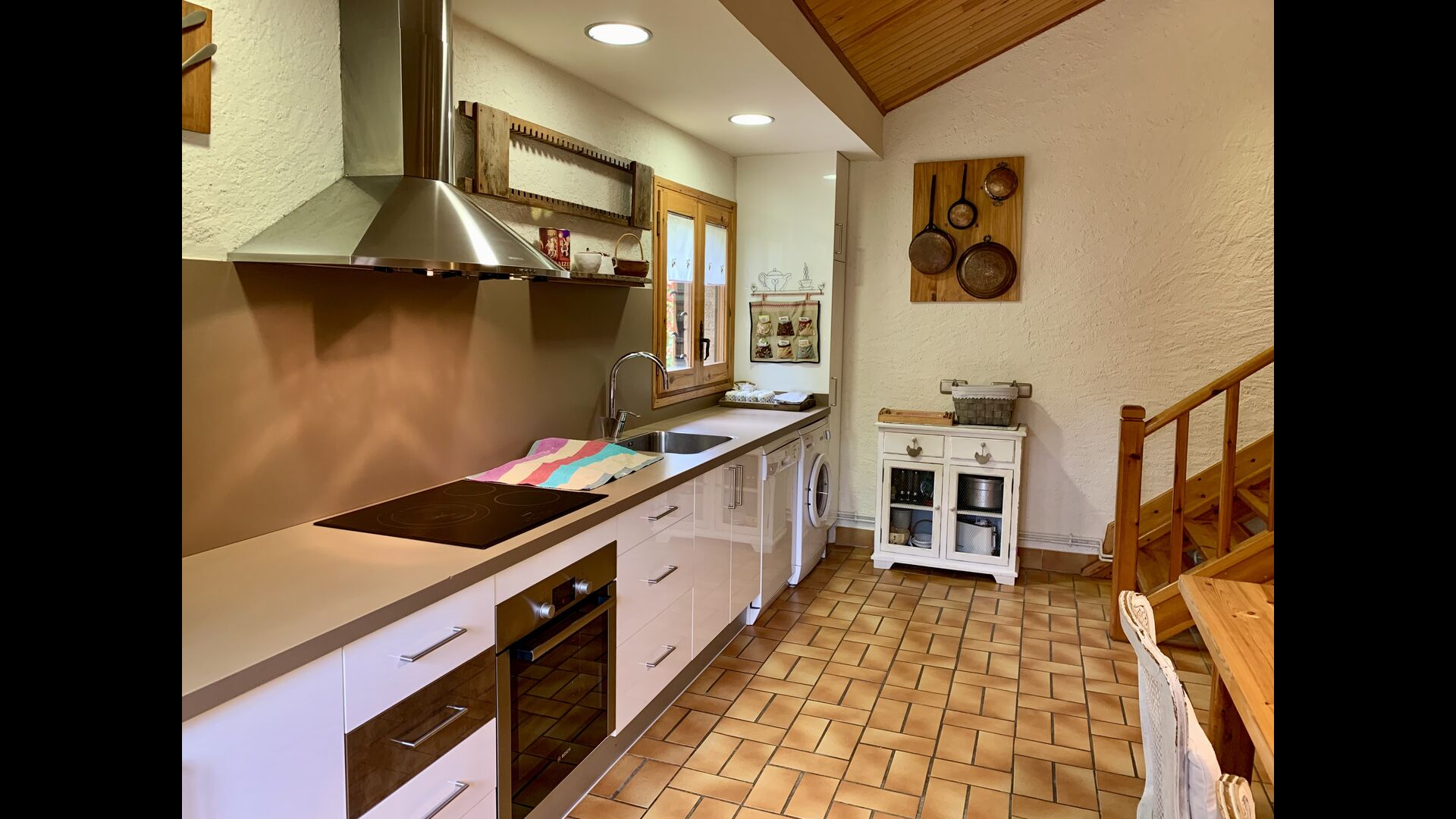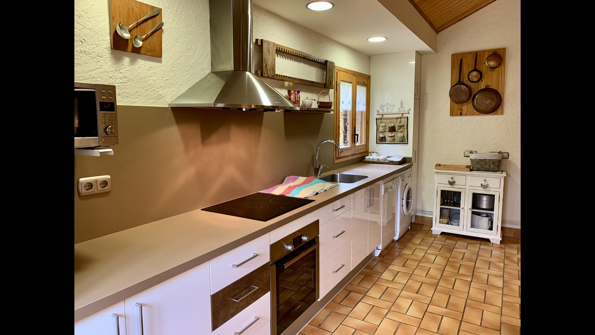 Innen ist das Haus sehr modern eingerichtet und dekoriert. Die Küche, ein Essbereich und eine Sofaecke bilden einen Familienraum im Erdgeschoss des Hauses. Die Küche ist neu und modern und verfügt unter anderem über einen Backofen, eine Spülmaschine, eine Mikrowelle , ein Kühl- und Gefrierschrank sowie viele weitere notwendige Utensilien. Gleich daneben steht ein Esstisch.