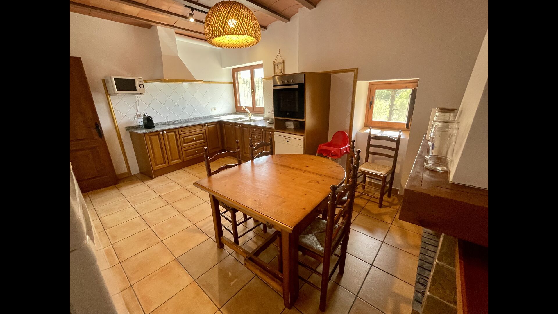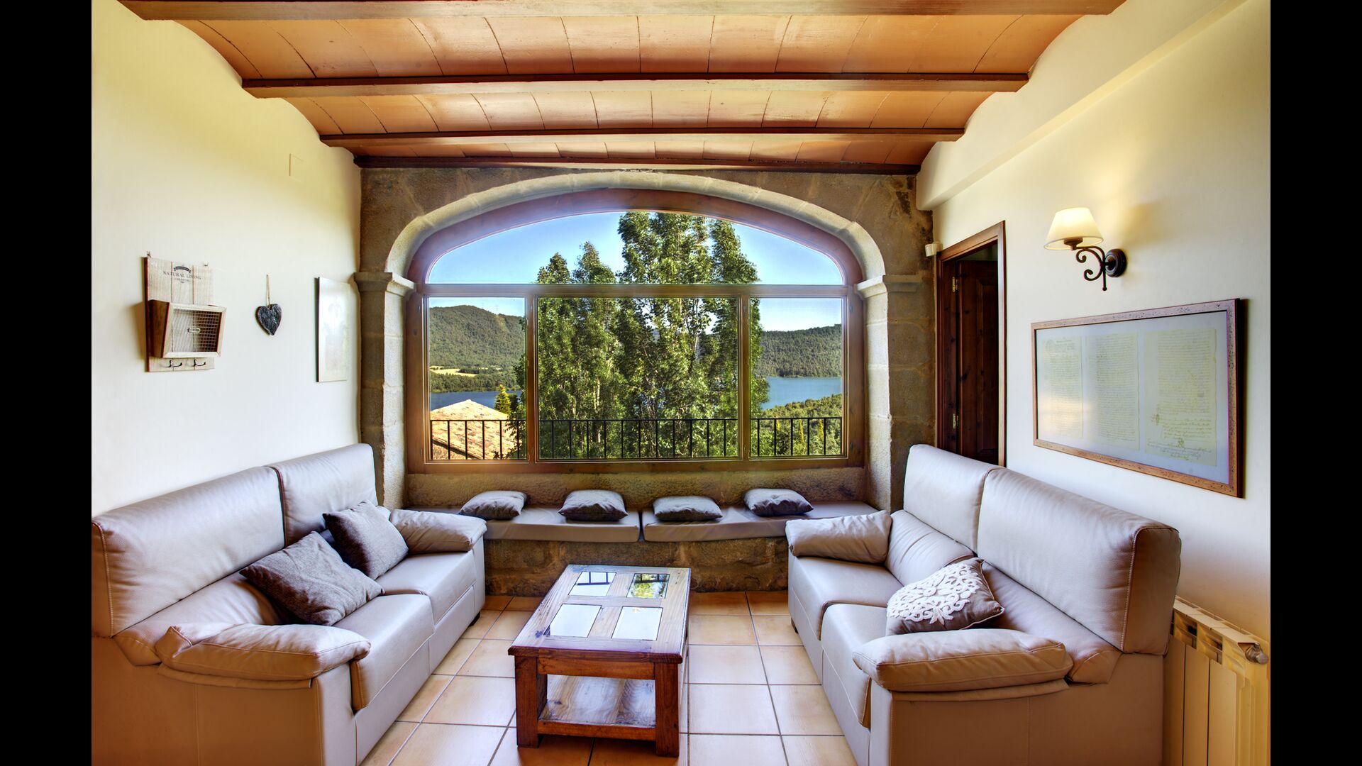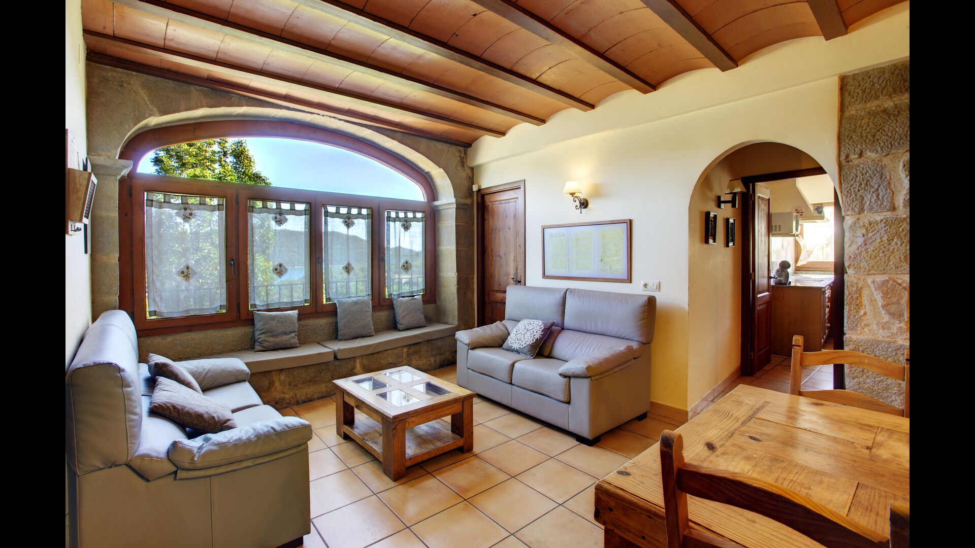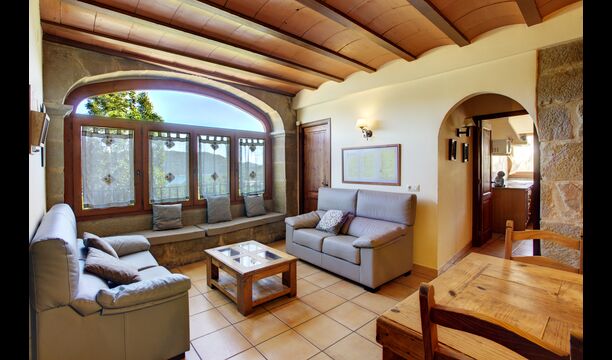 Das Haus hat vier Stockwerke: Sie kommen ins Erdgeschoss hinein, das einige Sitzgelegenheiten für Gruppen hat und mit wunderschönen restaurierten Gegenstände aus der Geschichte des Hauses verziert ist. Im Erdgeschoss befindet sich auch ein Doppelzimmer mit Bad/ / WC das für Behinderten eingerichtet ist. Auf der ersten Etage gibt es zwei Küchen, zwei Kamine, zwei Esszimmer und zwei schöne Aufenthaltsräume. Bei der Renovierung des Hauses hatte man den atemberaubenden Blick stets für Auge. Deshalb hat eines der Wohnzimmer ein riesiges Fenster mit Aussicht auf die Landschaft.