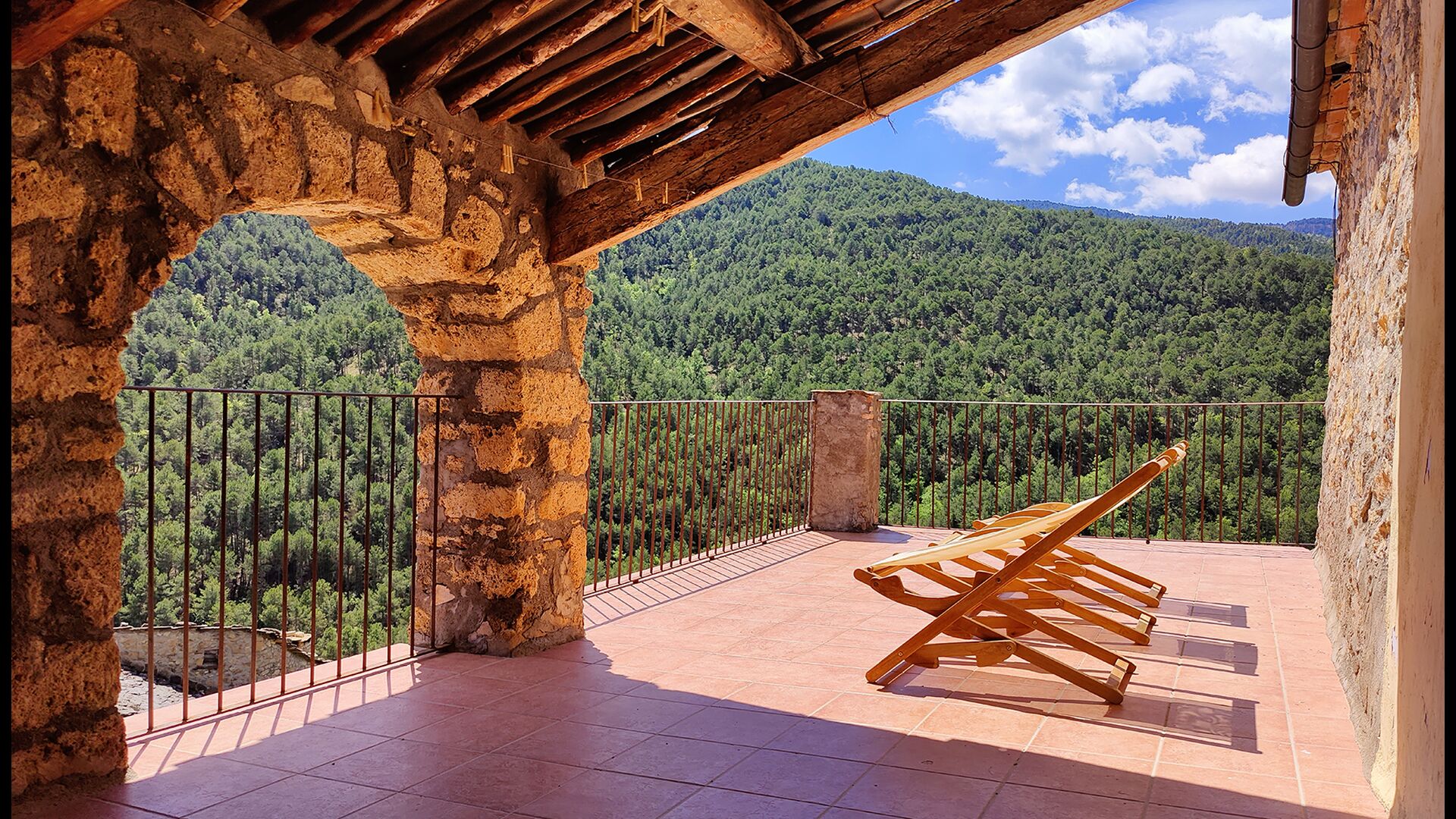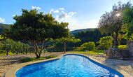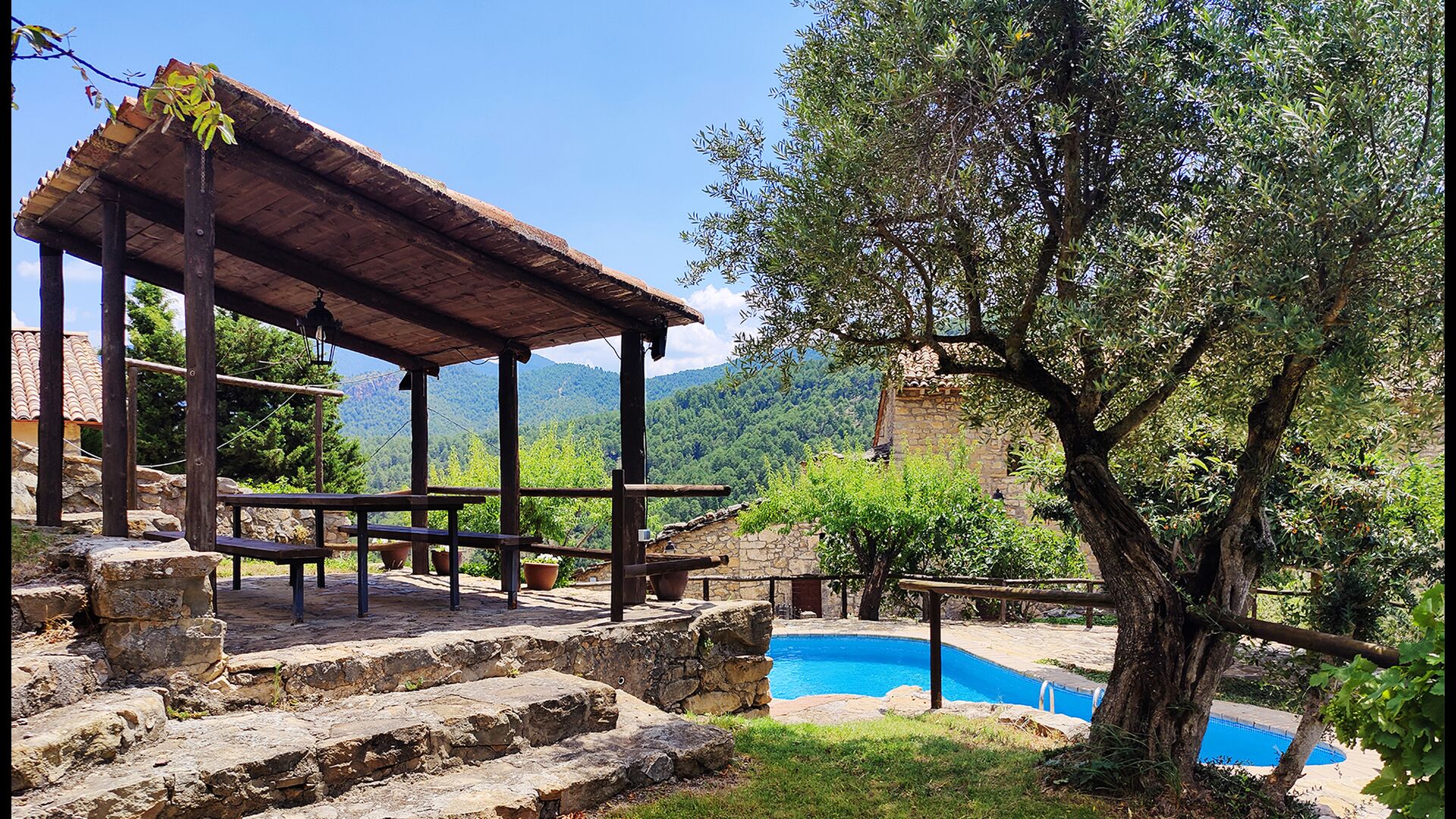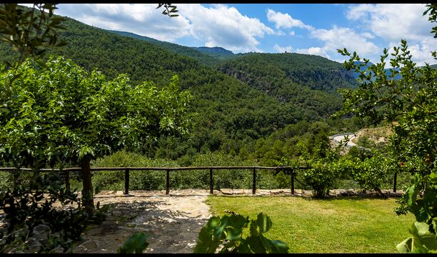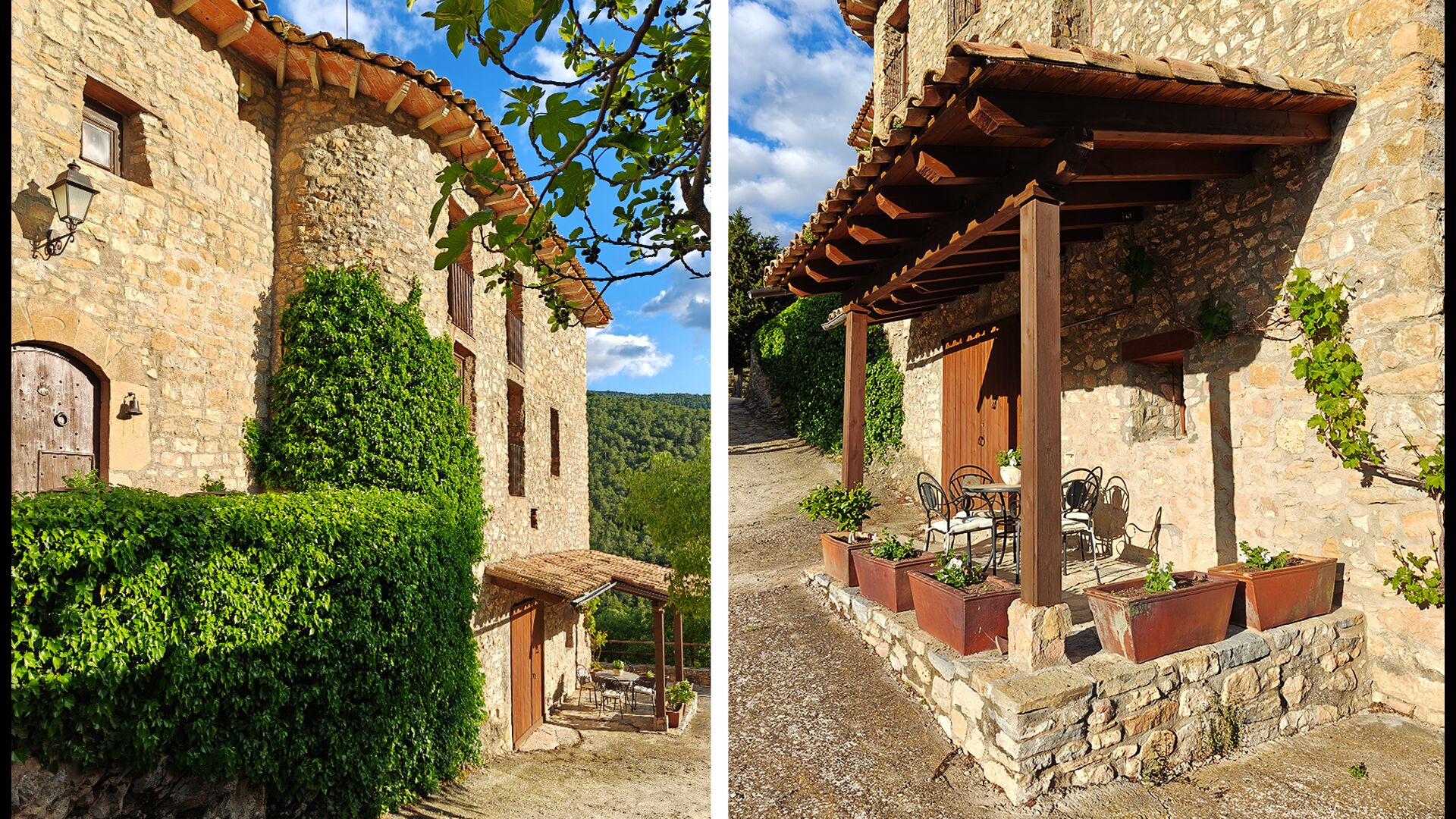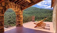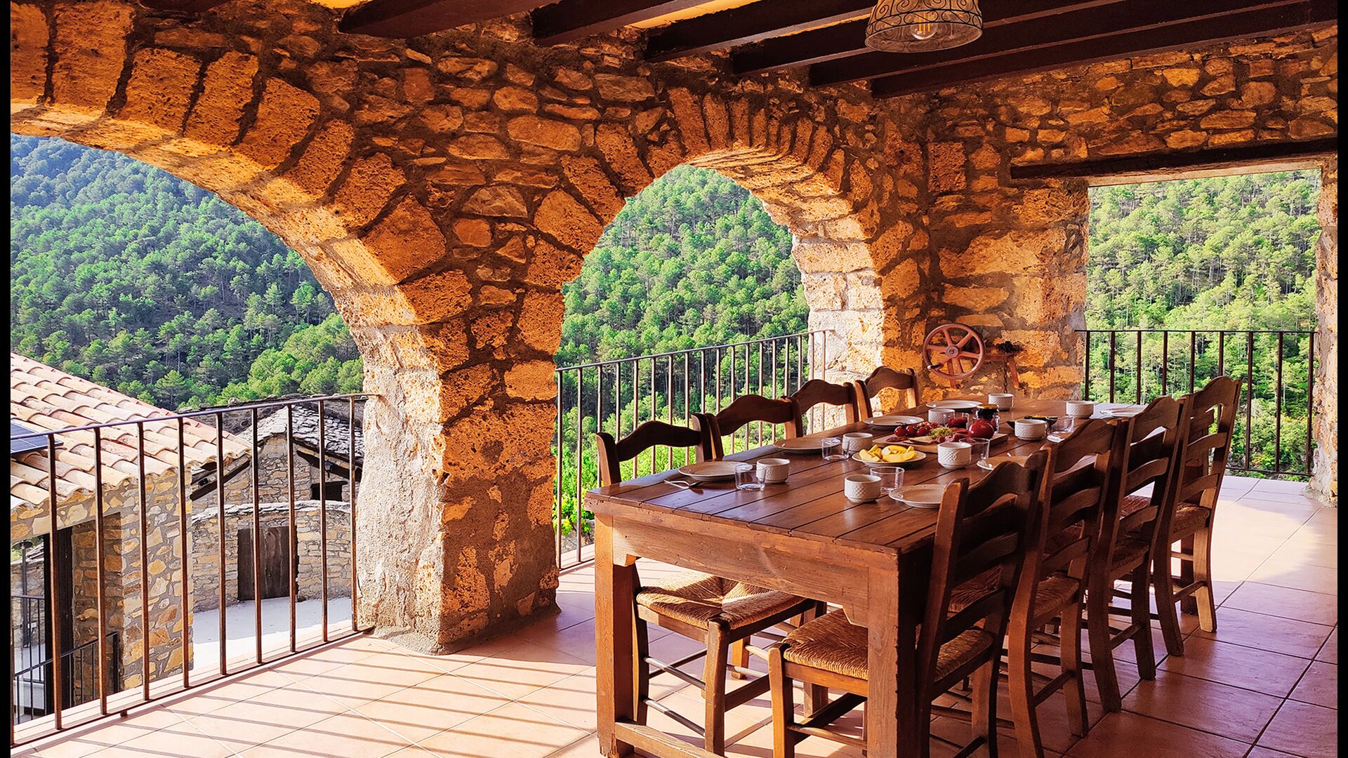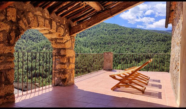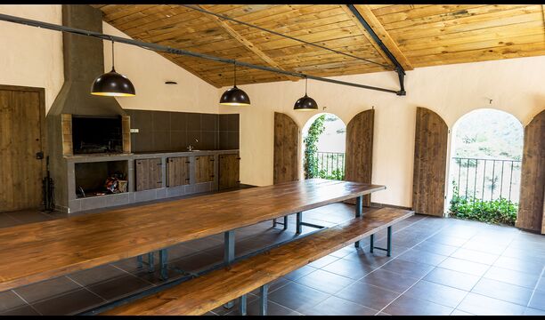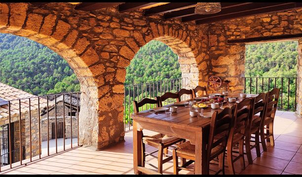 Die überdachte Terrasse ist einer der charmantesten Orte des Hauses und perfekt für ein Frühstück oder zum Entspannen, während man dem nahegelegenen Valldarques-Bach lauscht.