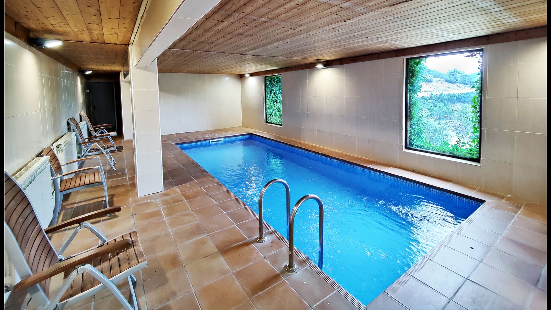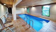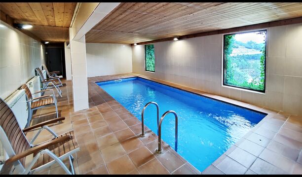 Das Anwesen verfügt über einen privaten Außenpool mit Liegestühlen sowie einen Garten mit Schaukeln für Kinder. In einem angrenzenden Gebäude befindet sich außerdem ein beheizter Innenpool und eine überdachte Grillterrasse, sodass Schwimmen und Essen im Freien das ganze Jahr über möglich sind.