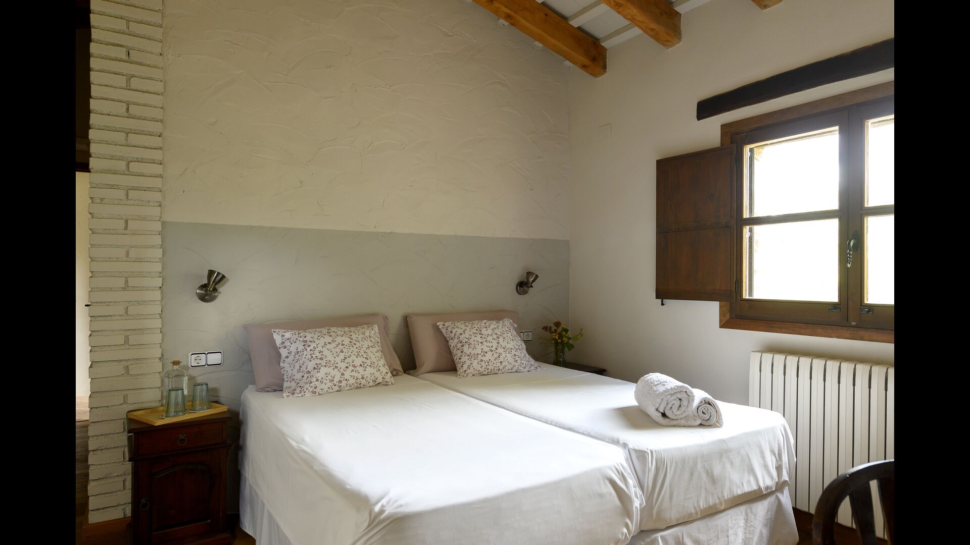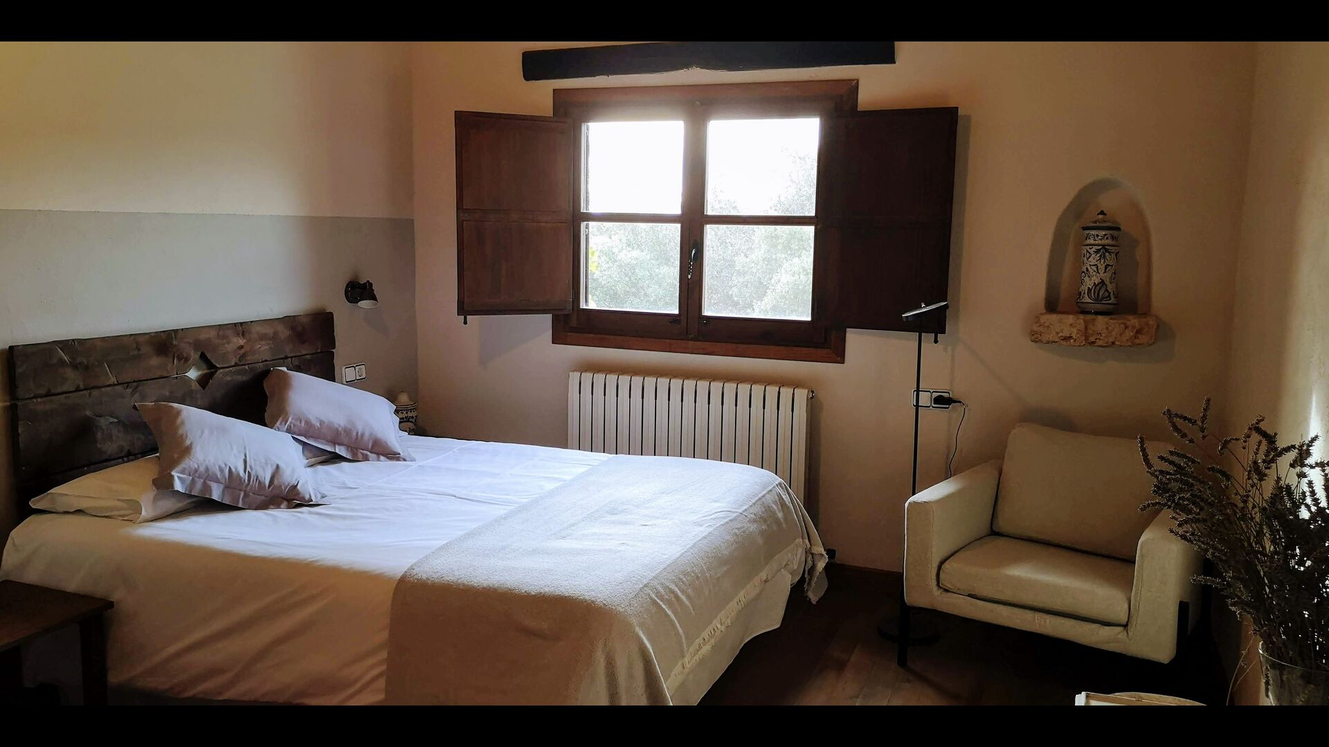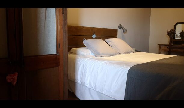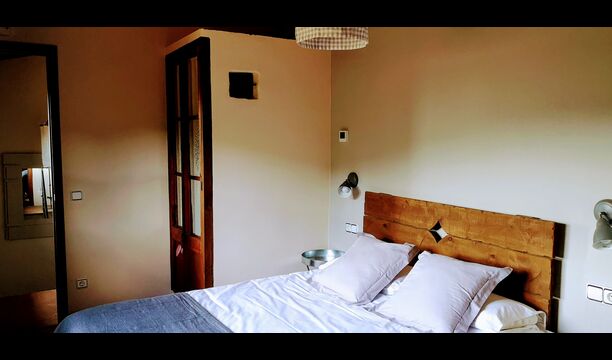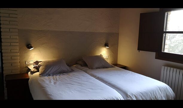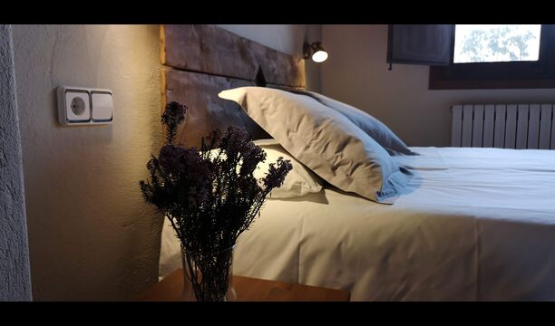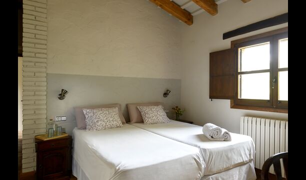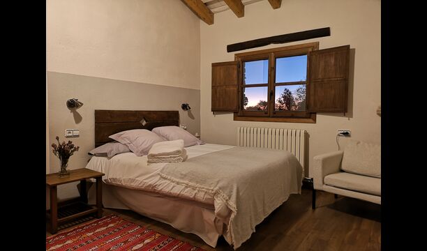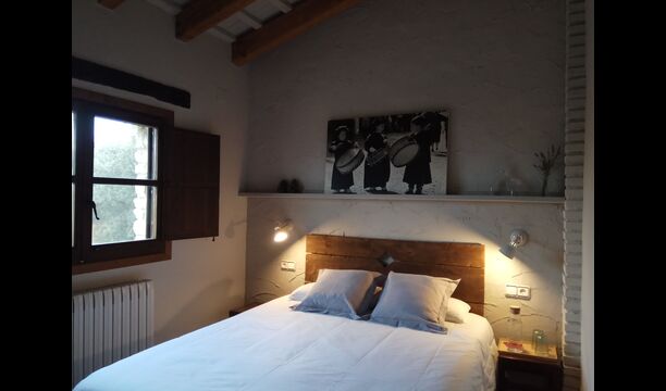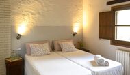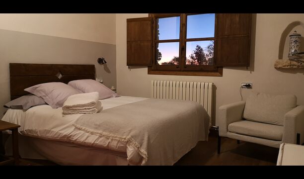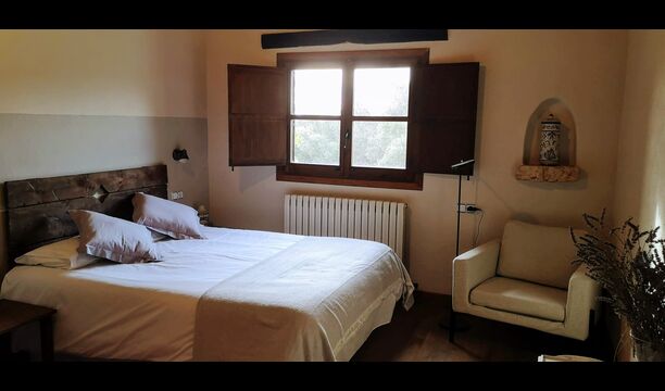 - Mont-Ral: Ein Zimmer mit 1 Doppelbett und eigenem Bad, ausgestattet mit einem klassischen, kleinen katalanischen Holztisch und Blick auf den Garten und die Berge. Die Maße des Bettes betragen 150x190cm.