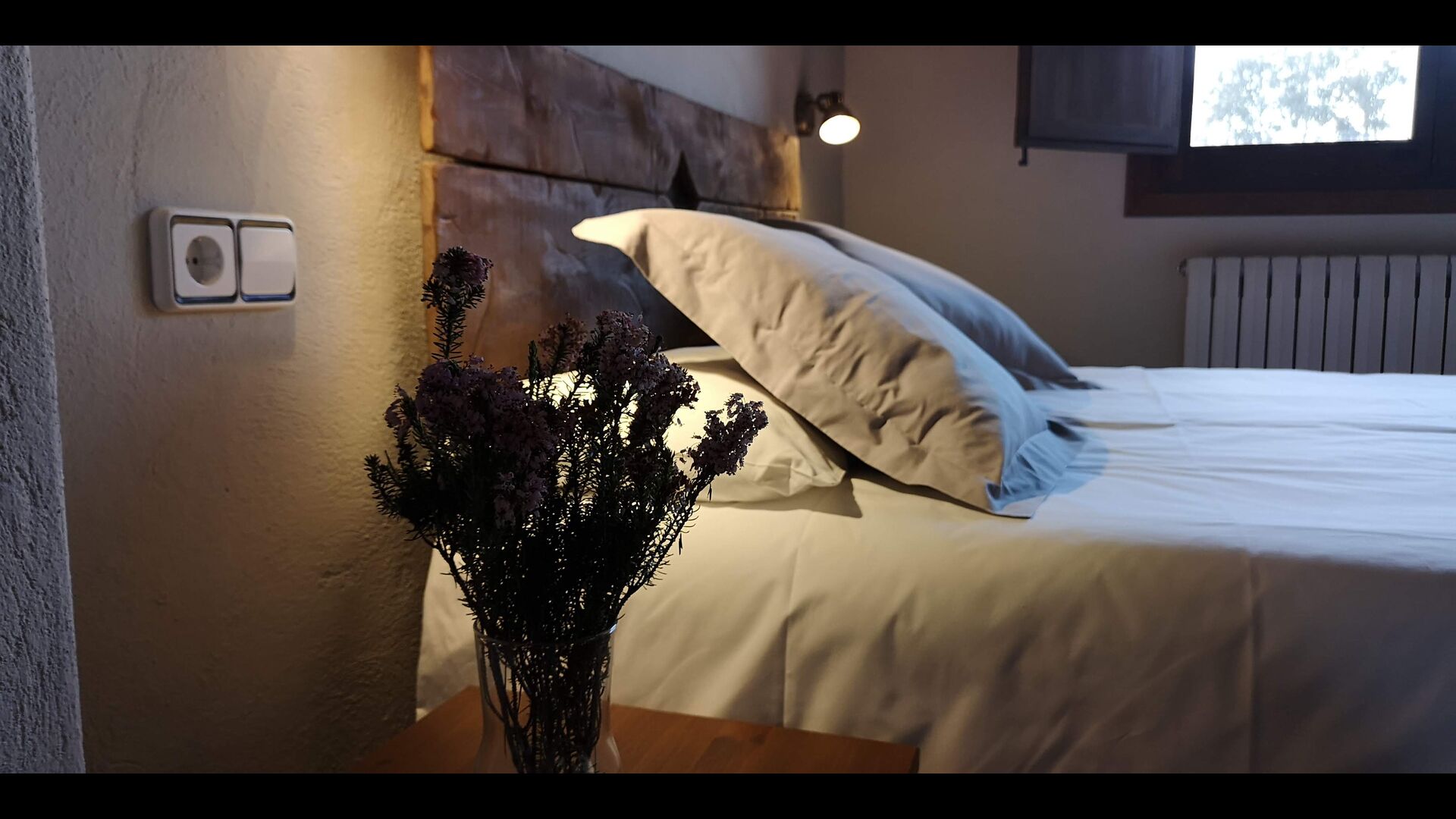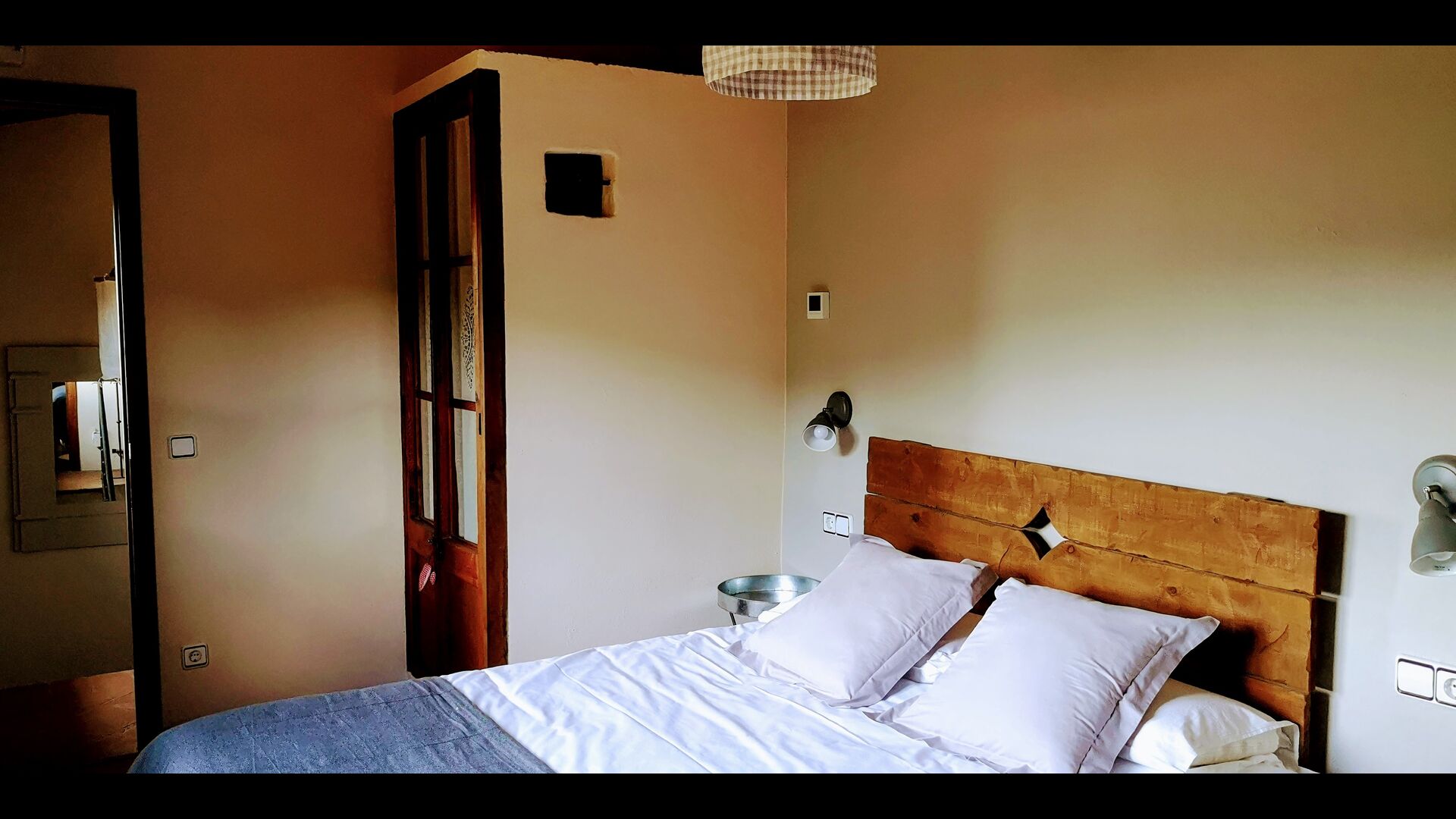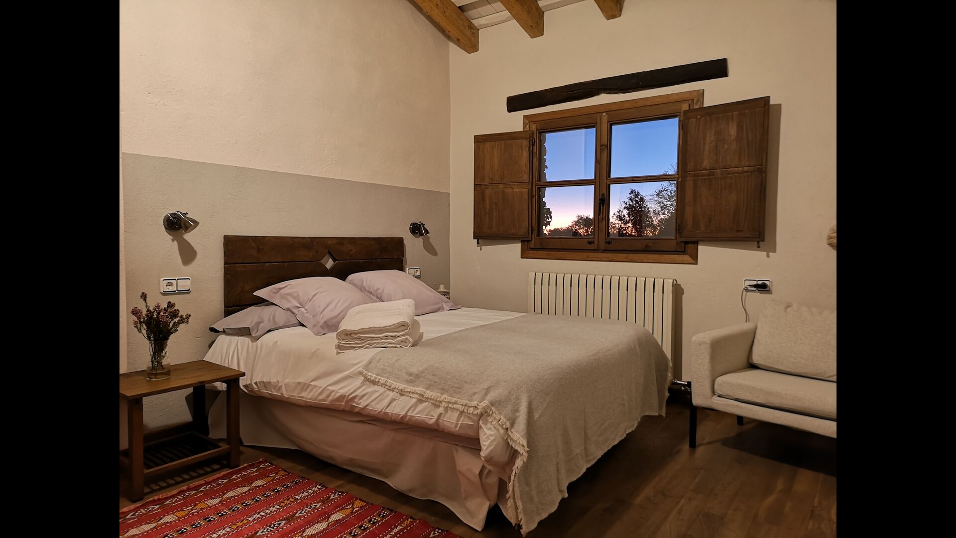 - Mont-Ral: Ein Zimmer mit 1 Doppelbett und eigenem Bad, ausgestattet mit einem klassischen, kleinen katalanischen Holztisch und Blick auf den Garten und die Berge. Die Maße des Bettes betragen 150x190cm.