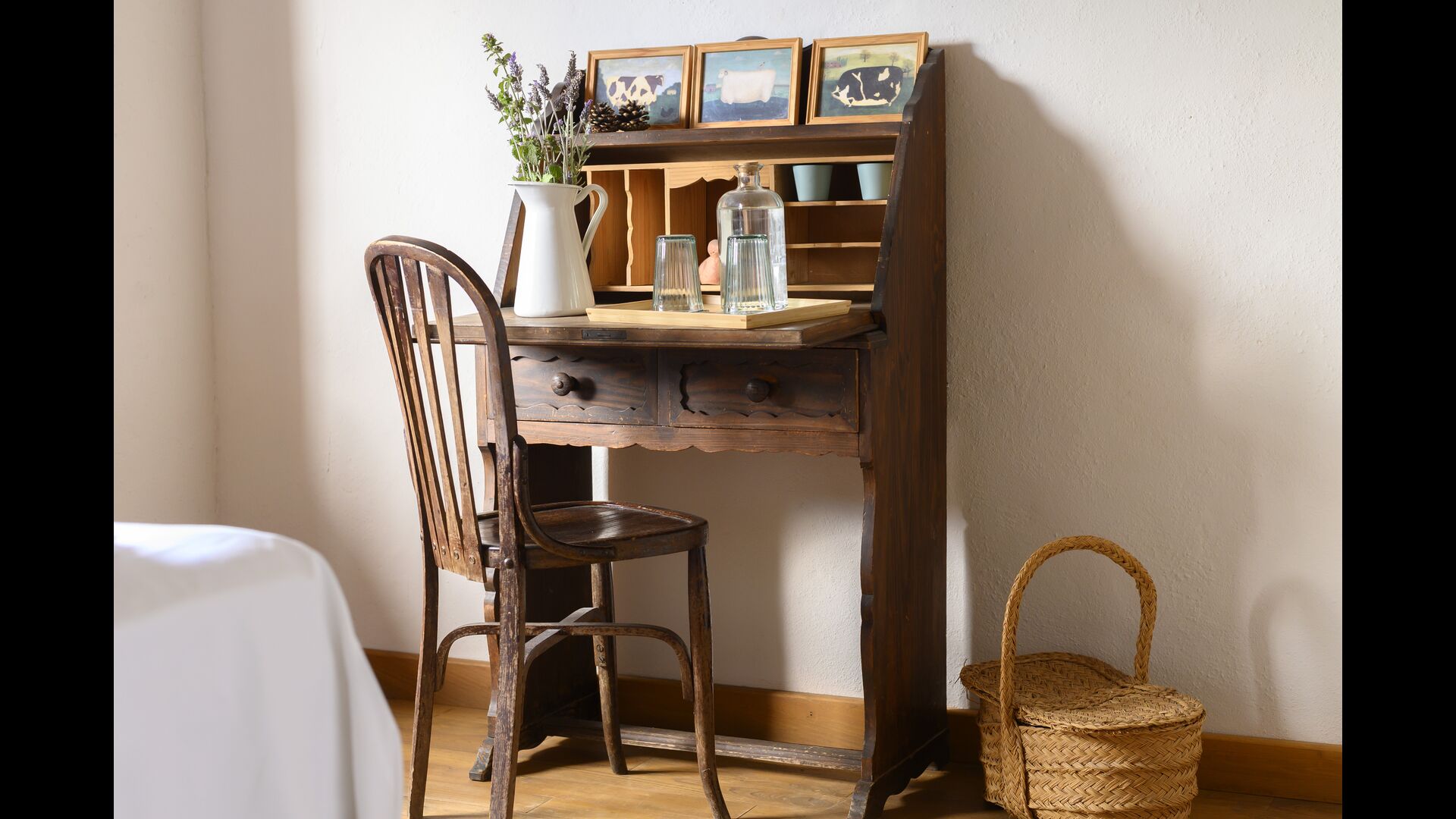 - Pintell: Ein Zimmer mit 2 Einzelbetten und einem eigenen Badezimmer sowie einer Leseecke und Blick auf den Garten. Die Maße eines Einzelbettes betragen 90x190cm.