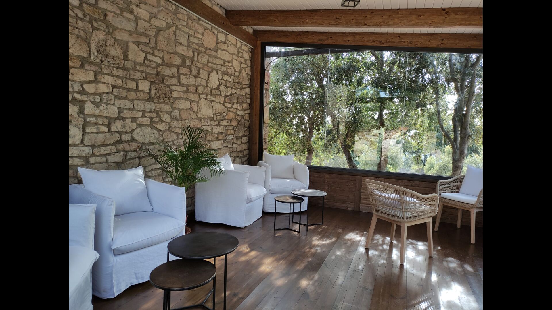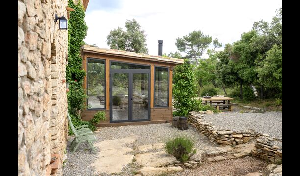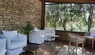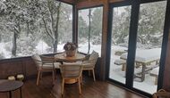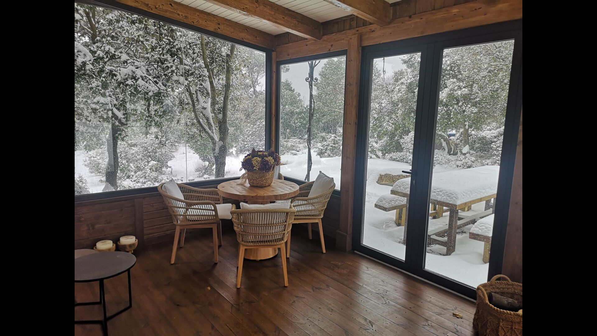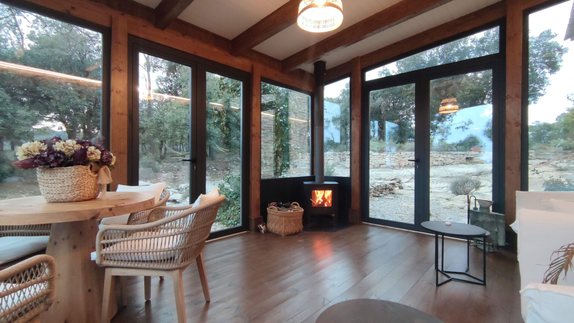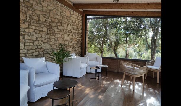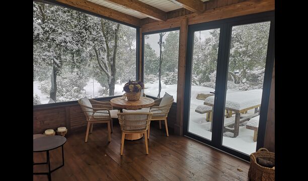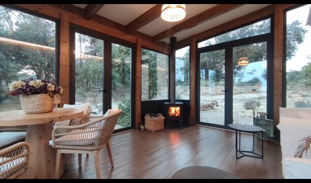 Darüber hinaus verfügt das Haus über einen überdachten, voll überdachten Terrassenbereich, mit großen Glasfenstern. In diesem Bereich gibt es auch einen kleinen Ofen, Sofasessel und Tische zum Entspannen, Lesen von Büchern oder Spielen von Karten. Unabhängig von der Jahreszeit oder dem Wetter wird Ihnen das Entspannen in dieser Gegend mit Sicherheit ein Gefühl von Frieden vermitteln, da Sie auf den tollen Garten blicken können. und die wunderbaren Anblicke der Landschaft dahinter.