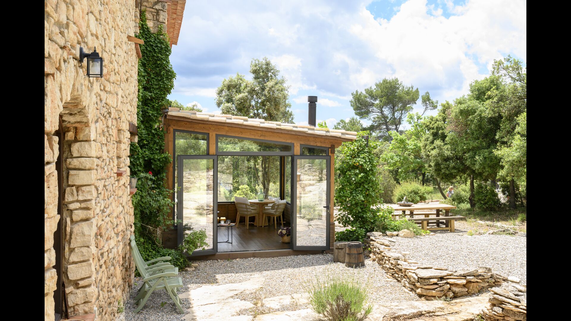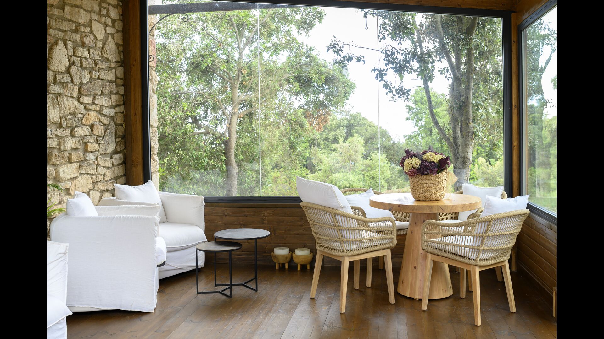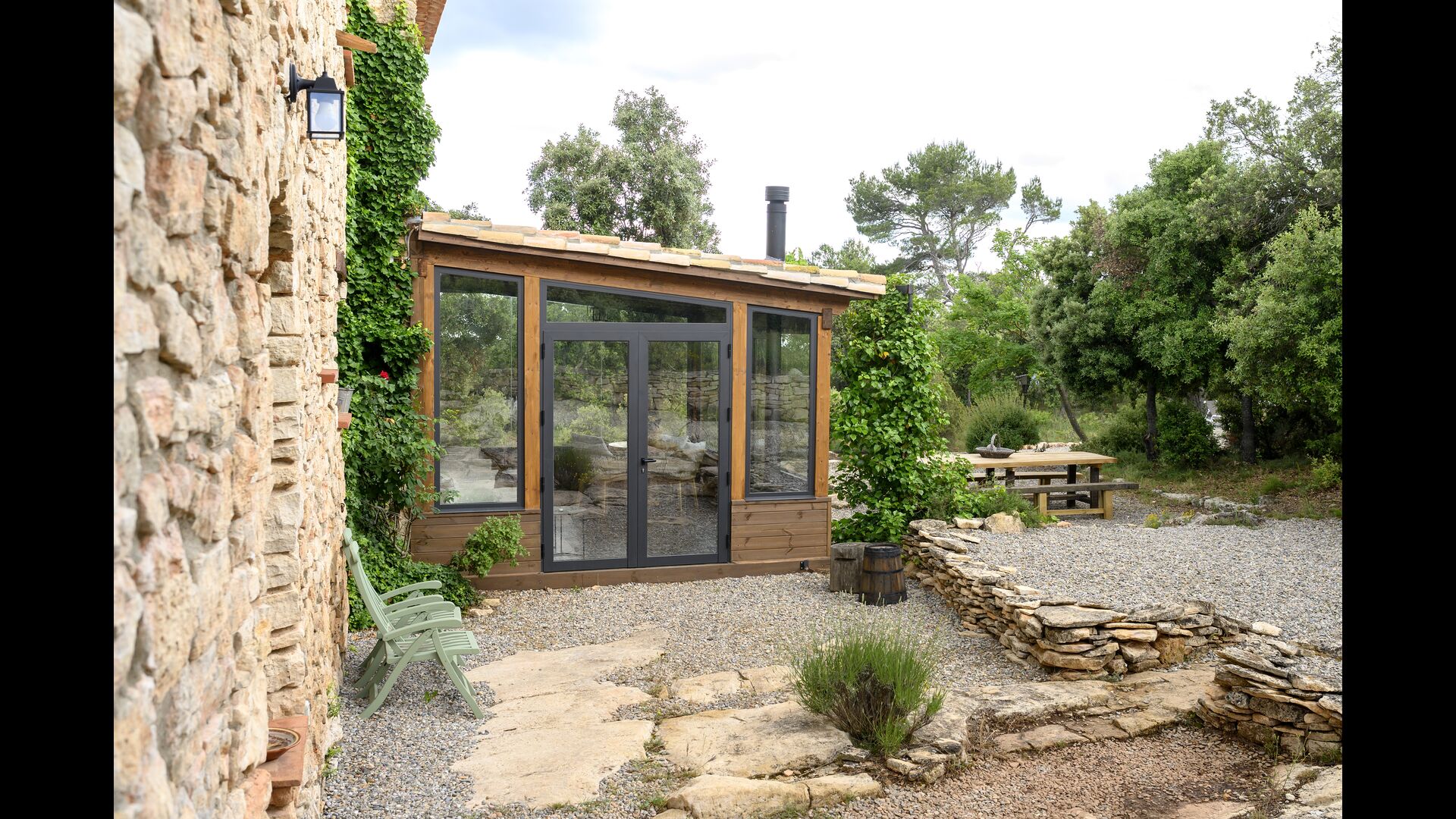 Darüber hinaus verfügt das Haus über einen überdachten, voll überdachten Terrassenbereich, mit großen Glasfenstern. In diesem Bereich gibt es auch einen kleinen Ofen, Sofasessel und Tische zum Entspannen, Lesen von Büchern oder Spielen von Karten. Unabhängig von der Jahreszeit oder dem Wetter wird Ihnen das Entspannen in dieser Gegend mit Sicherheit ein Gefühl von Frieden vermitteln, da Sie auf den tollen Garten blicken können. und die wunderbaren Anblicke der Landschaft dahinter.