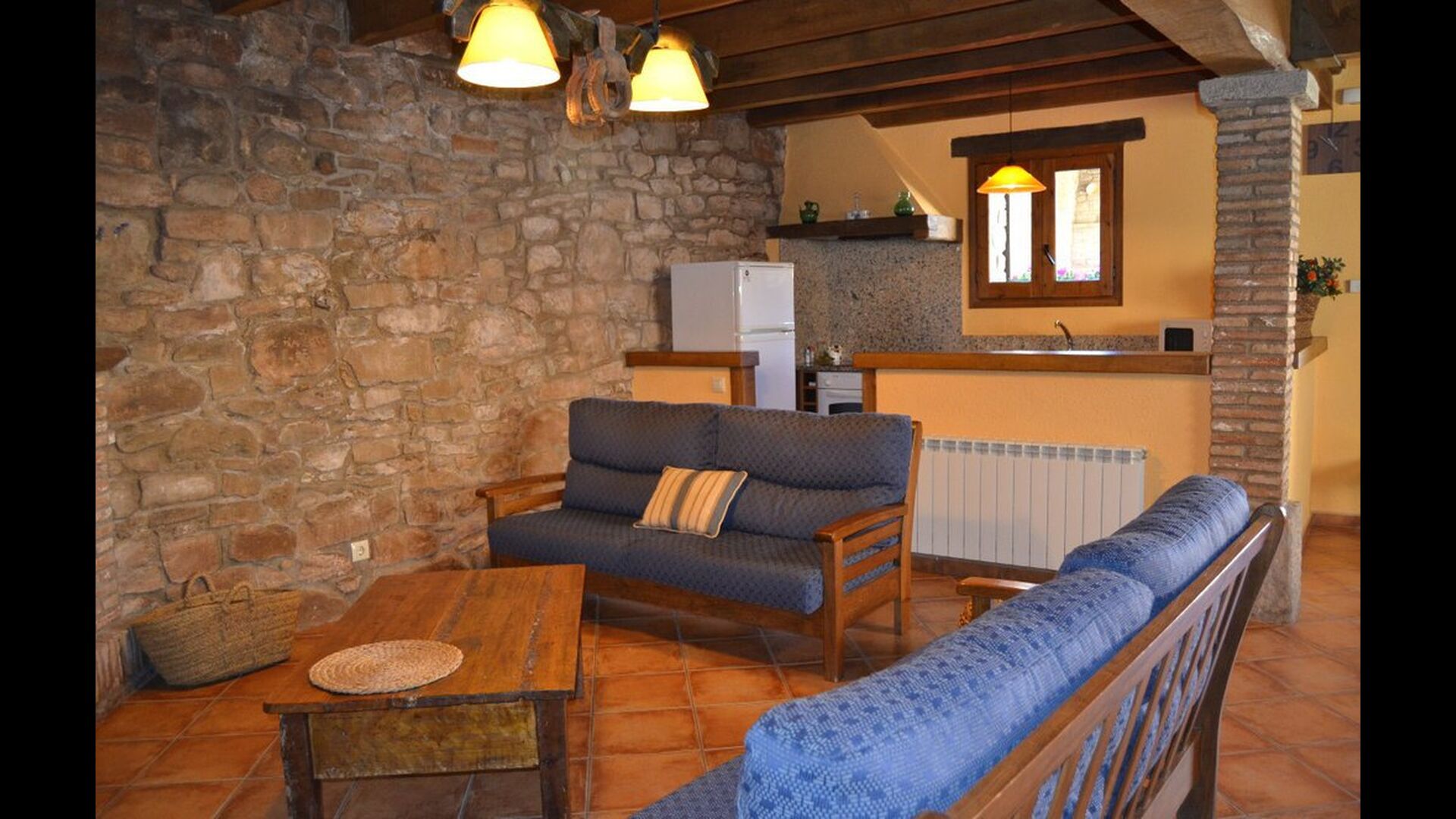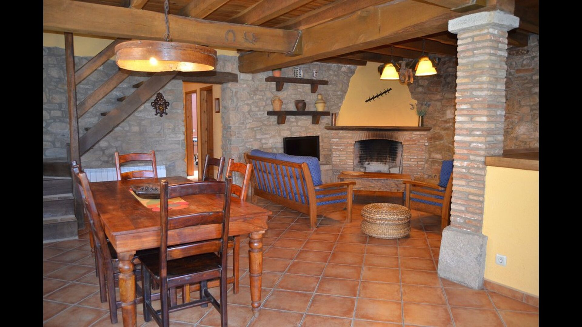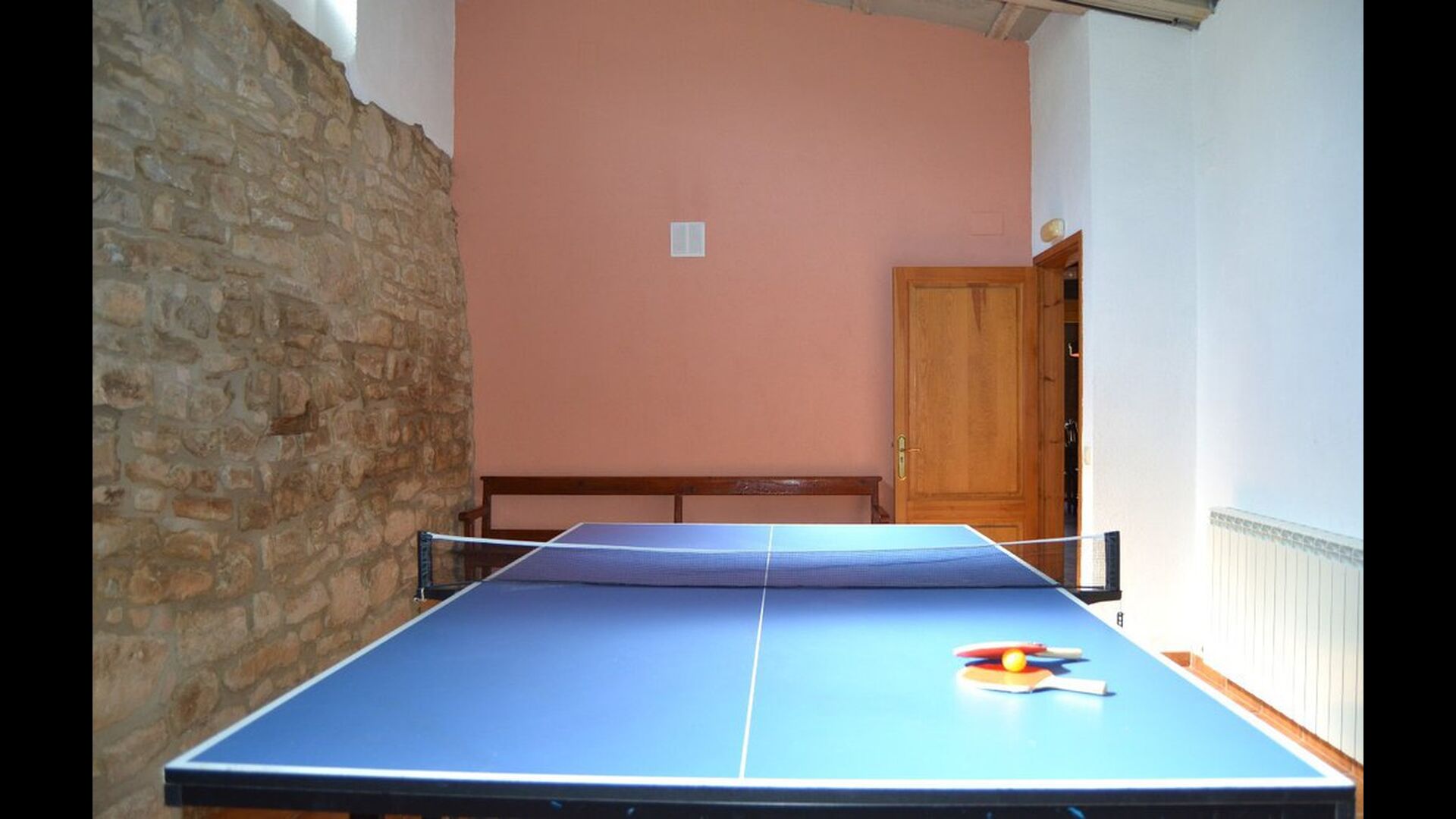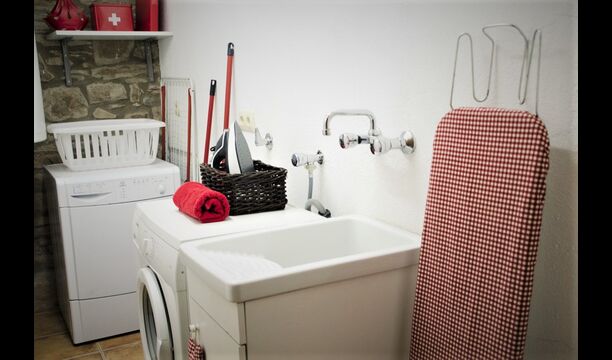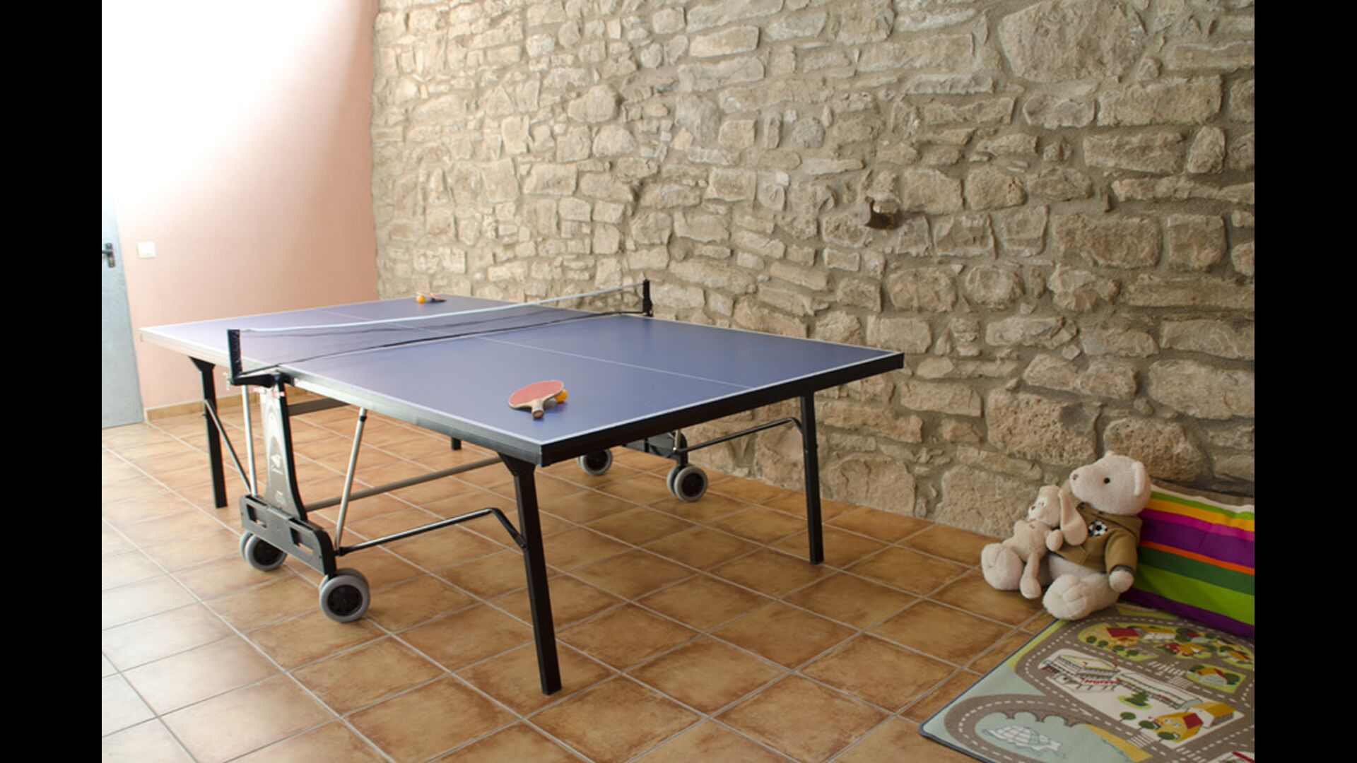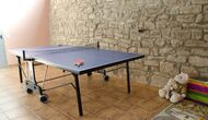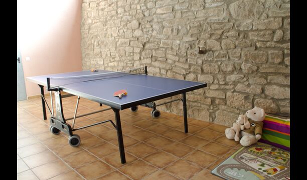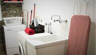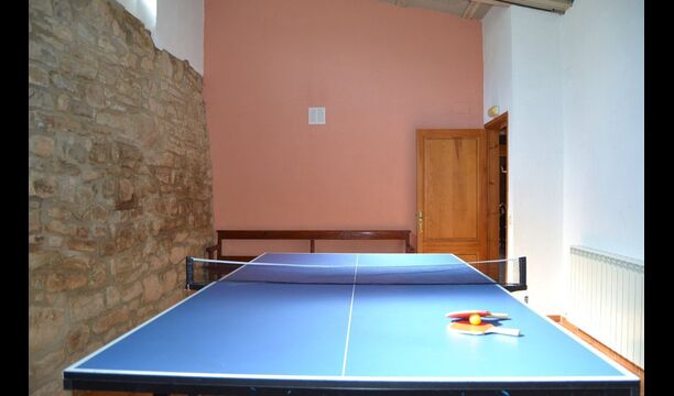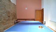 - Der Haupteingang im Erdgeschoss hat einen Innenhof mit einem Grill und Tische. Im Inneren des Gebäudes gibt es ein Esszimmer und ein Wohnzimmer mit zwei Sofas, Kamin und TV. Die Küche liegt zunächst und ist mit einer Glaskeramik-Kochstelle, Kühlschrank, Backofen und Geschirrspüler ausgestattet. Durch einen gemeinsamen Raum kommt man zu einem Badezimmer mit Dusche, einem Schlafzimmer mit zwei Einzelbetten, einem Waschraum mit Spüle, Waschmaschine und Trockner, und ein Spiel-Raum mit Tischtennis und Brettspiele.