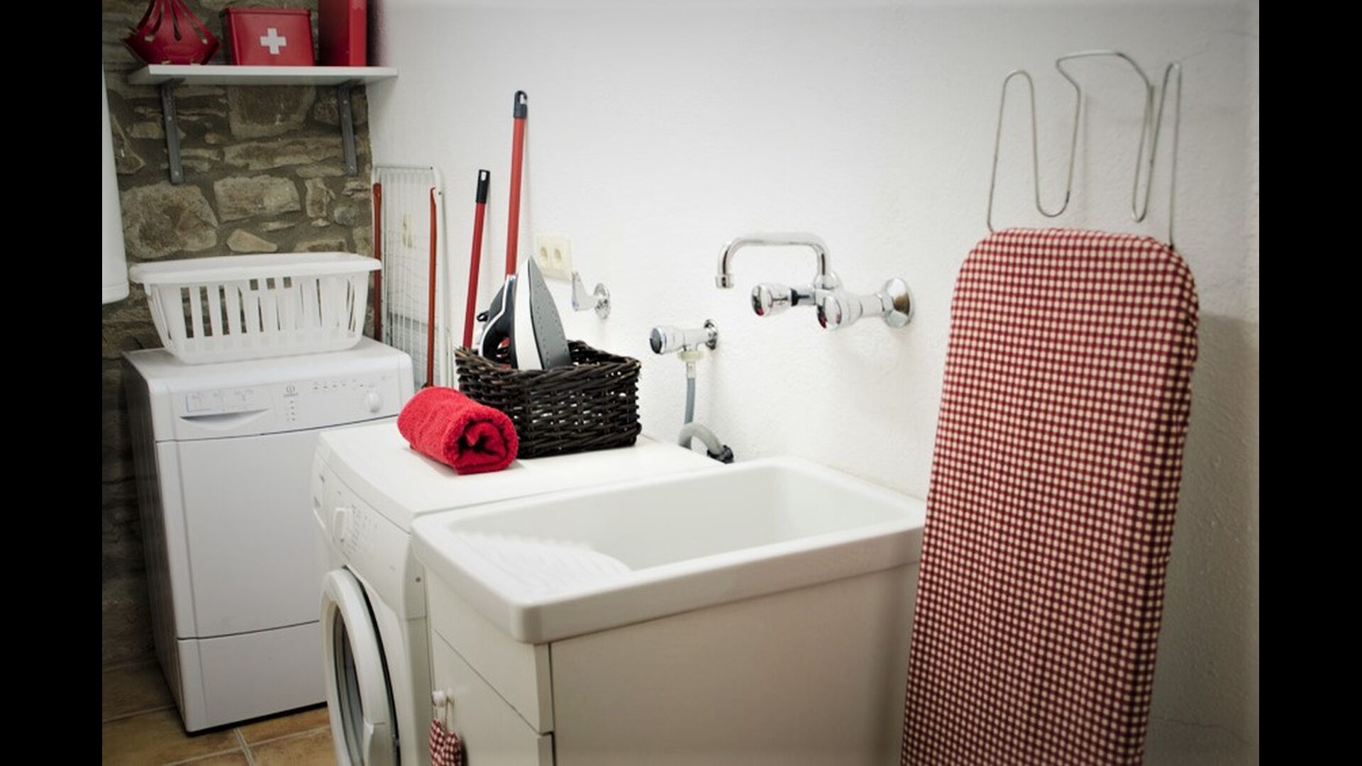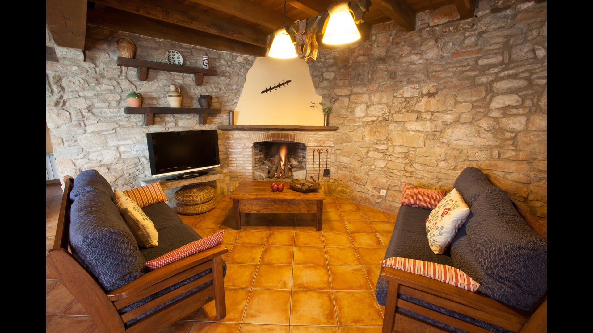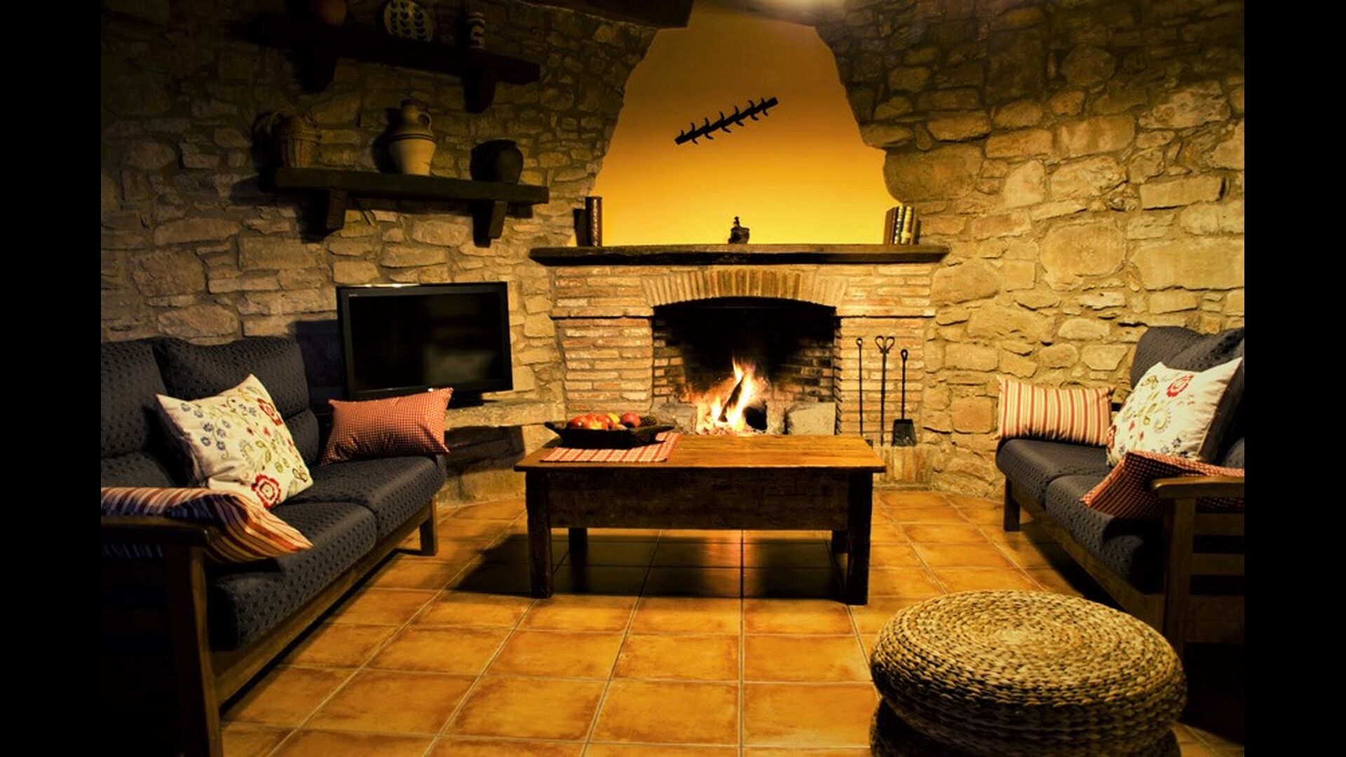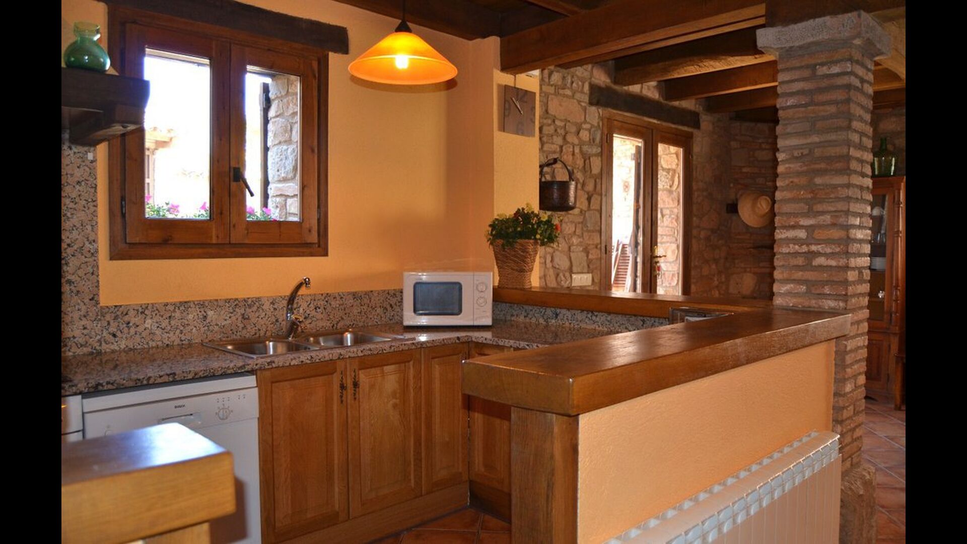 - Der Haupteingang im Erdgeschoss hat einen Innenhof mit einem Grill und Tische. Im Inneren des Gebäudes gibt es ein Esszimmer und ein Wohnzimmer mit zwei Sofas, Kamin und TV. Die Küche liegt zunächst und ist mit einer Glaskeramik-Kochstelle, Kühlschrank, Backofen und Geschirrspüler ausgestattet. Durch einen gemeinsamen Raum kommt man zu einem Badezimmer mit Dusche, einem Schlafzimmer mit zwei Einzelbetten, einem Waschraum mit Spüle, Waschmaschine und Trockner, und ein Spiel-Raum mit Tischtennis und Brettspiele.