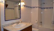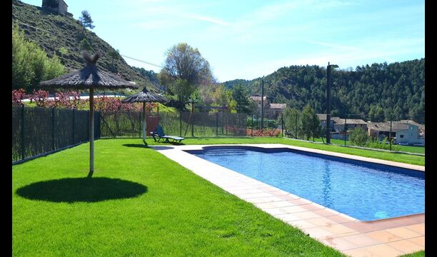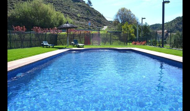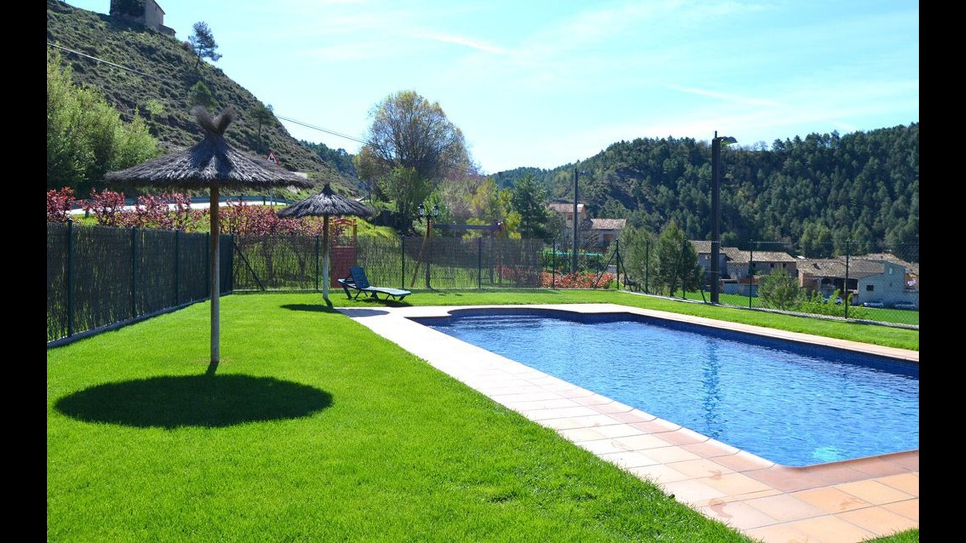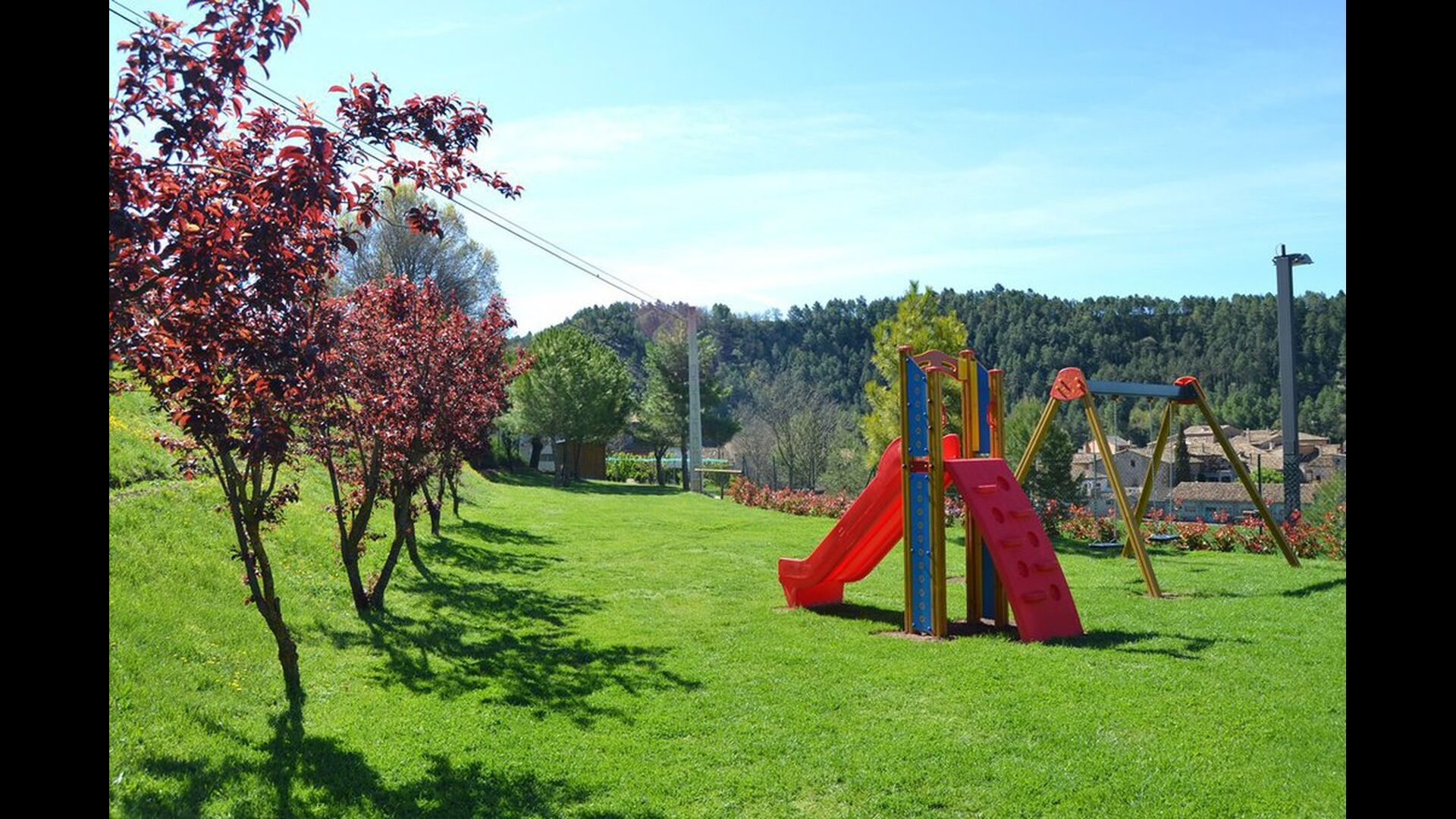 Weiter draußen im Garten gibt es einen kleinen Bereich für Kinder, mit Schaukeln und einer Rutsche. Am Ende des Gartens erreichen Sie den großen 50m2 Pool. Hier gibt es Treppen hinunter in das Wasser sind, damit kleine Kinder sicher hinuntersteigen können. Die Tiefe ist 75 cm an einem Ende und 2,1 m am anderen. Aus dem Pool gibt es auch eine sehr schöne Aussicht.