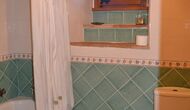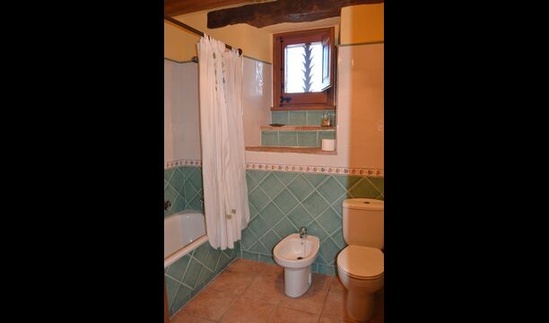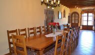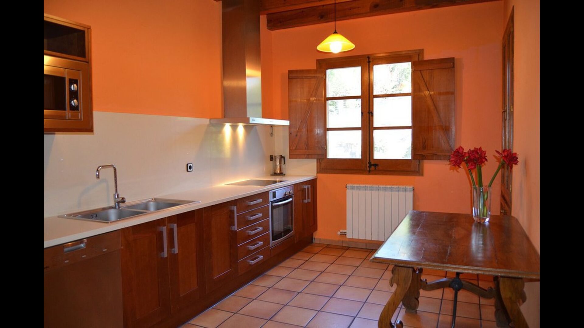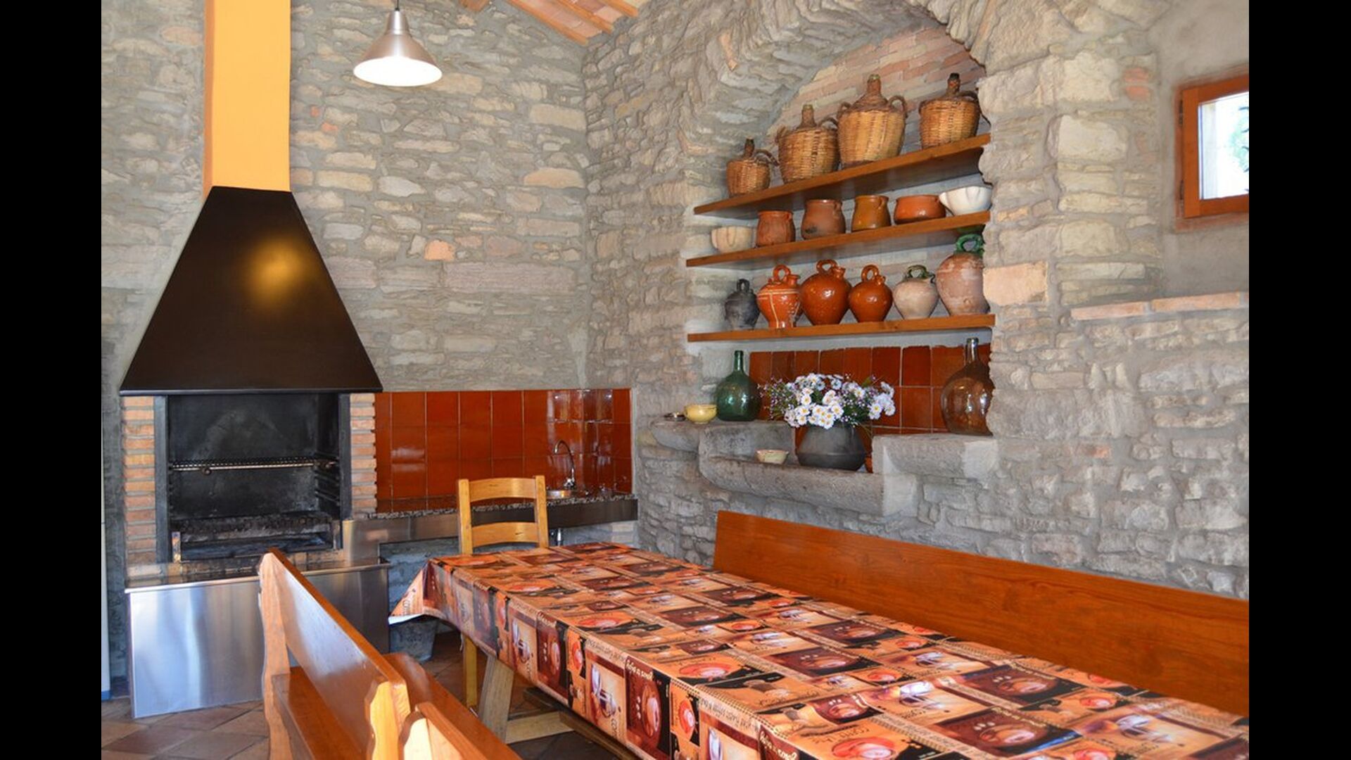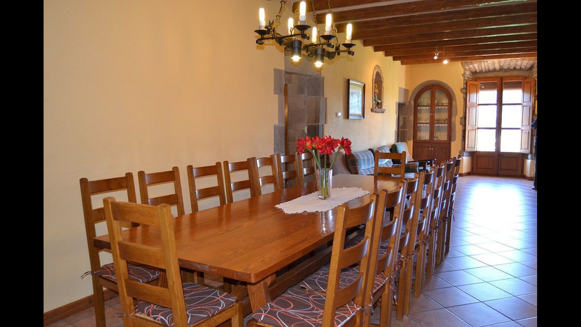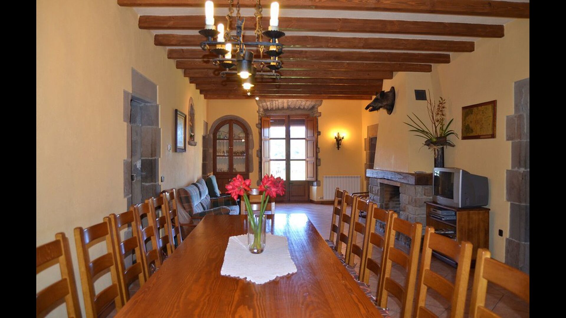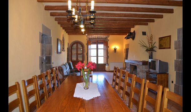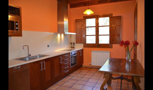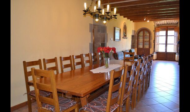 Unten gibt es einen Essbereich mit einem langen Katalanischen Holztisch In diesem Raum gibt es viele kleine und authentische Dekorationen. Außerdem gibt es eine Lounge, wo Sie mit TV und offenem Kamin entspannen können. Als Erweiterung des Speisesaals befindet sich die moderne Küche. Neben anderen Utensilien gibt es eine Spülmaschine, eine Mikrowelle, einen Kühlschrank, einen Gefrierschrank und einen Herd. Neben der Küche befindet sich ein Doppelzimmer. Schließlich gibt es auch ein Bad hier im Erdgeschoss.