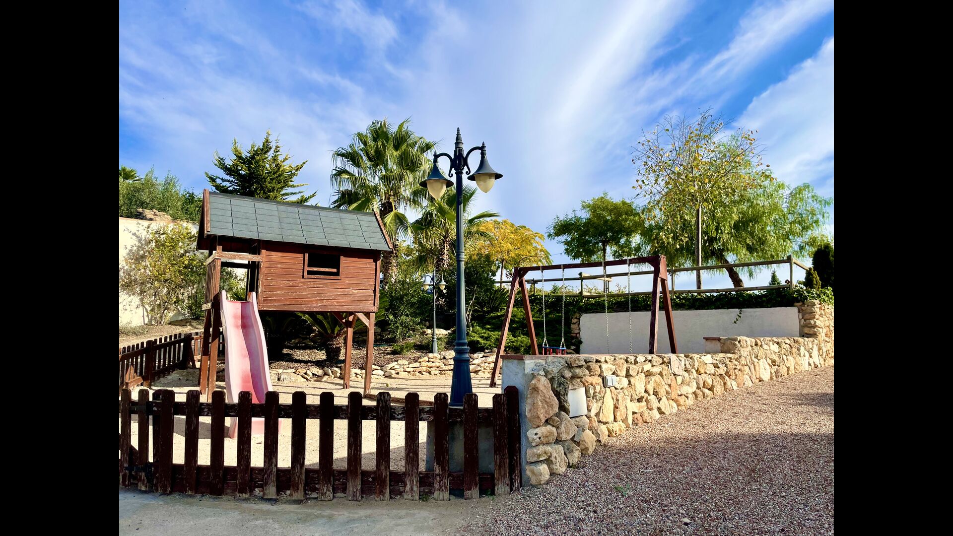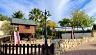 Auf dem Grundstück des Ferienhauses gibt es einen modernen und spannenden Spielplatz mit einem Baumhaus mit Rutsche und zwei Schaukeln für die kleinen Kinder