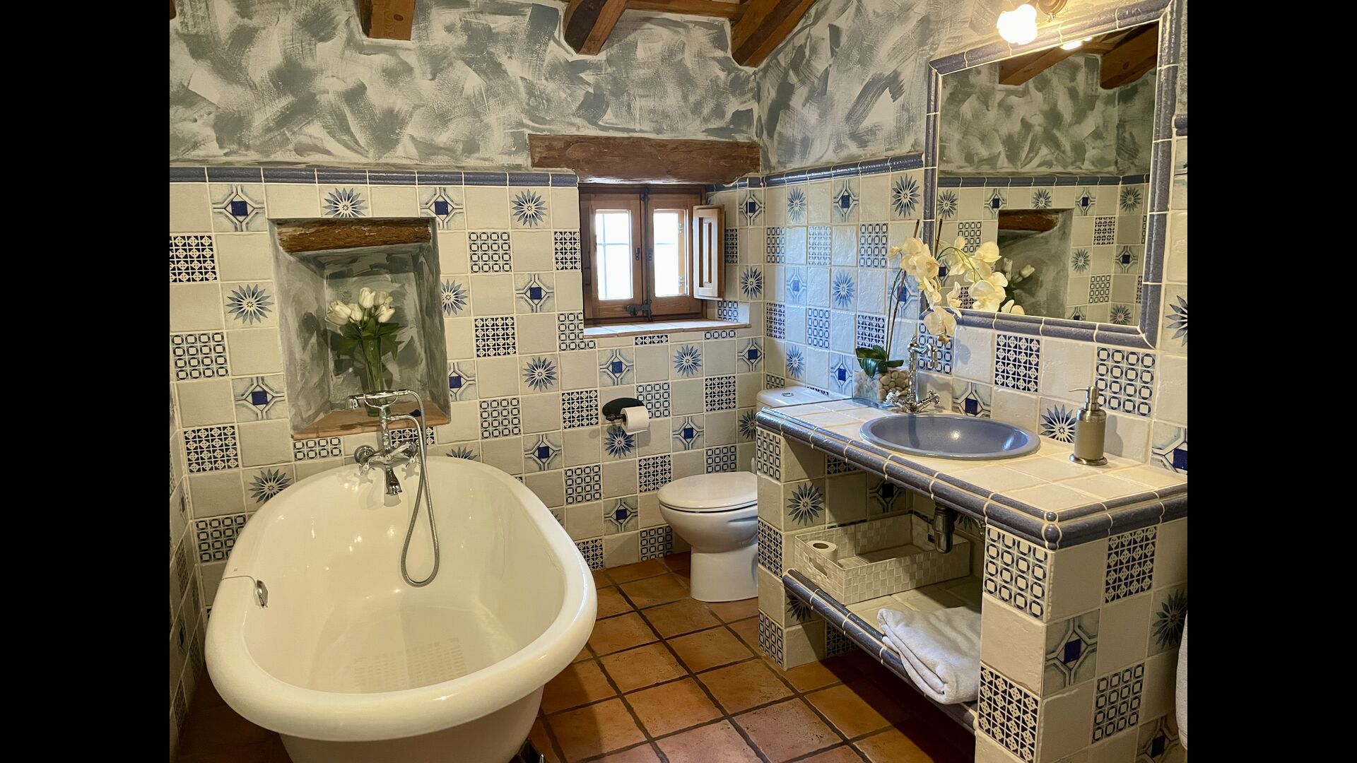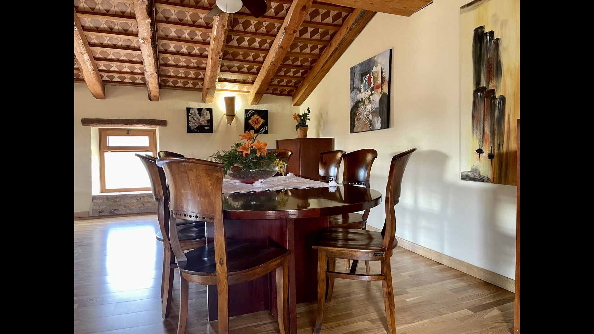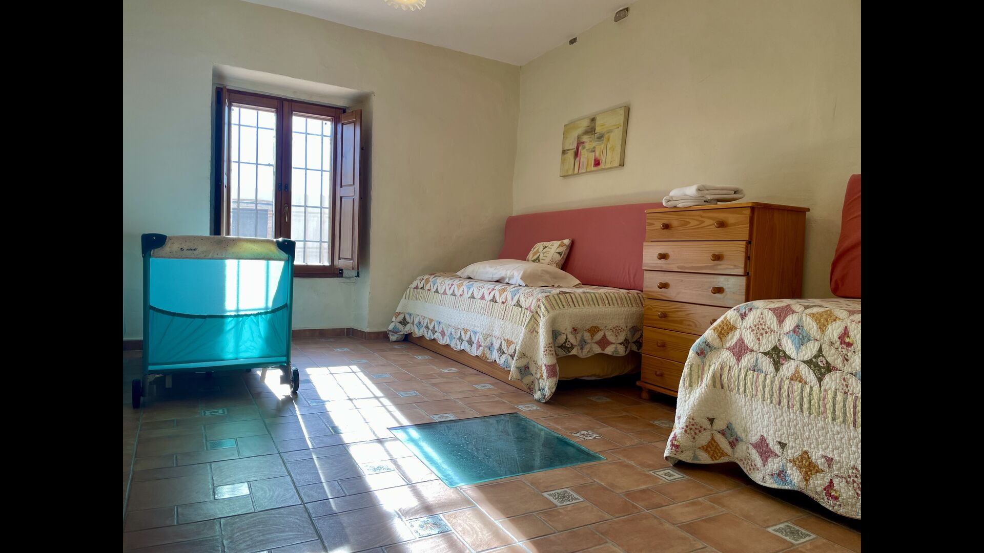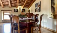 Im ersten Stock befinden sich die 5 Schlafzimmer, die alle wunderschön eingerichtet sind. Jedes Zimmer verfügt über ein eigenes Bad, das in den gleichen Farben wie das angrenzende Schlafzimmer dekoriert ist. Auf dieser Etage finden Sie auch den Essbereich und die Küche. Auf dem Dachboden gibt es einen Loungebereich mit einer hervorragenden Aussicht und einen großen Tisch, der als Indoor-Spielzimmer genutzt werden kann, falls die warmen Sommertage etwas zu heiß werden.