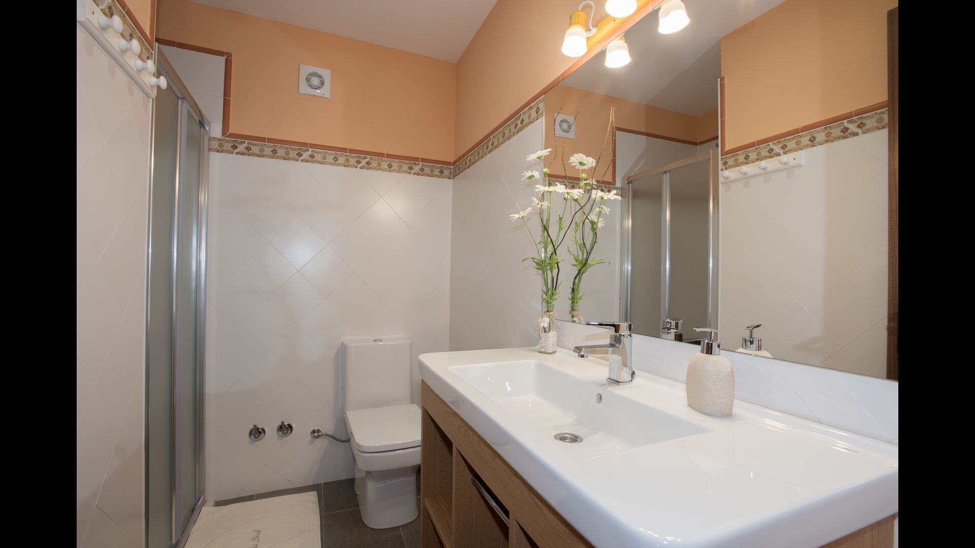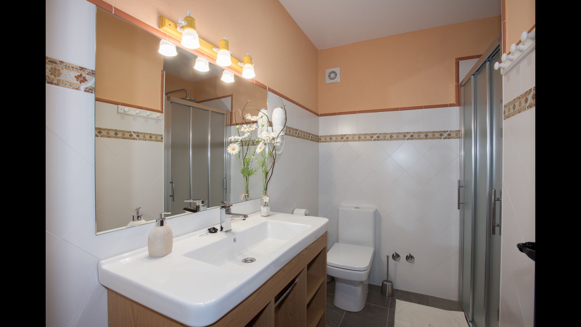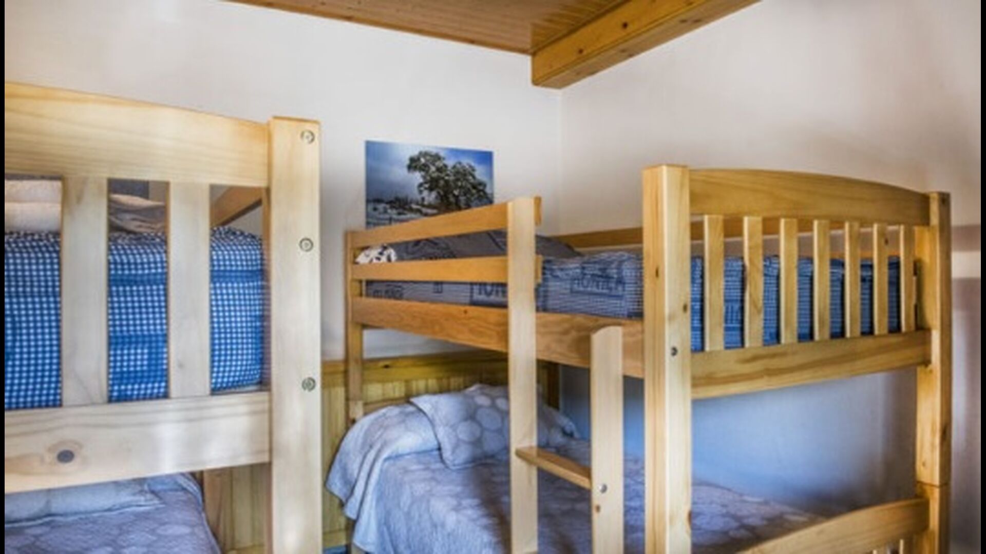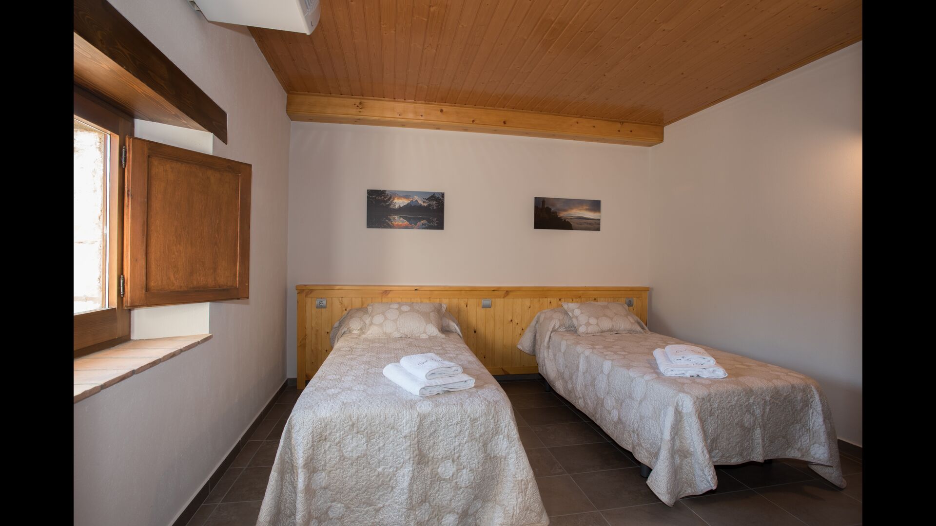 Im Obergeschoss befinden sich die weiteren 4 Schlafzimmer, die für 3 Familien ausgestattet sind, da es 2 Dreibettzimmer und 1 Doppelzimmer gibt, und schließlich wurde das vierte Schlafzimmer in ein Kinderzimmer mit zwei Etagenbetten umgewandelt. Es gibt auch zwei Badezimmer auf dieser Etage, also insgesamt drei. Da es einem etwas heiß wird, gibt es in diesem Raum eine Klimaanlage.