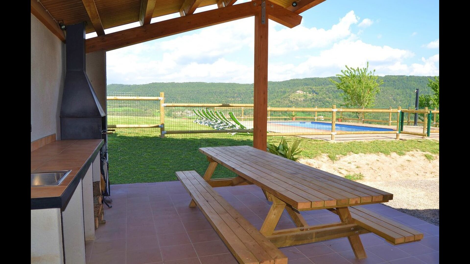 Can Pont Salta ist ein 450m2 wirklich schöne Ferienhaus mit einer einzigartigen Lage auf einem Hügel mit herrlichem Blick über din schönen Merles Tal. Vom Garten aus haben Sie einen herrlichen Blick auf das kleine Dorf Santa Maria de Merles, das sich 1,5 km. von der Ferienwohnung befindet und das Haus hat einen kleinen und schönen Pfad nach dem Dorf. Das Haus ist komplett renoviert und ist heute ganz hervorragend. Der Außenbereich ist wirklich groß und komplett privat und der Poolbereich ist perfekt positioniert, mit Blick auf dem Tal. Im Zusammenhang mit dem Pool-Bereich, ist eine überdachte Terrasse mit BBQ und Sommerküche. Weiter gibt es ein Spielzimmer mit Tischtennis und Tischfußball . Dass Der Swimming-Pool in der Nähe von der überdachten Terrasse liegt, ist in der Regel eine gute Idee für ein Ferienhaus, damit man sich zum Schatten auf der Terrasse zurückziehen kann und immer noch in der Nähe von spielenden Kindern im Schwimmbad sein. Wenn Sie es vorziehen, die Sonne zu genießen gibt es Strandliegen für jeden in Can Pont Salta. Im Garten gibt es auch einen kleinen Spielplatz für die Kleinen in der Gruppe.