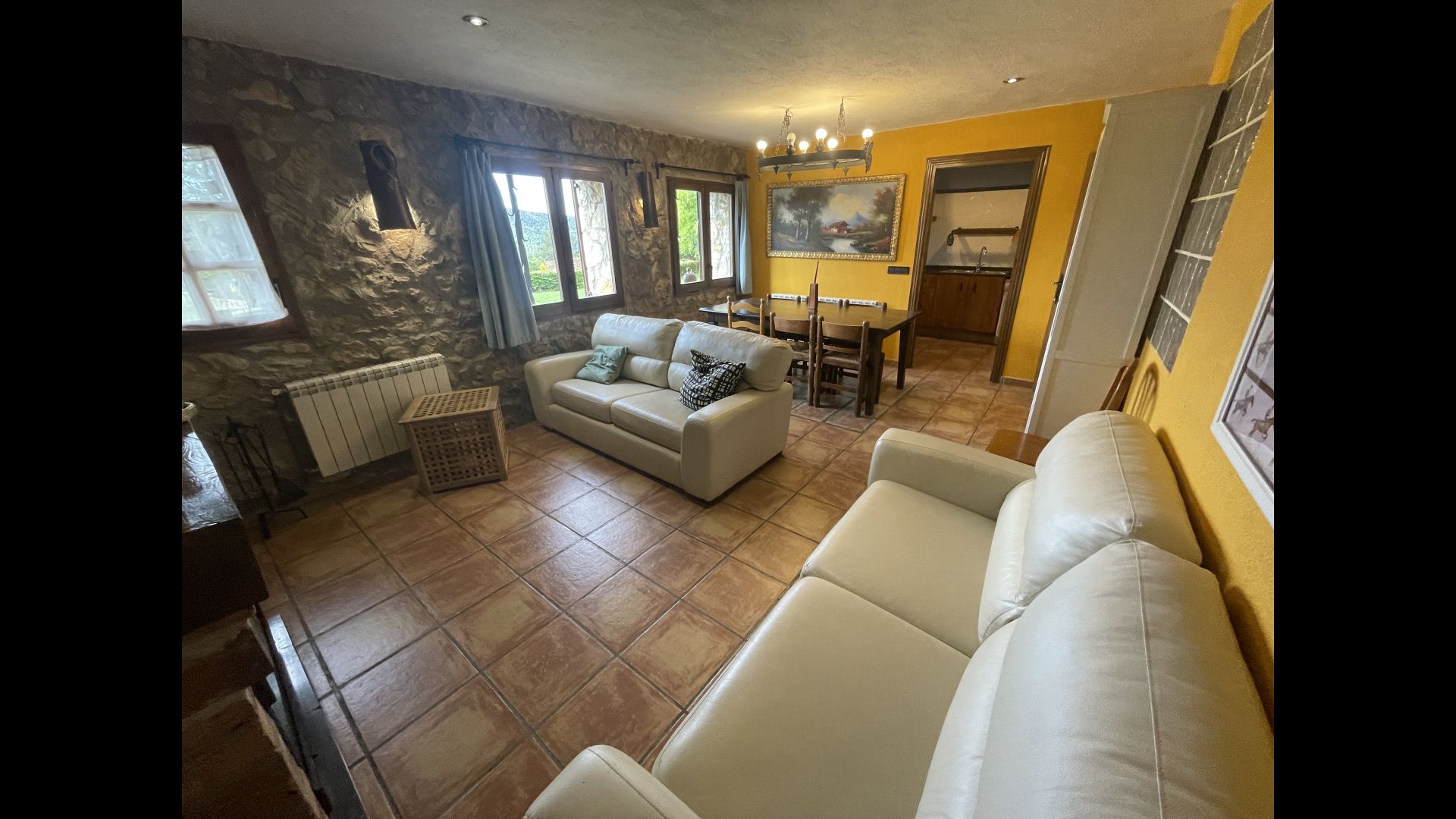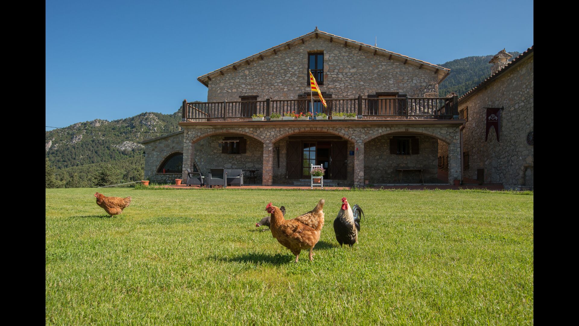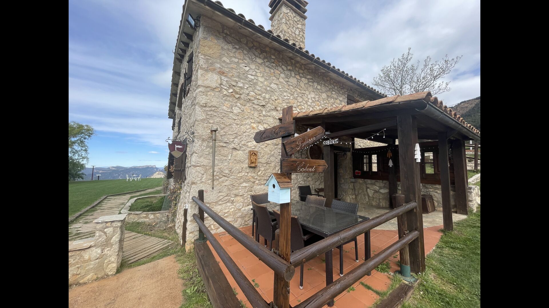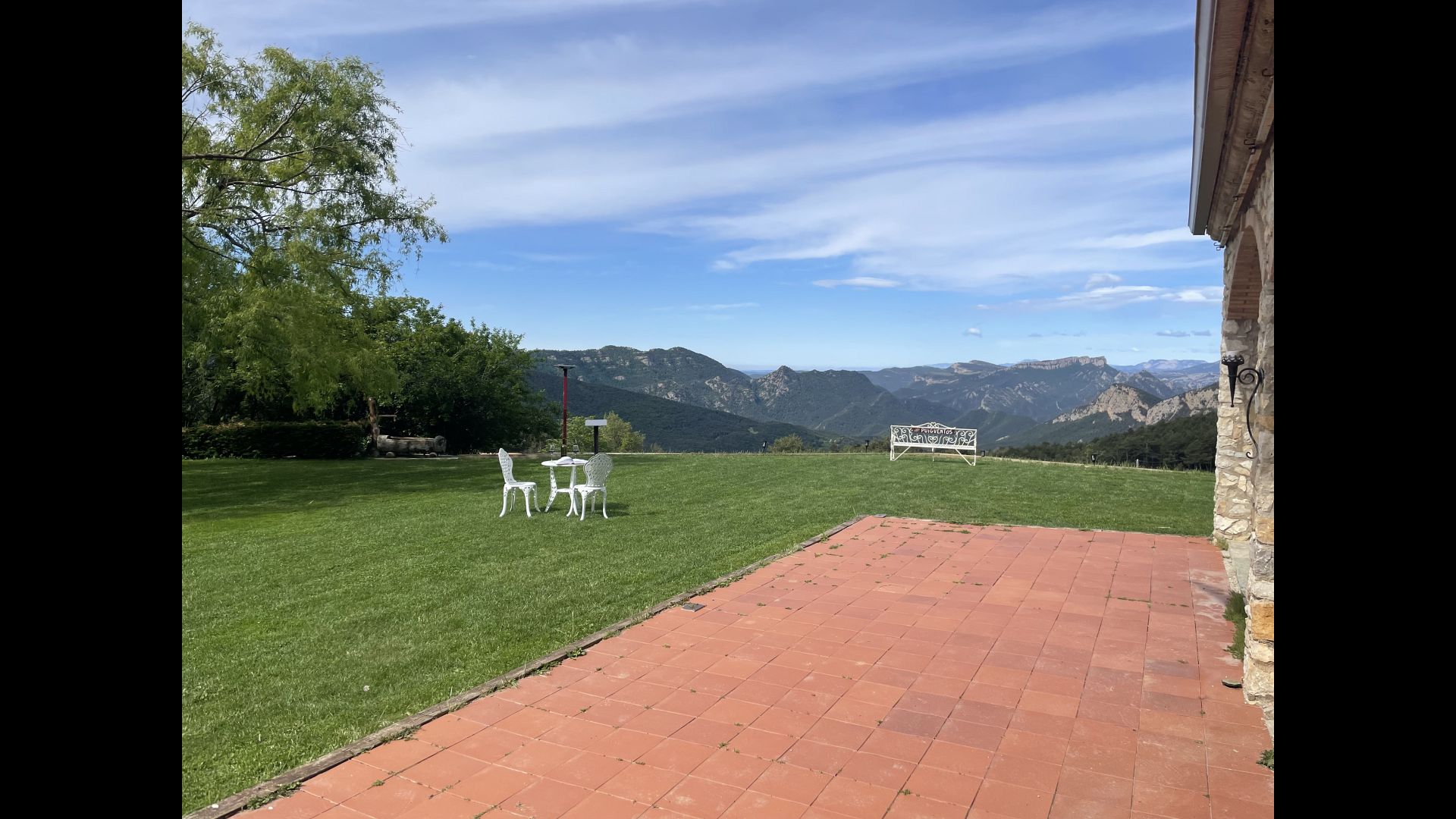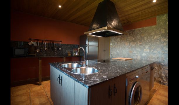Die große Wohnung „Casa Grande“ im Haupthaus und verfügt über eine große Terrasse mit Blick auf das Grundstück und mit den Pyrenäen im Hintergrund. Diese Wohnung verfügt über vier Doppelzimmer, drei davon mit Doppelbetten, sowie ein Vierbettzimmer mit vier Einzelbetten. Der erste Teil der Wohnung ist aufgeteilt in ein Wohnzimmer mit Ausblick, ein sehr authentisches Esszimmer und einegroße Küche unter anderem mit einem Geschirrspüler und einer Waschmaschine.