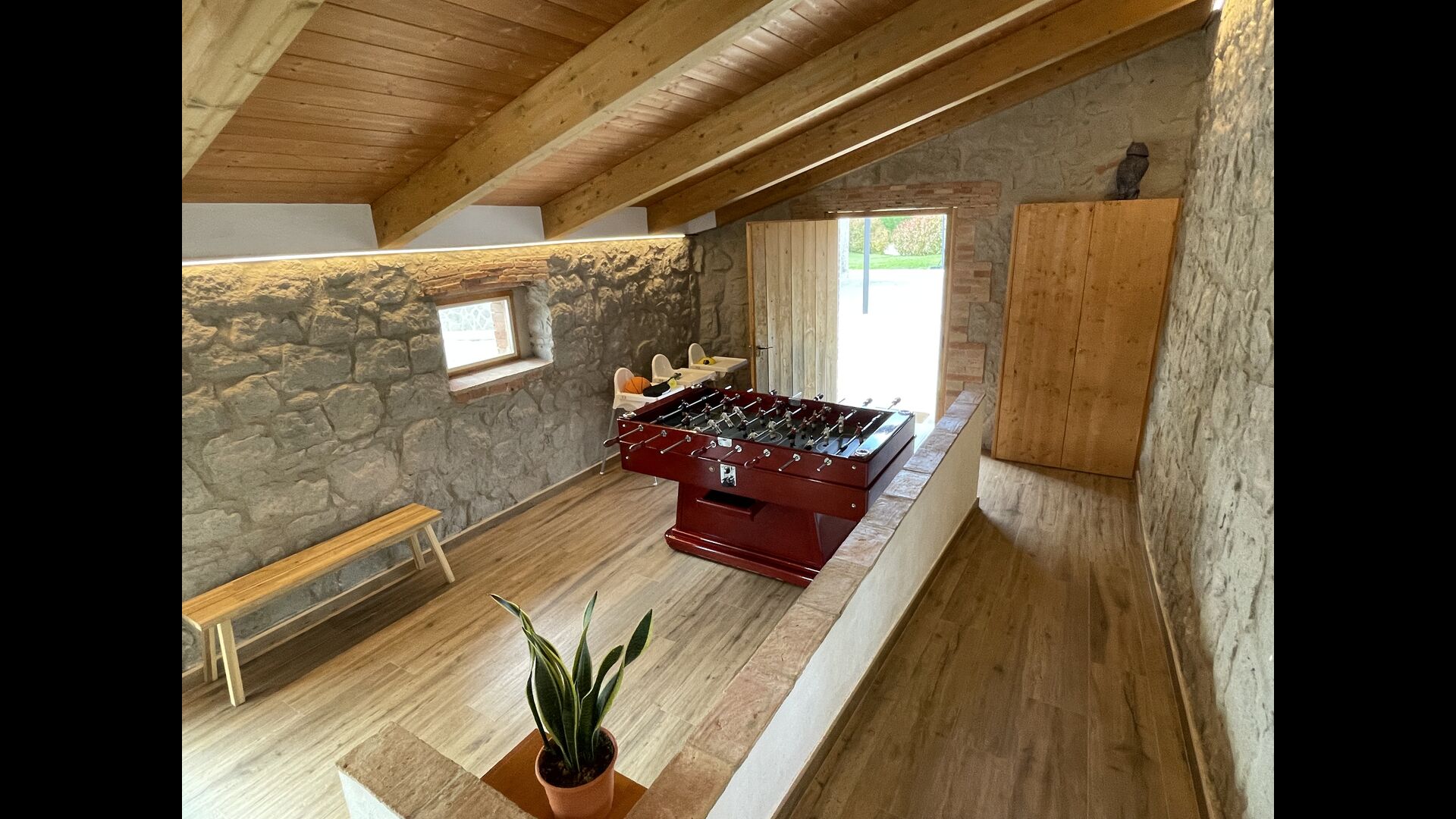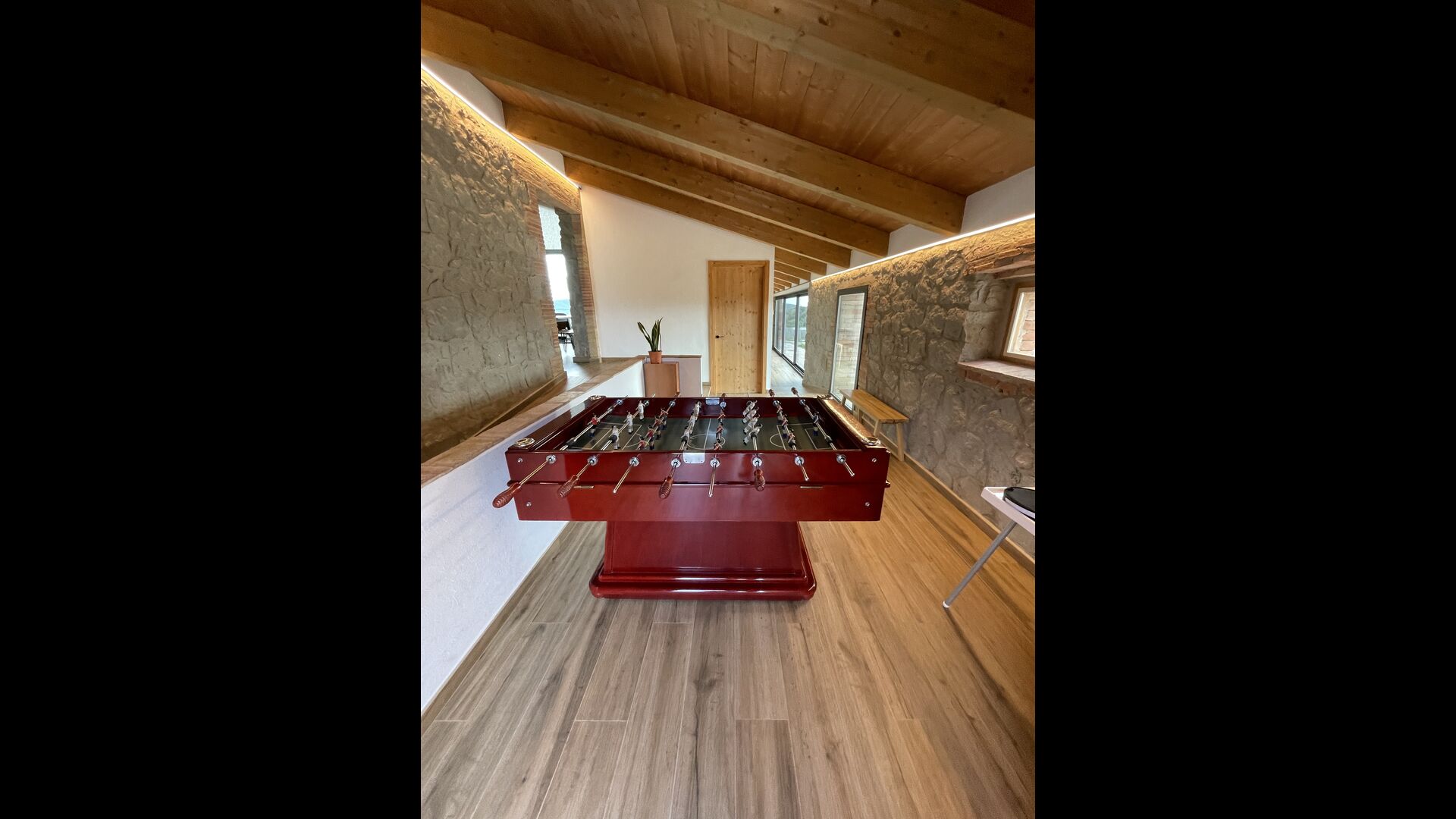 Casa Salvet ist eine erstklassige, schöne, geräumige und aktivitätsreiche katalanische Ferienimmobilie von höchster Qualität /strong>. Das Anwesen bietet Platz für bis zu 30 Personen und besteht aus einem wunderschönen, renovierten Haus, das seinen klassischen Charme bewahrt hat, aber gleichzeitig bis zum Rand mit Einrichtungen und Einrichtungen ausgestattet ist Luxus eines modernen Ferienhauses. Neben dem Haus selbst verfügt es über einen riesigen Garten mit einem großen Schwimmbad, einem Trampolin, Tischtennis und einem Fußballplatz – ganz zu schweigen von einem erhabenen, kleineren Gebäude namens Porxo, ausgestattet mit Grillgeräten und einem hochmodernen Wohn-/Küchenbereich > mit einer Terrasse mit Blick auf den Fußballplatz; und unterhalb der Küche gibt es einen herrlichen Innenpool – auch mit freier Sicht auf das Fußballfeld draußen, sowie die umliegenden Gebiete. Neben dem Innenpoolbereich gibt es eine Lounge mit einem Flachbildfernseher.
