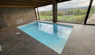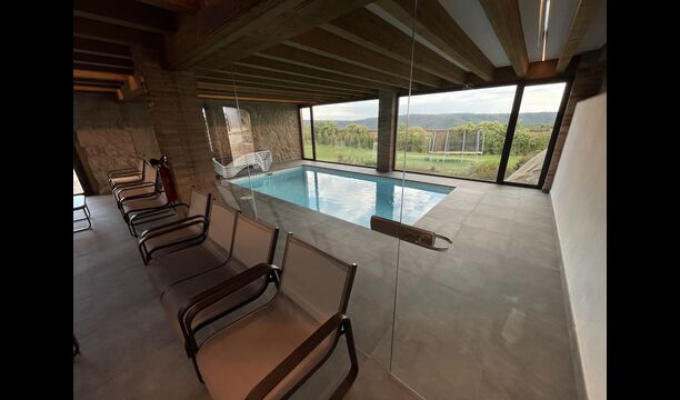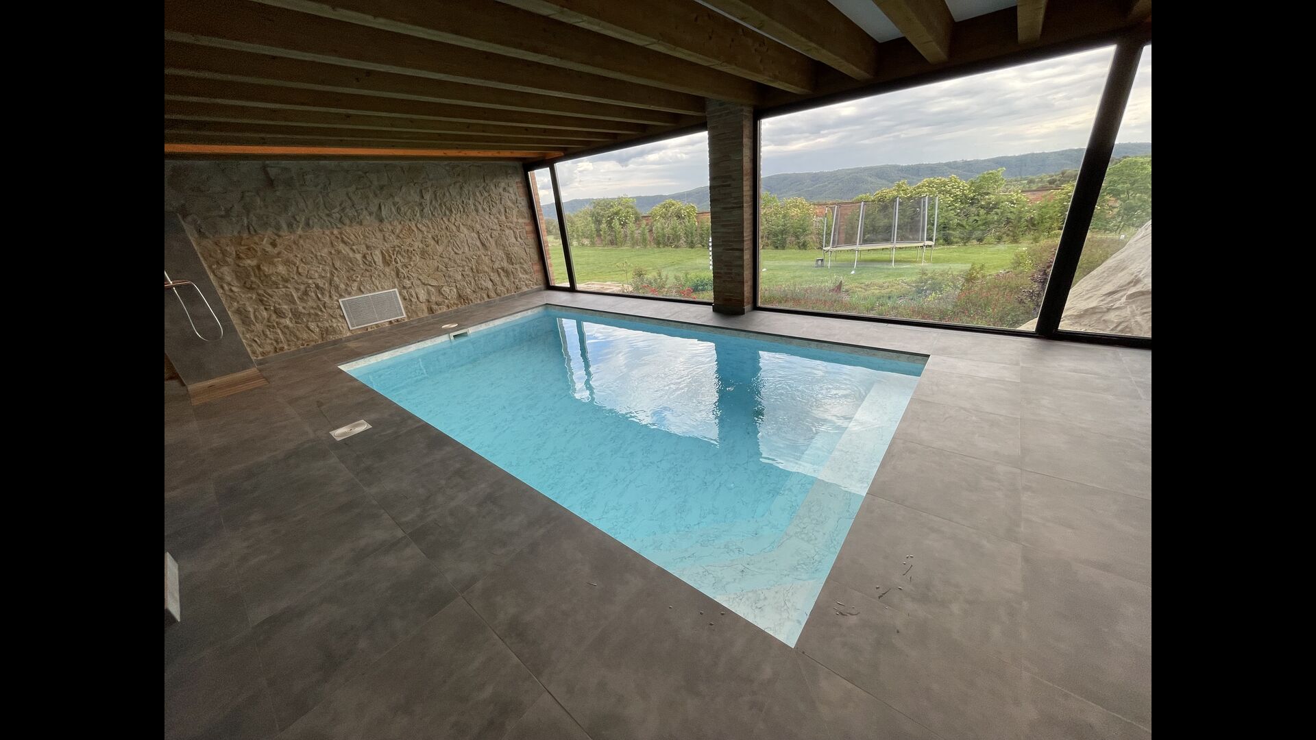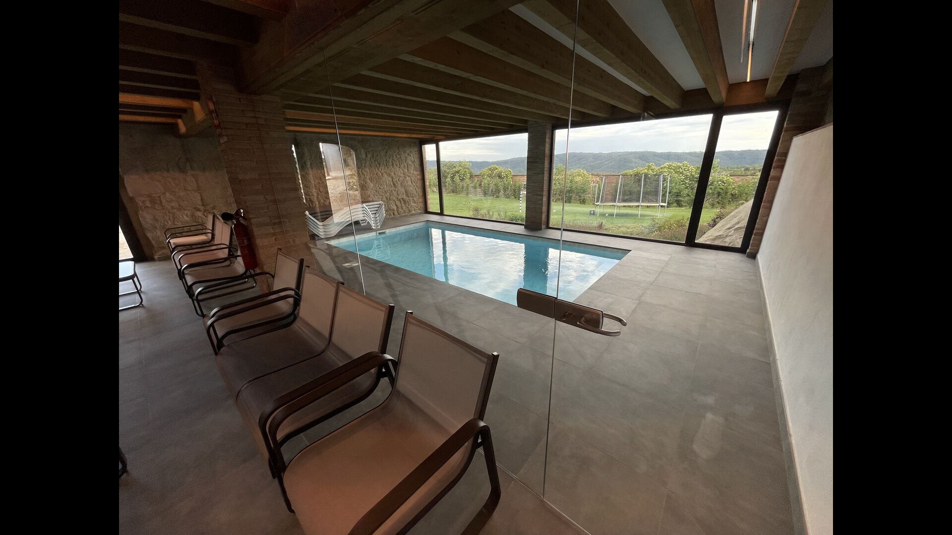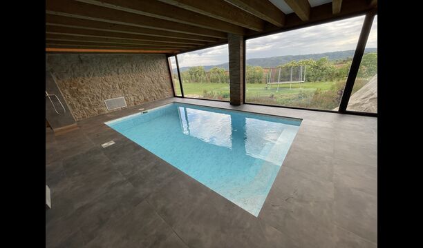 Wenn Sie die Treppe vom Erdgeschoss in den Keller hinuntergehen, gelangen Sie zu einem Wohnbereich mit mehreren Stühlen und einer Wand- montierter Flachbildfernseher. Direkt hinter der Lounge befindet sich der Innenpool – Die beiden Bereiche sind durch eine Glaswand getrennt. Der Pool ist beheizt und 6 Meter lang und 3 Meter breit. Neben dem Glas, das die Lounge vom Poolbereich trennt, gibt es im Raum auch große, vom Boden bis zur Decke reichende Fenster zum Garten des Anwesens, durch die Sie hinausschauen können Über das Fußballfeld und die wunderschöne Umgebung in der Nähe und darüber hinaus können Sie bequem im entspannenden Wasser des Pools schweifen.