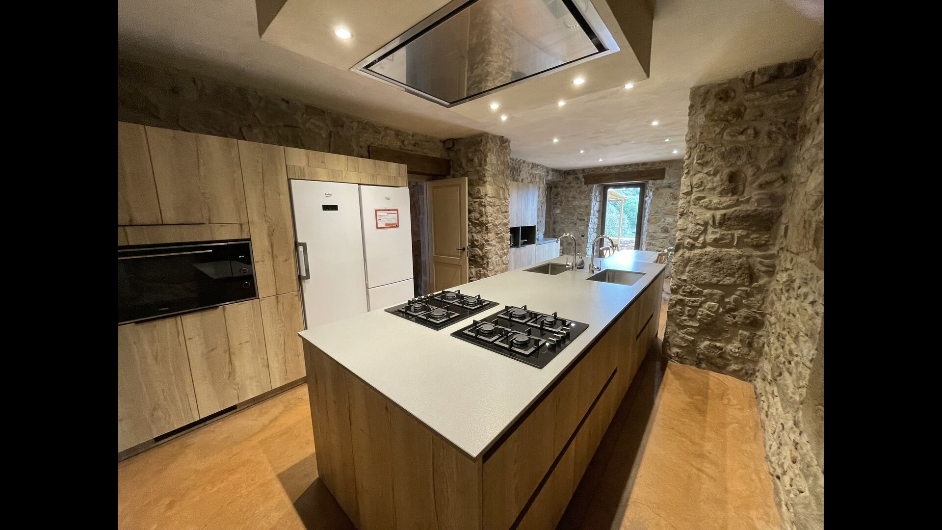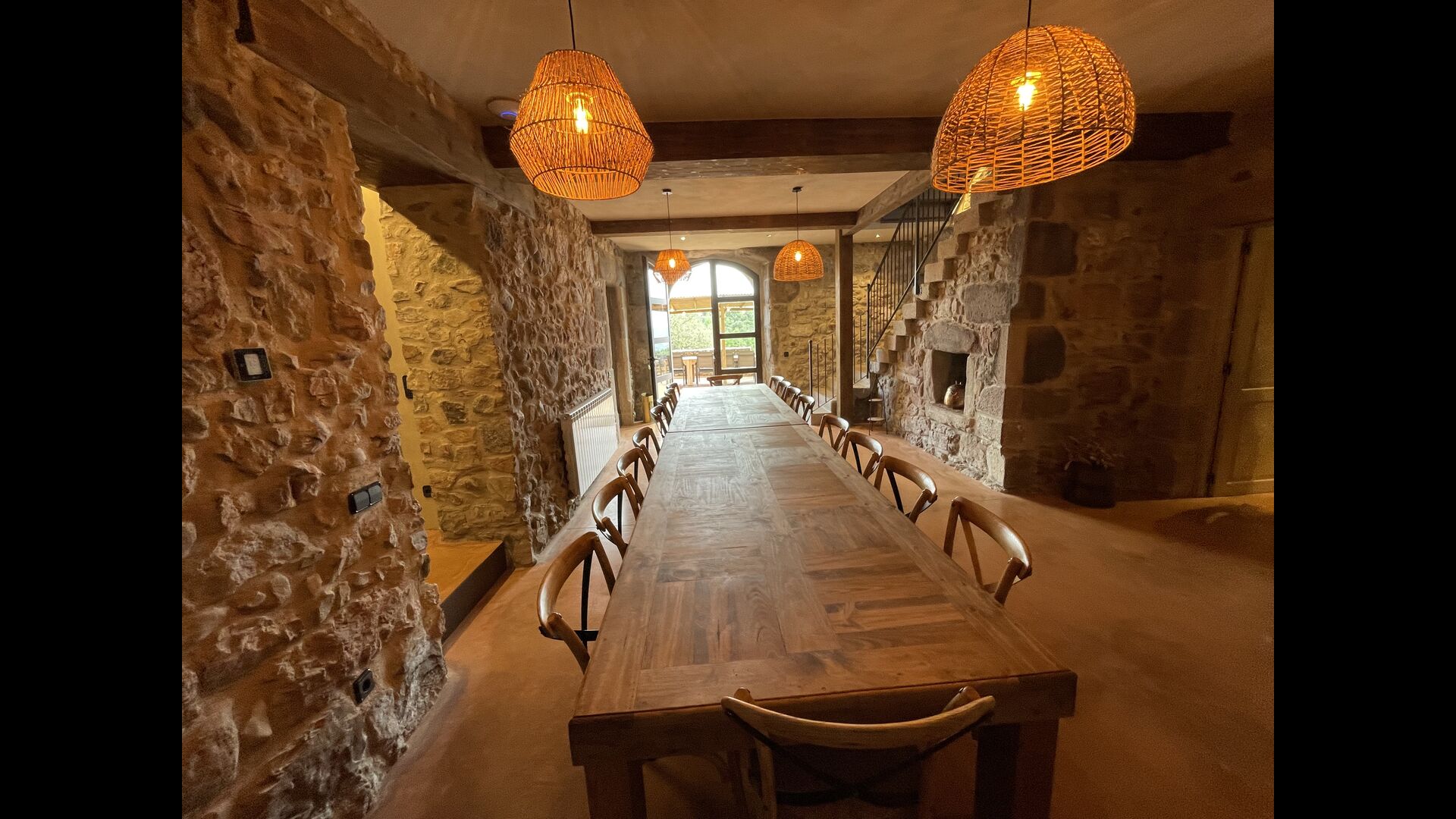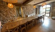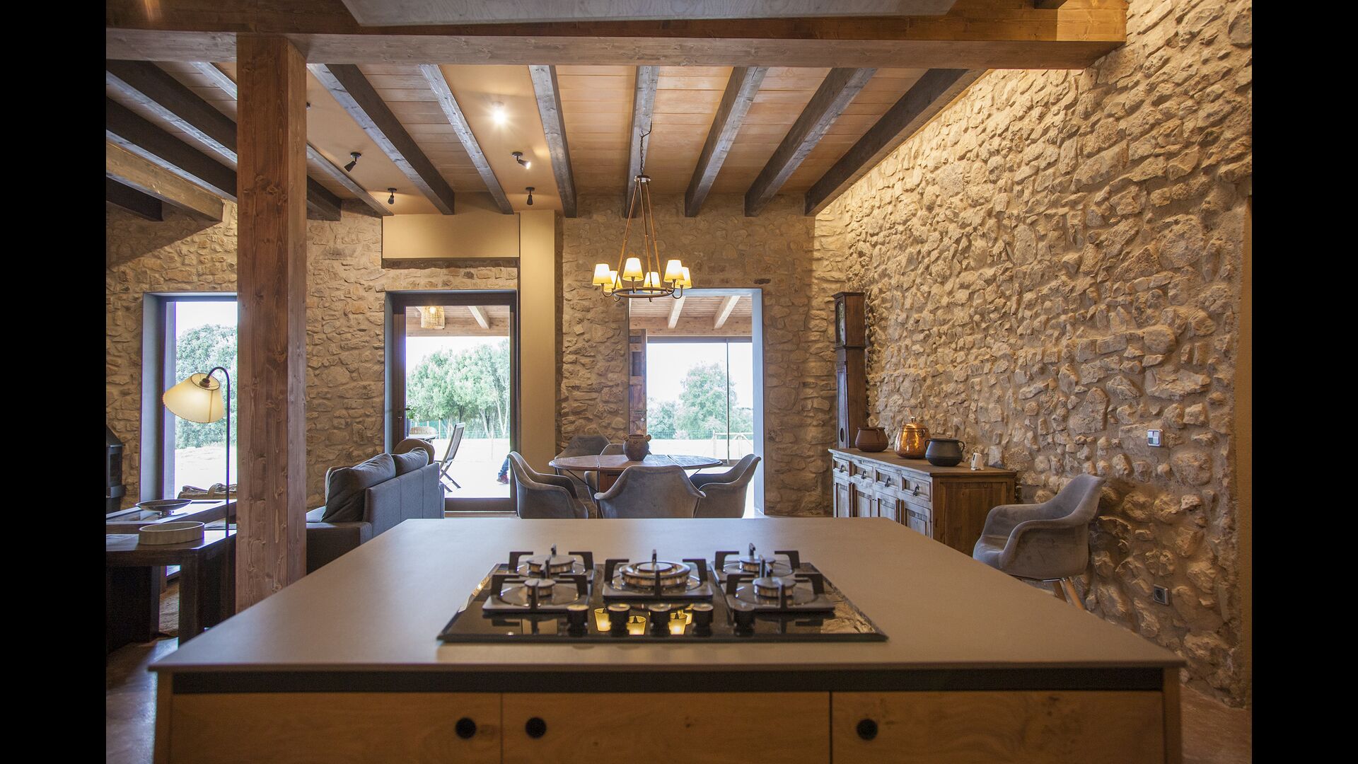 Von der Außenterrasse mit Grill, Essplatz und Liegestühlen zum Entspannen gelangen Sie direkt in den großen Speisesaal des Mas. Dieser fungiert als Herzstück des Hauses und verbindet die beiden kleinen Wohnzimmer im Erdgeschoss mit der großen Küche. Die Küche ist komplett ausgestattet mit 2 Gasherden, 2 Geschirrspülern, 2 Kühlschränken mit Gefrierfach, Backofen, Mikrowelle und Kaffeemaschine sowie einem kleinen Frühstückstisch.