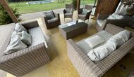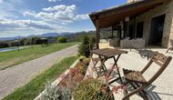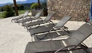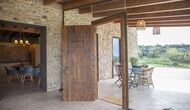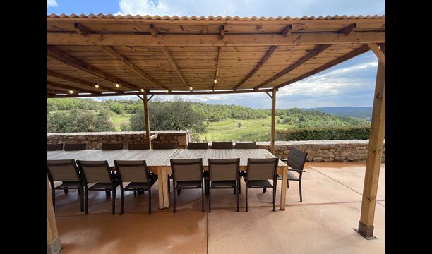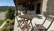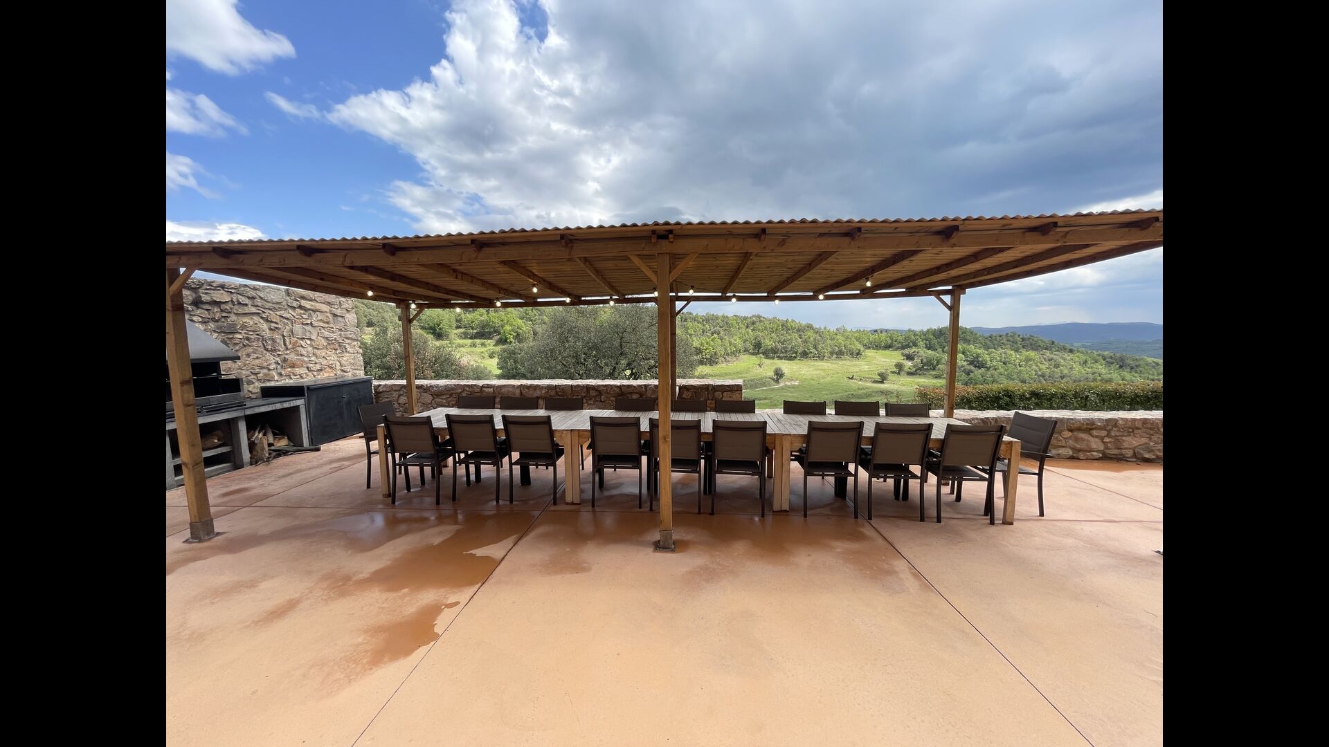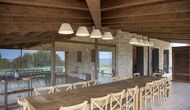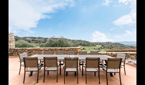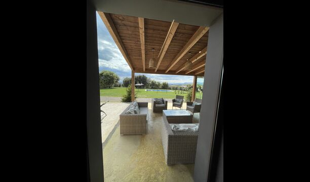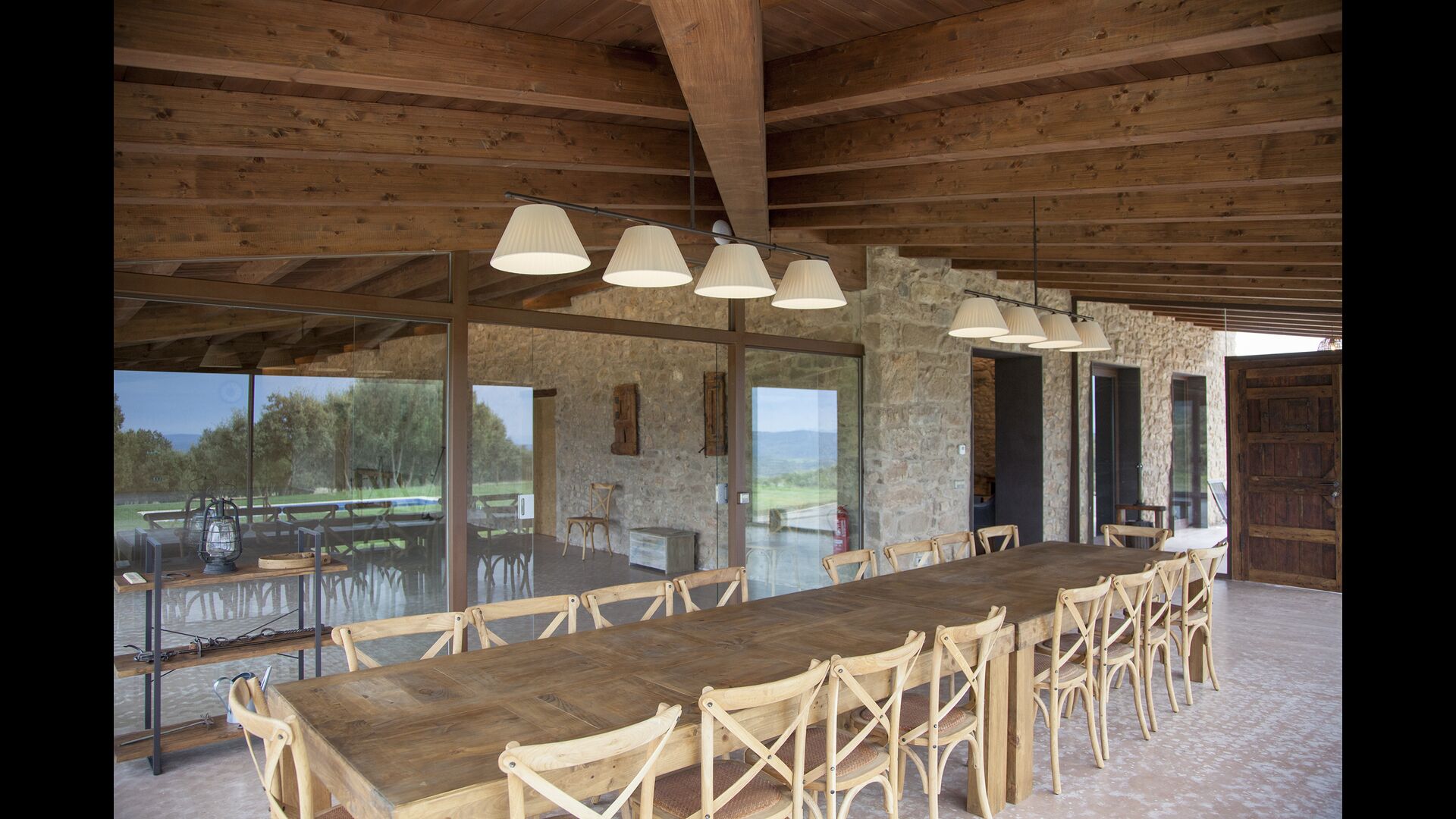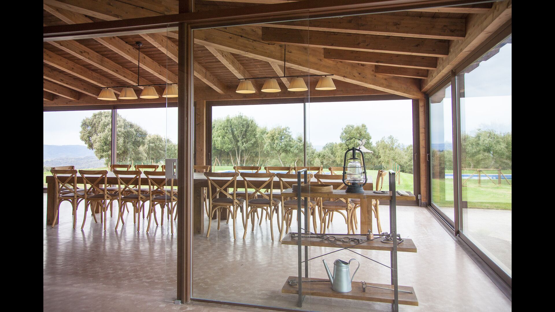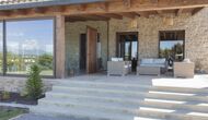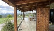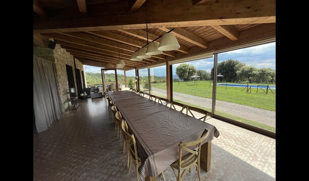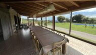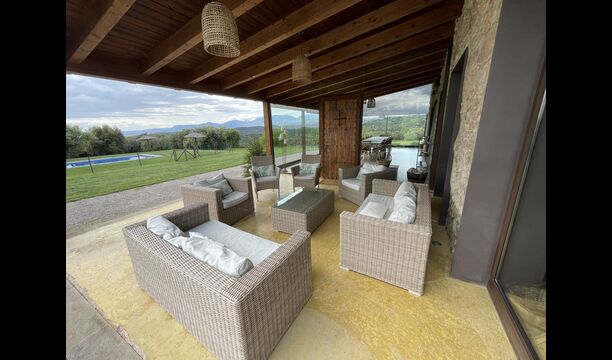Im Erdgeschoss befindet sich eine Veranda vor dem Pool und mit spektakulärem Blick auf die Berge. Von hier aus gelangen Sie in das Esszimmer, das durch die großen Fenster einen Blick auf den Garten bietet.
