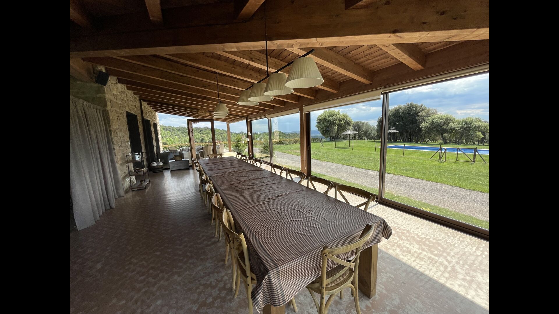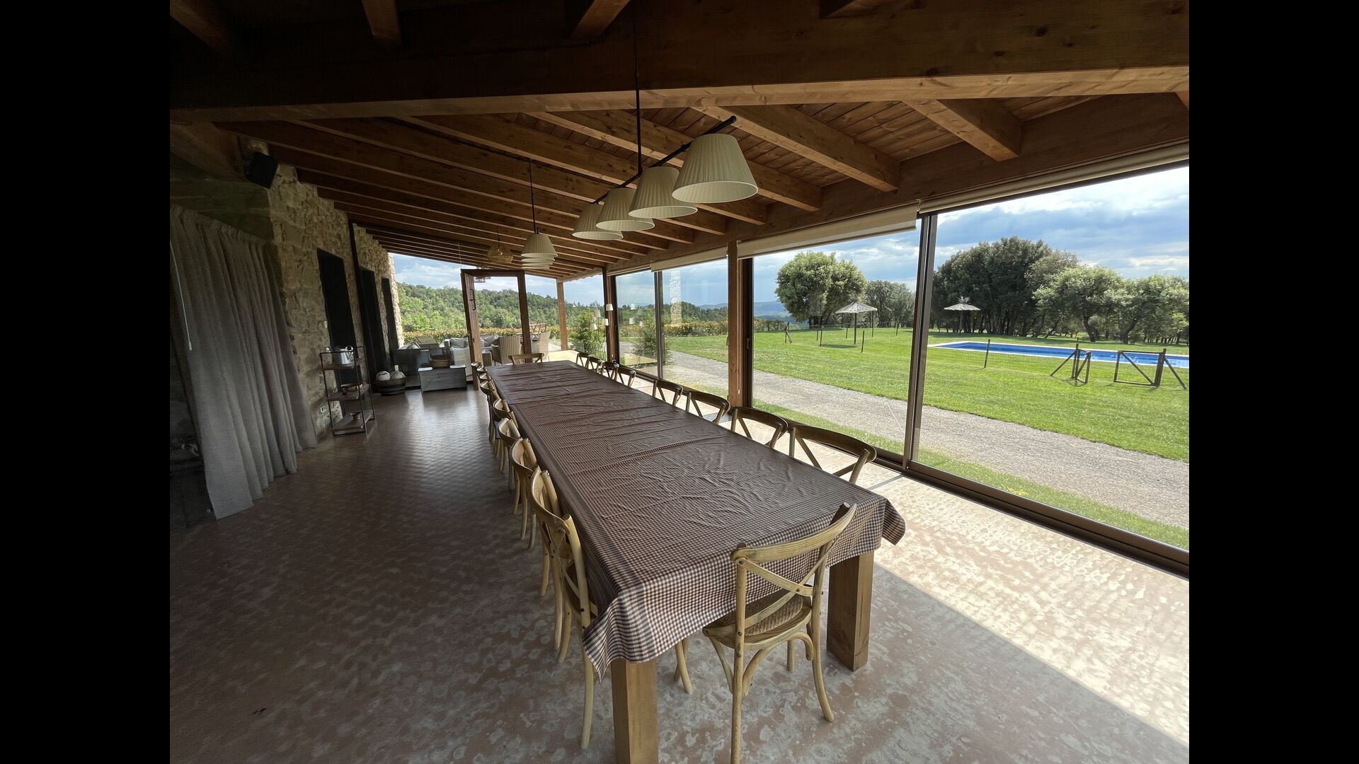 Im Erdgeschoss des Hauses betritt man einen schönen Flur. Links vom Flur befindet sich die moderne Küche mit Gefrierschrank, Backofen, Mikrowelle, Cerankochfeld, Spülmaschine, Espressomaschine und sogar einem Fassbierzapfhahn. Die Küche hat direkten Zugang zum großen Gemeinschaftsraum mit einem schönen katalanischen Refektoriumstisch (falls Sie ein oder zwei Tage im Schatten essen möchten) und einem gemütlichen Wohnzimmer. Von den Schiebetüren des Gemeinschaftsraums haben Sie direkten Zugang zur gepflasterten Terrasse. Der Grill des Hauses befindet sich etwas weiter unten im Garten. Wenn Sie von der Küche nach rechts abbiegen, treffen Sie auf den Aktivitätsraum, der wahrscheinlich der Rahmen für einige schöne Stunden, auch für Kinder in der Gruppe, sein wird. Hier gibt es Billard, Tischtennis und Darts.