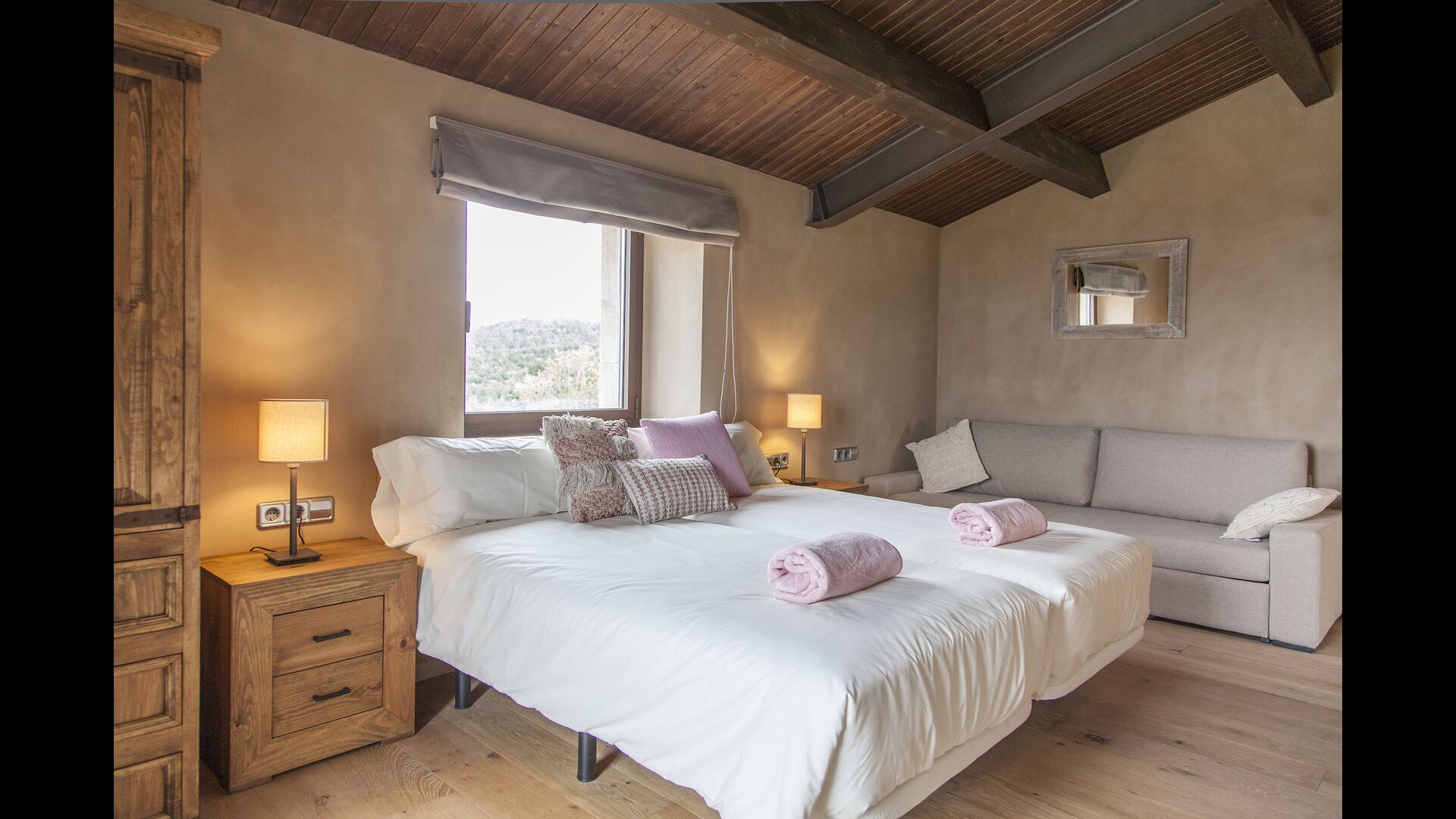 Rechts vom Flur befinden sich vier der fünf wunderschönen Schlafzimmer in Can de Mateo. Die vier Schlafzimmer sind alle Doppelzimmer, von denen drei ein Bad ensuite haben. Eines der Zimmer hat direkten Zugang zur Terrasse. Auf dieser Etage befindet sich auch ein weiteres Badezimmer, das mit dem letzten Schlafzimmer im Obergeschoss des Hauses geteilt wird.