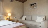 Auf der obersten Etage befindet sich ein gemütlicher Loungebereich, der sich neben dem Dreibettzimmer mit drei Einzelbetten befindet. Das Zimmer eignet sich hervorragend als Kinderzimmer und die kleine Lounge eignet sich hervorragend als Kuschelecke für Kinder am Abend.