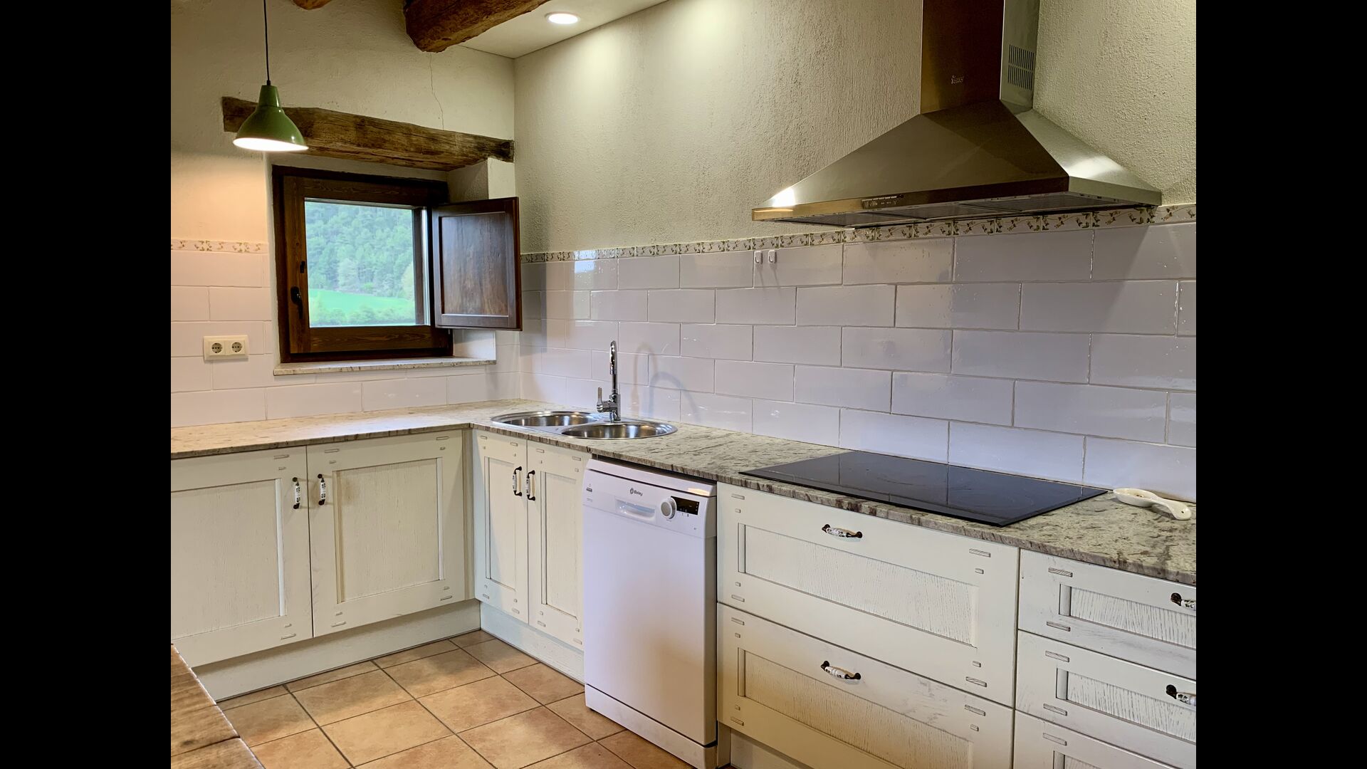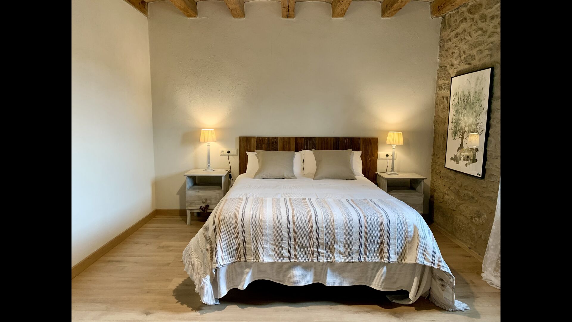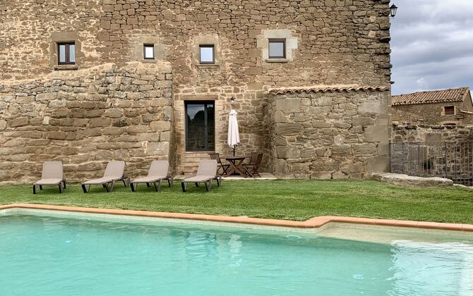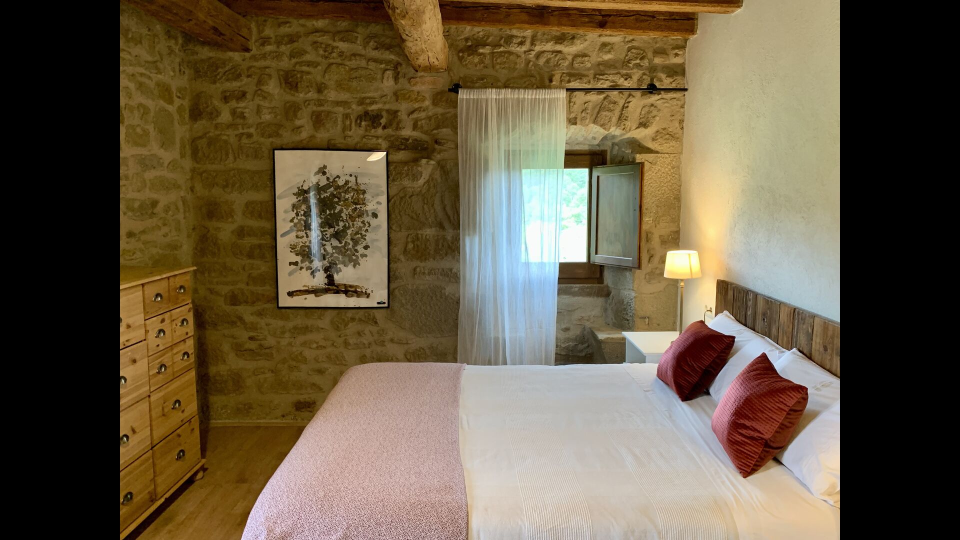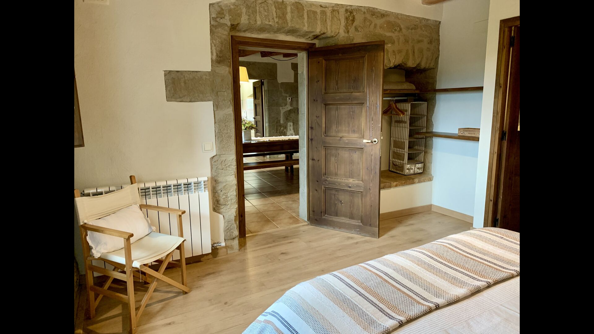 Eine kurvenreiche Schotterstraße führt durch das Grün zum schönen Kalksteinhaus, das aus einem Hauptgebäude und einem kleineren Nebengebäude besteht. Wenn Sie aus dem Auto steigen, werden Sie sofort von der wunderschönen Natur, die das Haus umgibt, beeindruckt. Der Poolbereich befindet sich vor dem Haus. Es hat einen atemberaubenden Blick auf die Täler und bequeme Sonnenliegen sind entlang des Pools aufgereiht. Wirklich der perfekte Ort, um in der katalanischen Sonne zu entspannen!