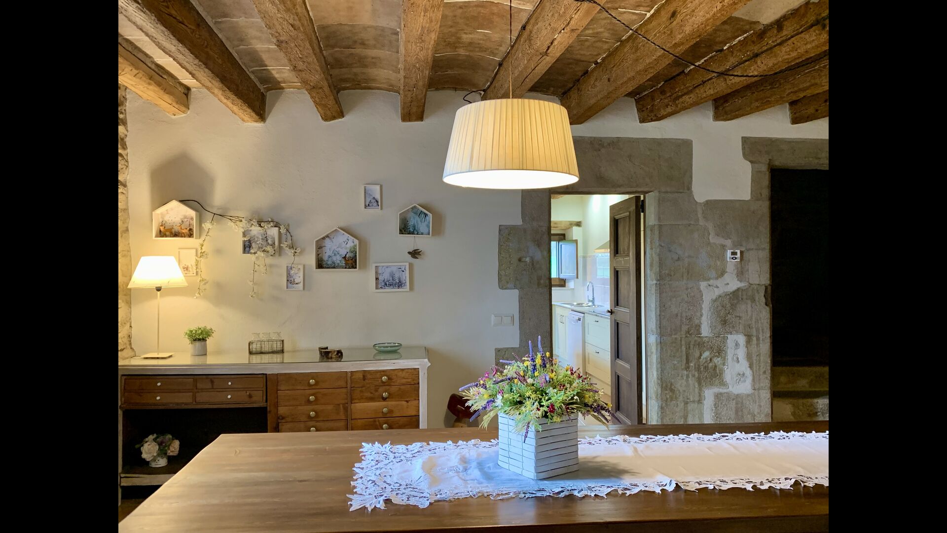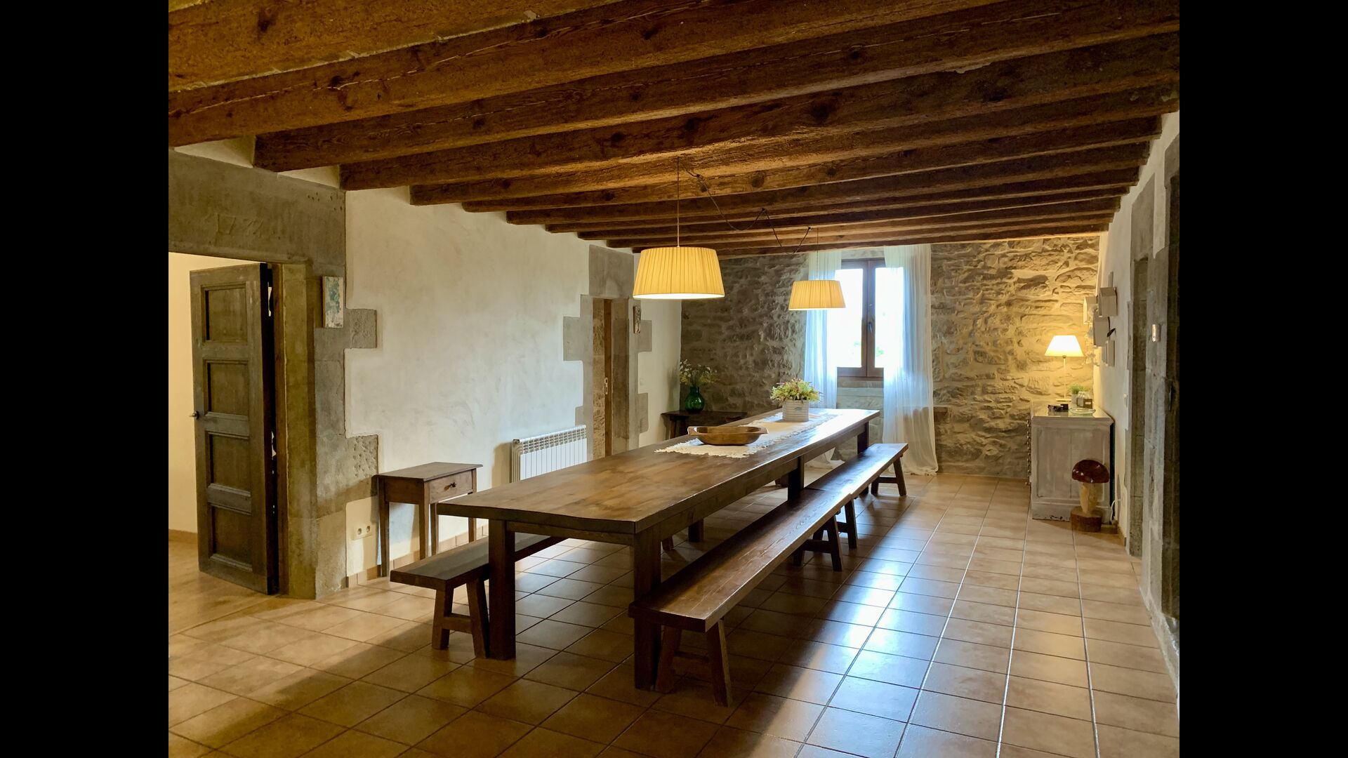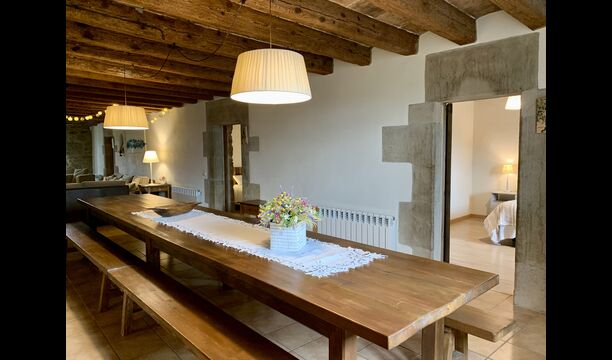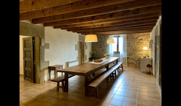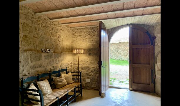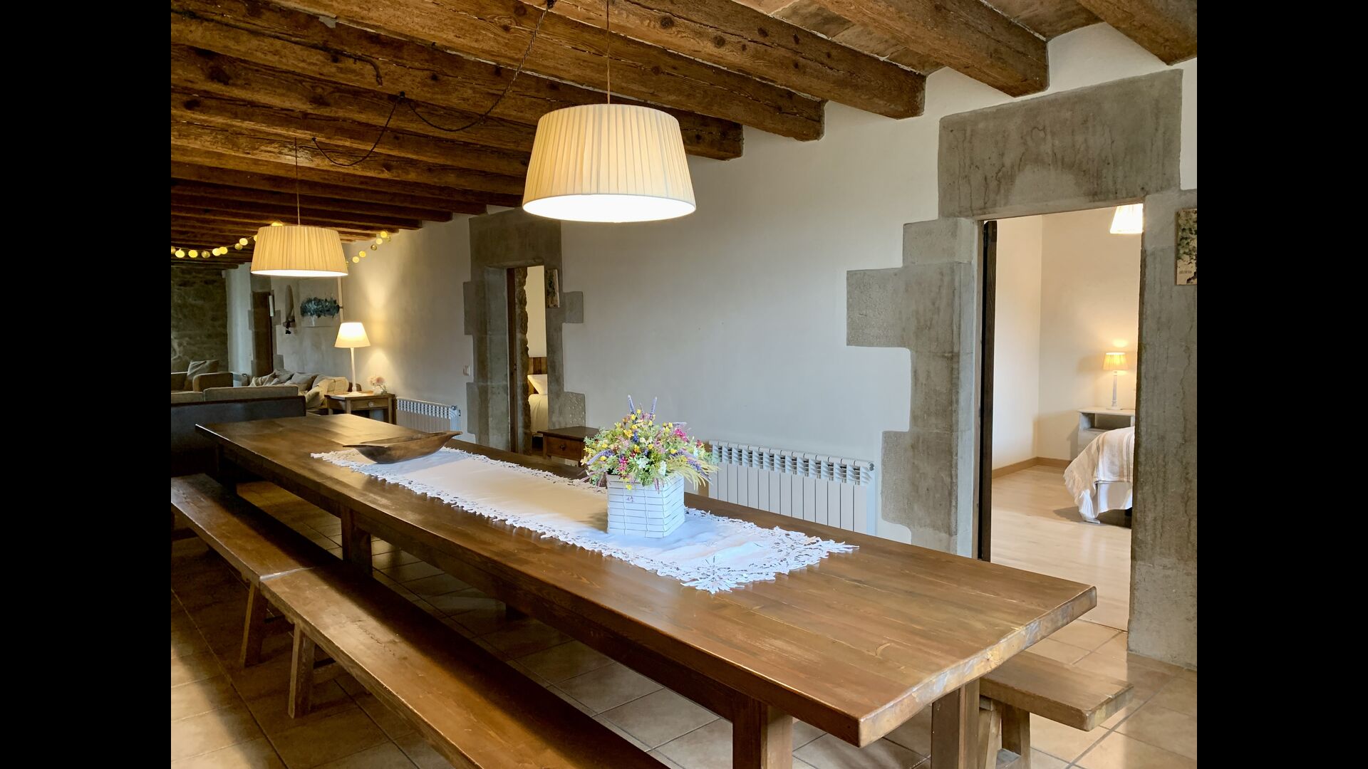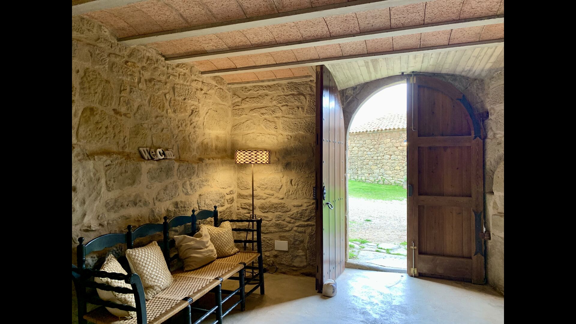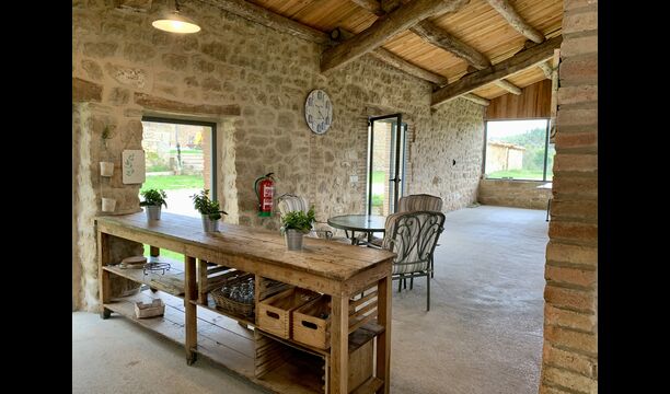 Beim Betreten des Hauptgebäudes betreten Sie eine große, einladende Halle, die von klassischer katalanischer Architektur und Design geprägt ist, wie den großen hölzernen Doppeltüren und Kalksteinwänden und -böden. Über das Treppenhaus gelangen Sie in den ersten Stock des Hauses, wo Sie das große Wohn- und Esszimmer betreten, das sich daran anschließt. Das Esszimmer verfügt über einen langen Holztisch mit Platz für die gesamte Gruppe und ist mit der voll ausgestatteten Küche verbunden, und das Wohnzimmer verfügt über gemütliche Sofas und einen Fernseher.