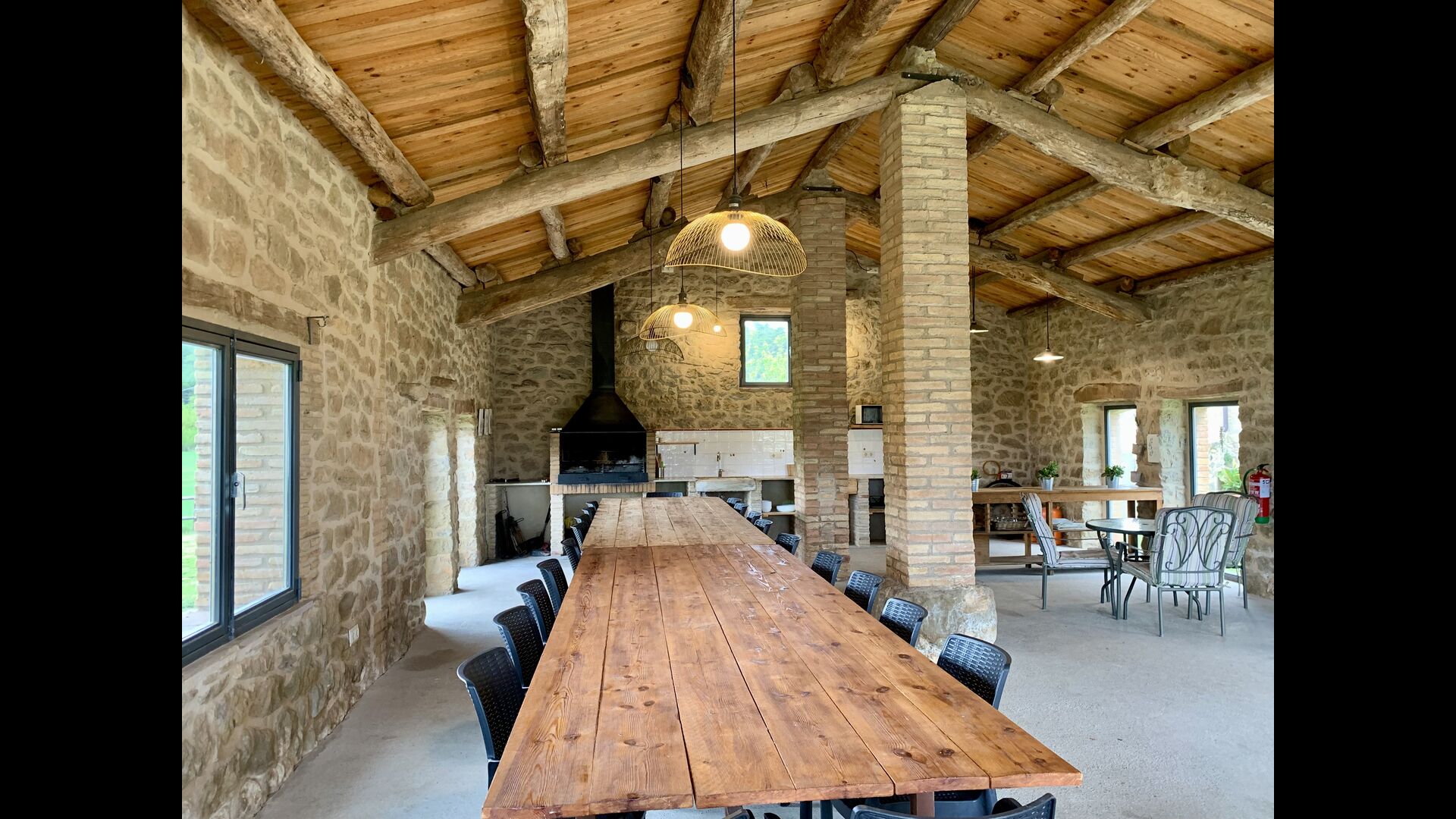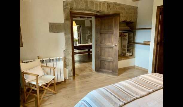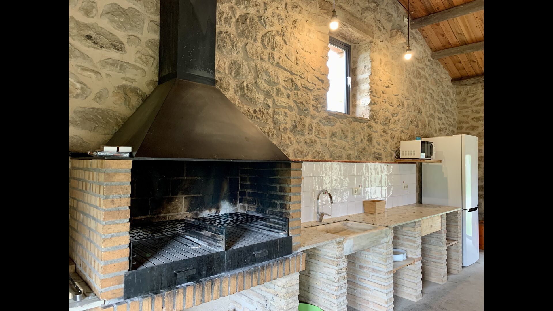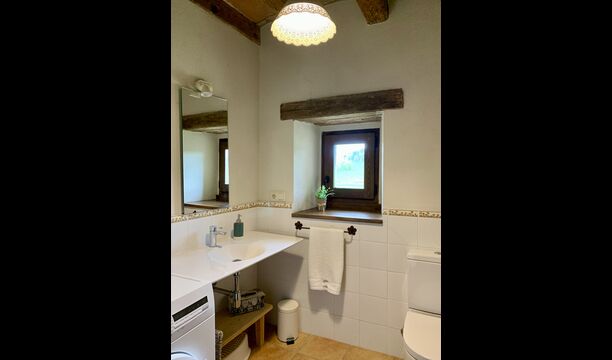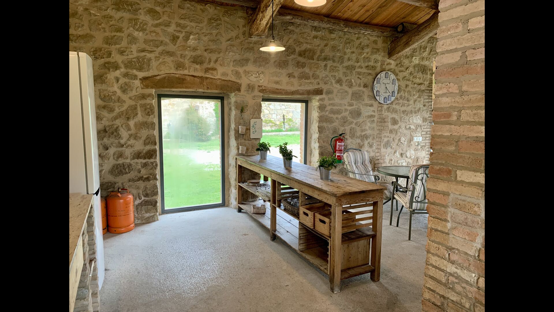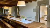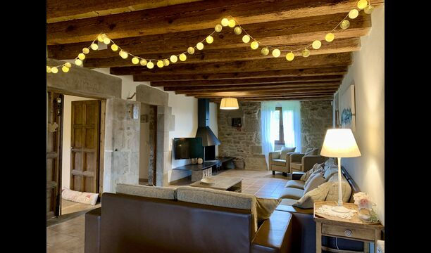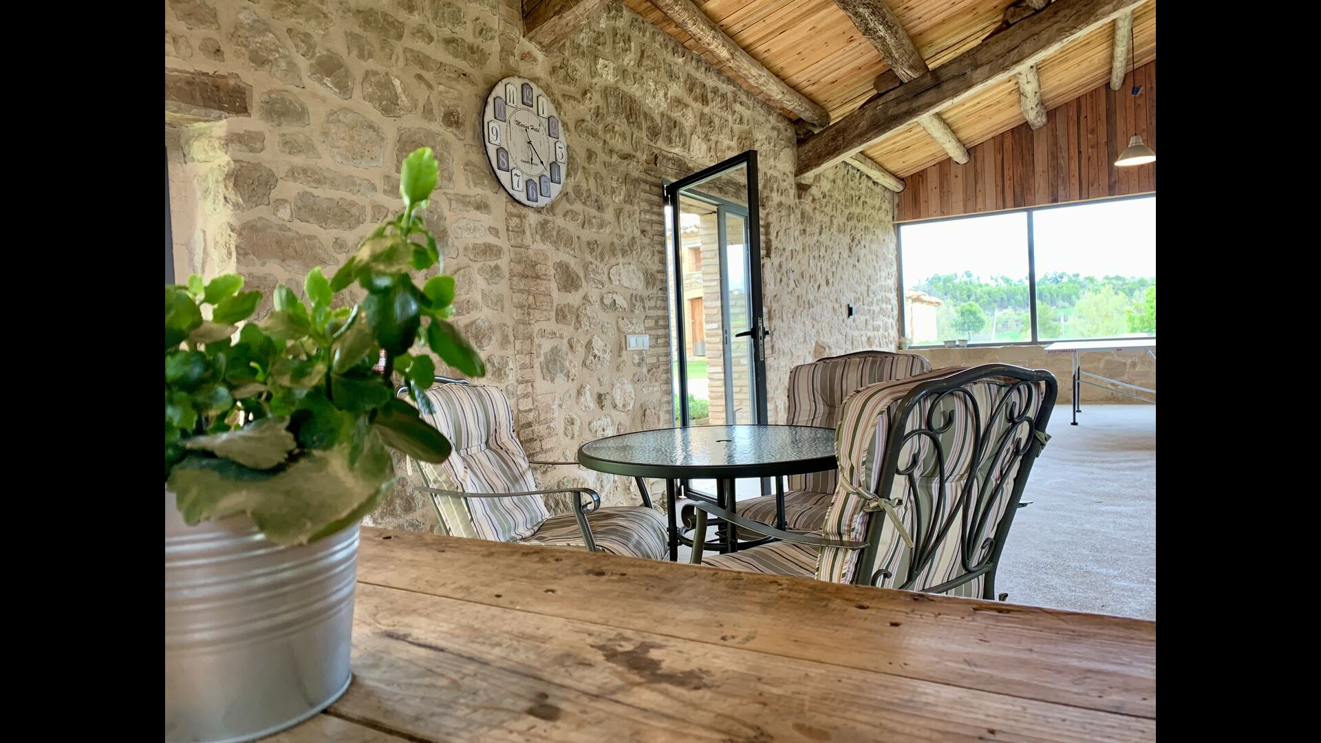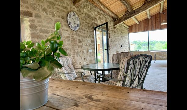Beim Betreten des Hauptgebäudes betreten Sie eine große, einladende Halle, die von klassischer katalanischer Architektur und Design geprägt ist, wie den großen hölzernen Doppeltüren und Kalksteinwänden und -böden. Über das Treppenhaus gelangen Sie in den ersten Stock des Hauses, wo Sie das große Wohn- und Esszimmer betreten, das sich daran anschließt. Das Esszimmer verfügt über einen langen Holztisch mit Platz für die gesamte Gruppe und ist mit der voll ausgestatteten Küche verbunden, und das Wohnzimmer verfügt über gemütliche Sofas und einen Fernseher.