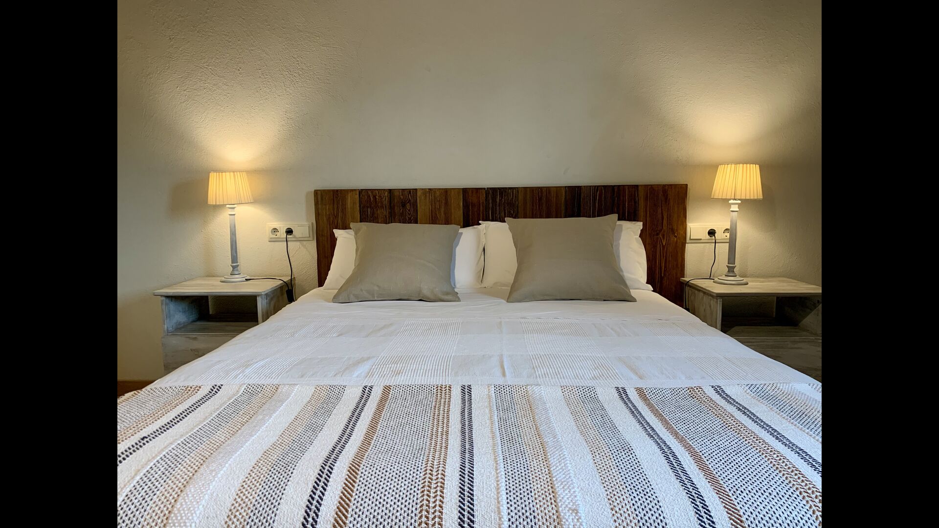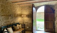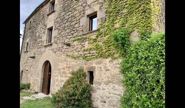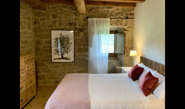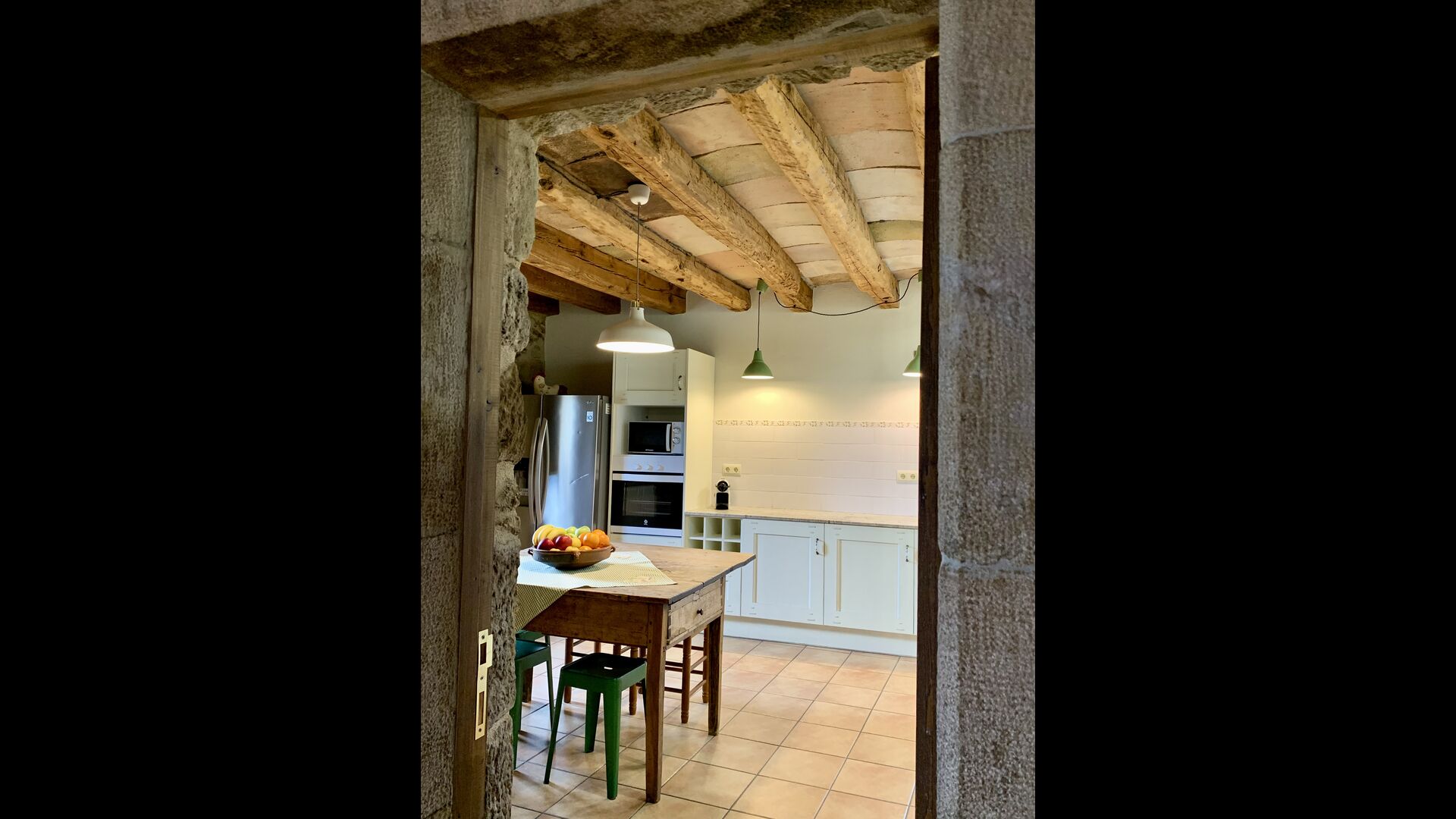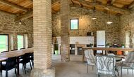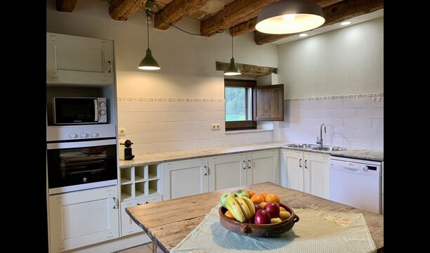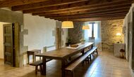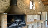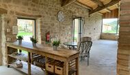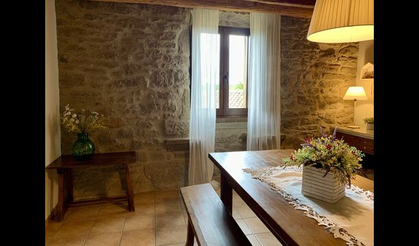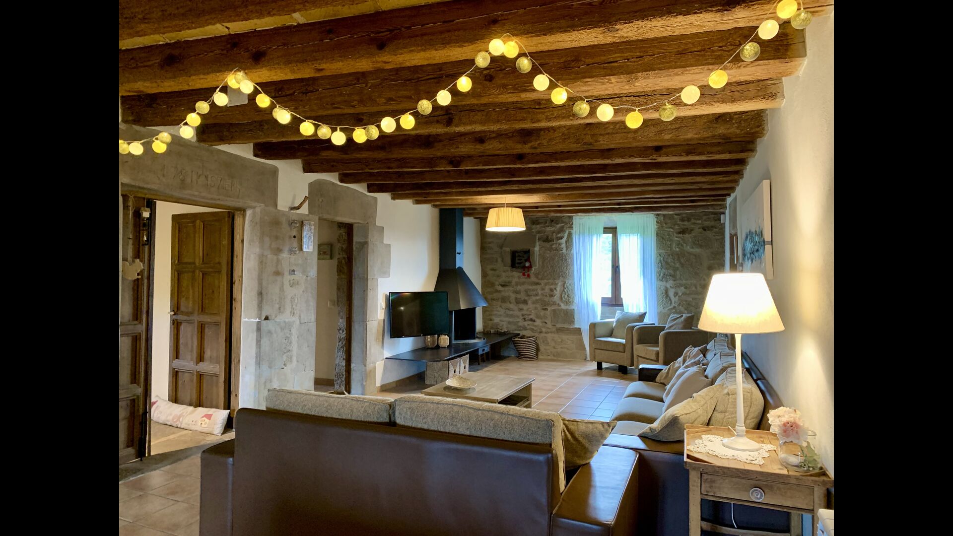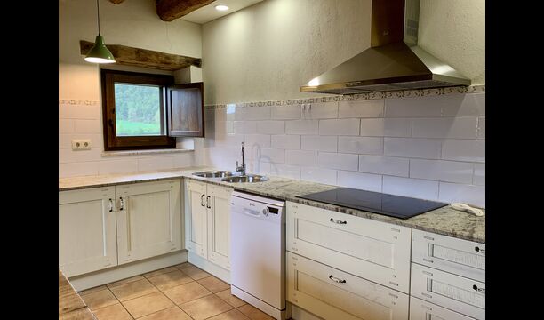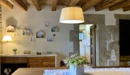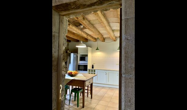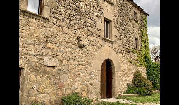 Beim Betreten des Hauptgebäudes betreten Sie eine große, einladende Halle, die von klassischer katalanischer Architektur und Design geprägt ist, wie den großen hölzernen Doppeltüren und Kalksteinwänden und -böden. Über das Treppenhaus gelangen Sie in den ersten Stock des Hauses, wo Sie das große Wohn- und Esszimmer betreten, das sich daran anschließt. Das Esszimmer verfügt über einen langen Holztisch mit Platz für die gesamte Gruppe und ist mit der voll ausgestatteten Küche verbunden, und das Wohnzimmer verfügt über gemütliche Sofas und einen Fernseher.