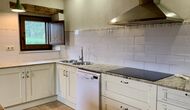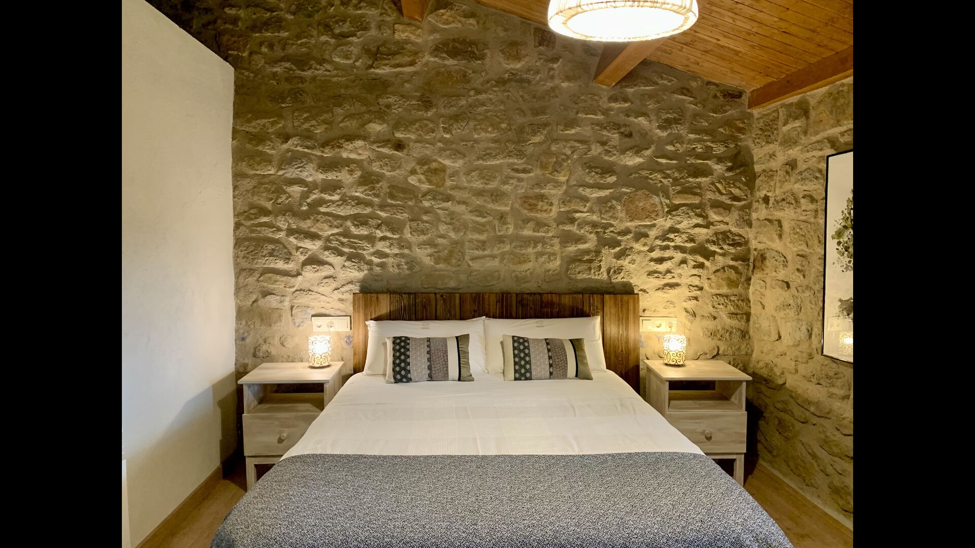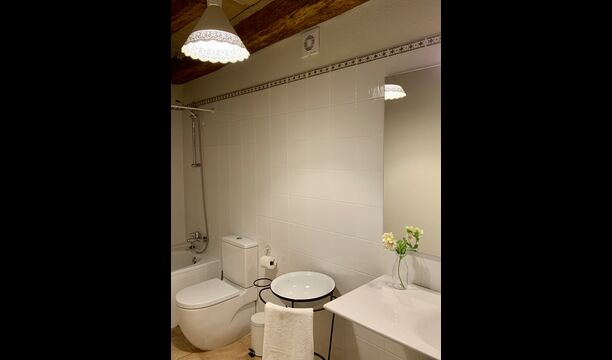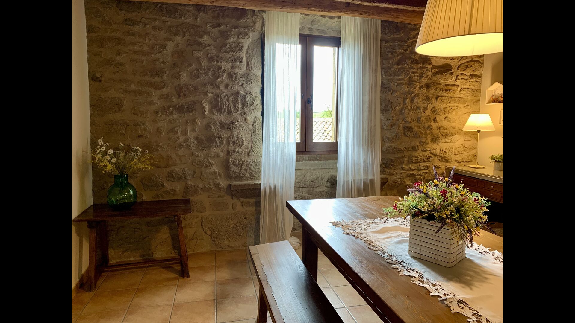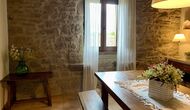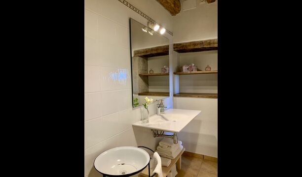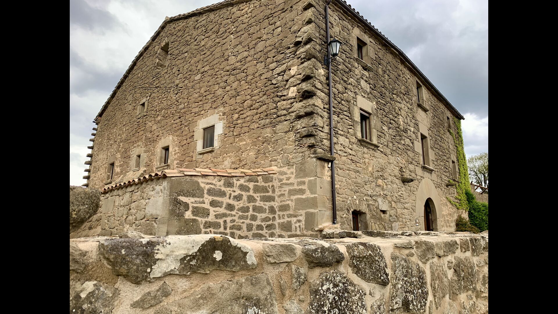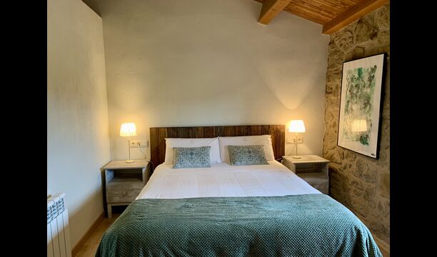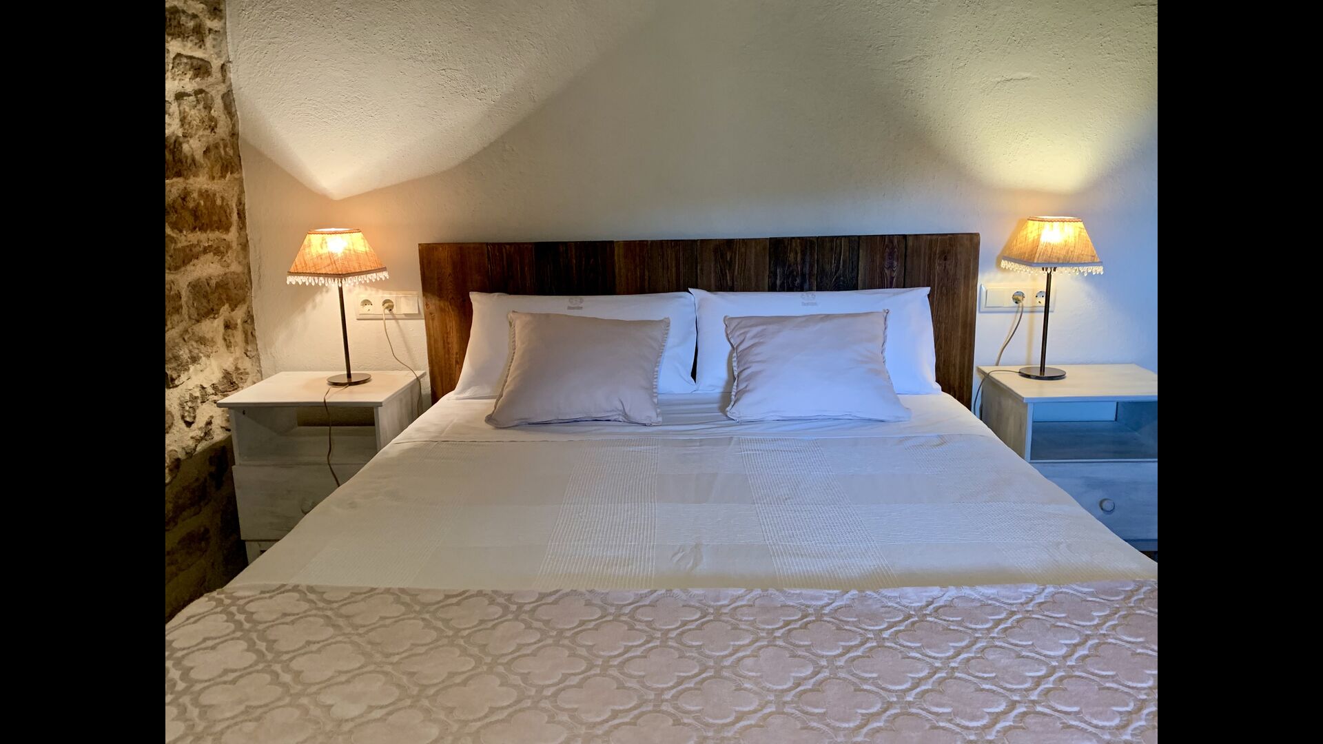 Beim Betreten des Hauptgebäudes betreten Sie eine große, einladende Halle, die von klassischer katalanischer Architektur und Design geprägt ist, wie den großen hölzernen Doppeltüren und Kalksteinwänden und -böden. Über das Treppenhaus gelangen Sie in den ersten Stock des Hauses, wo Sie das große Wohn- und Esszimmer betreten, das sich daran anschließt. Das Esszimmer verfügt über einen langen Holztisch mit Platz für die gesamte Gruppe und ist mit der voll ausgestatteten Küche verbunden, und das Wohnzimmer verfügt über gemütliche Sofas und einen Fernseher.