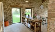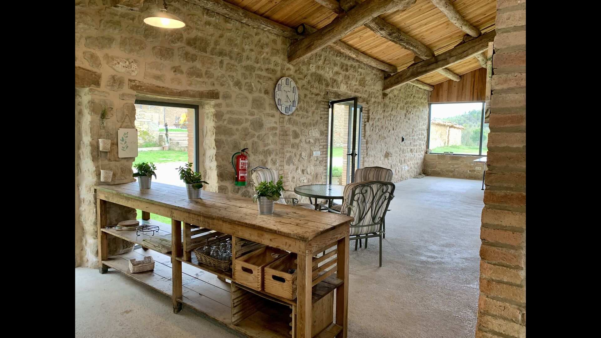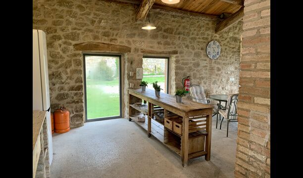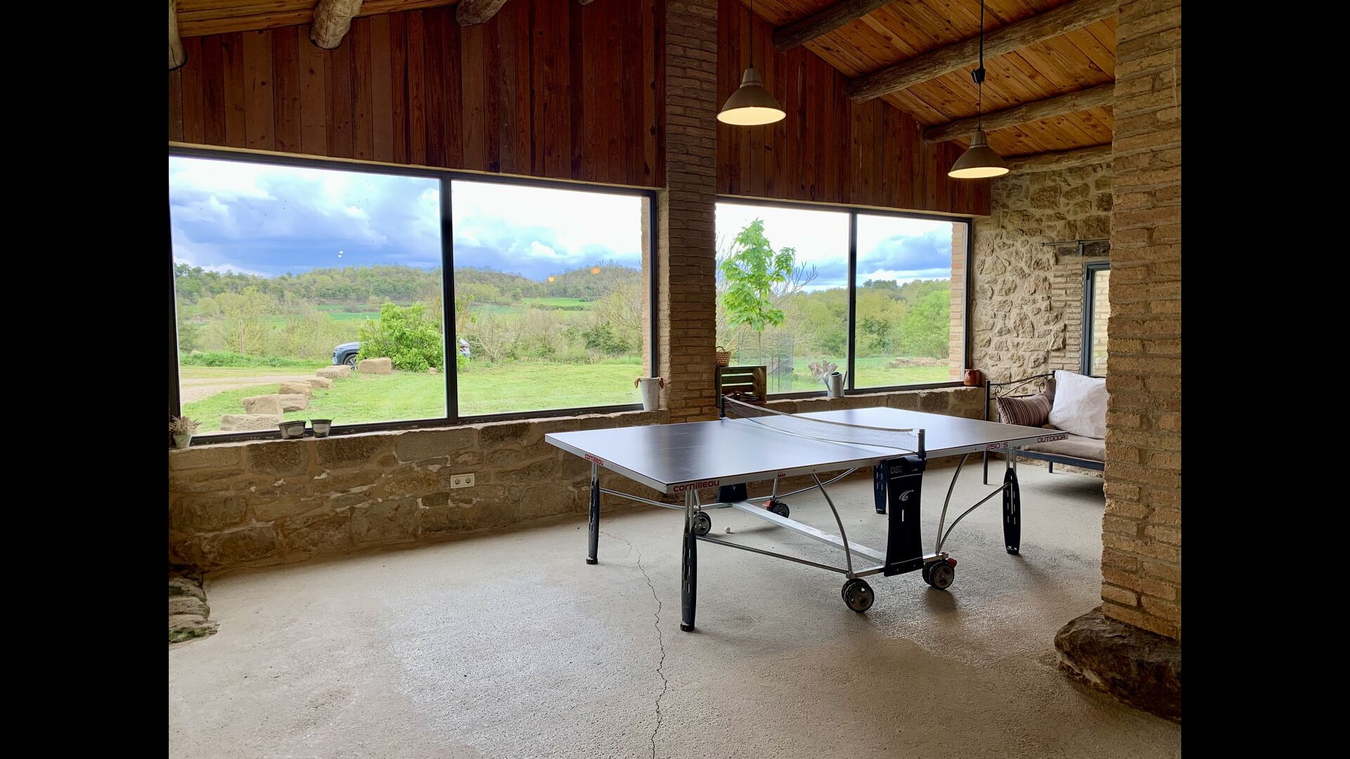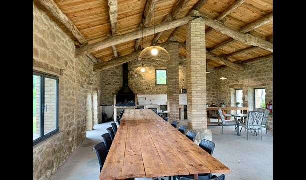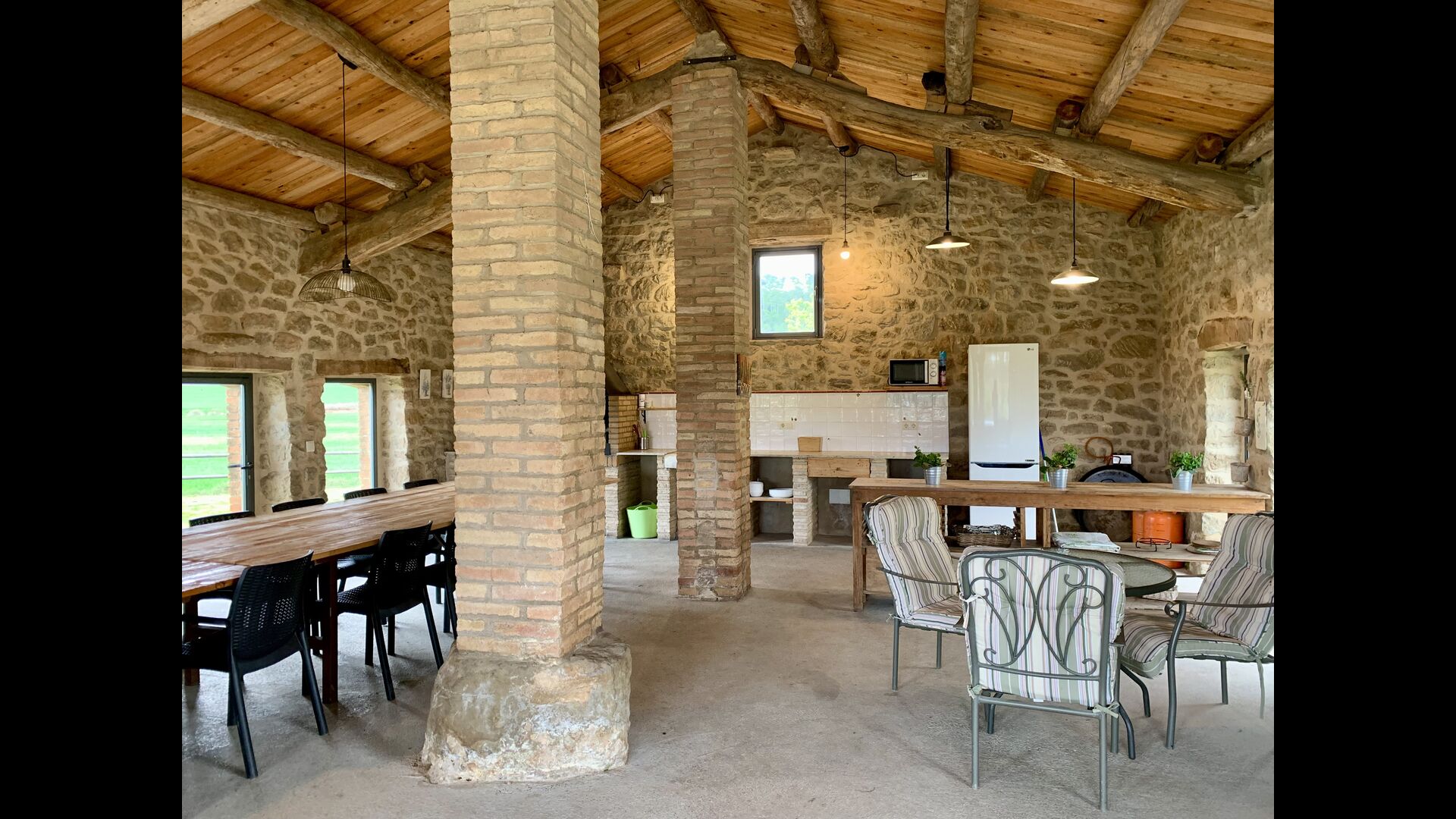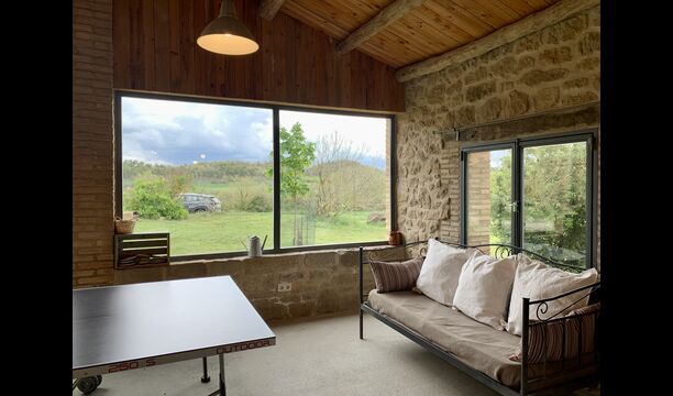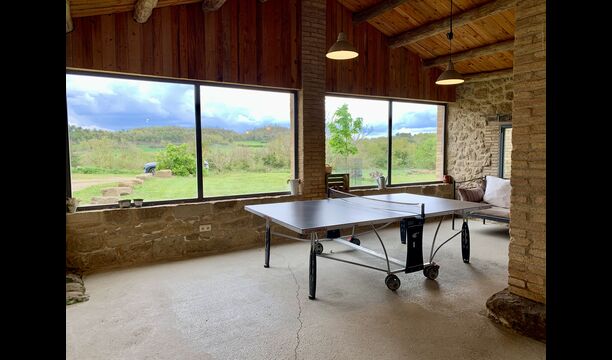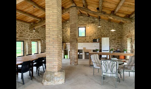 Das kleinere, separate Kalksteingebäude befindet sich neben dem Poolbereich. Im Inneren gibt es eine große Tischtennisplatte, einen langen Esstisch aus Holz und einen Grillplatz mit einfachen Kücheneinrichtungen. Die Lage ist hervorragend, da es vom Poolbereich aus leicht zu erreichen ist. Wir stellen uns vor, dass die Kinder der Gruppe eine Menge Spaß haben werden, wenn sie vom Spielzimmer und dem Swimmingpool hin und her laufen.
