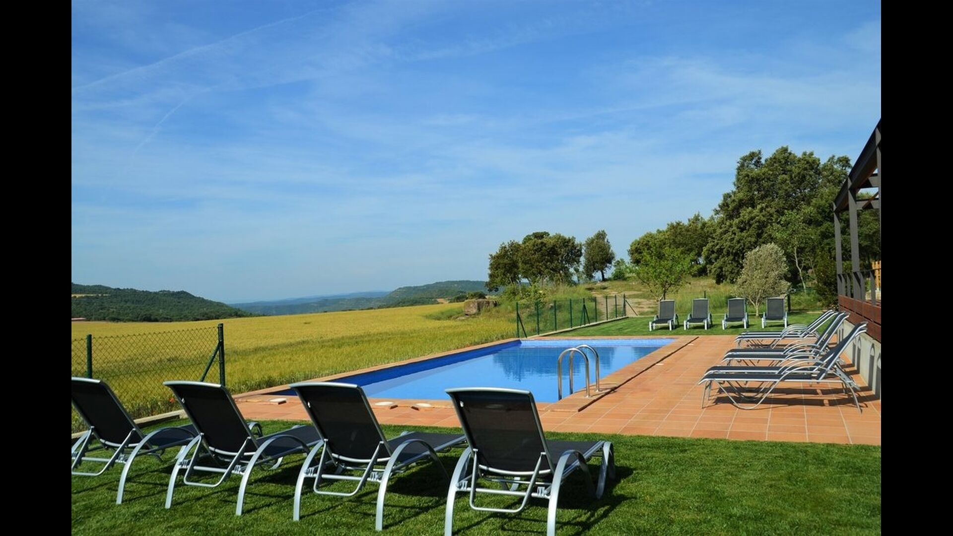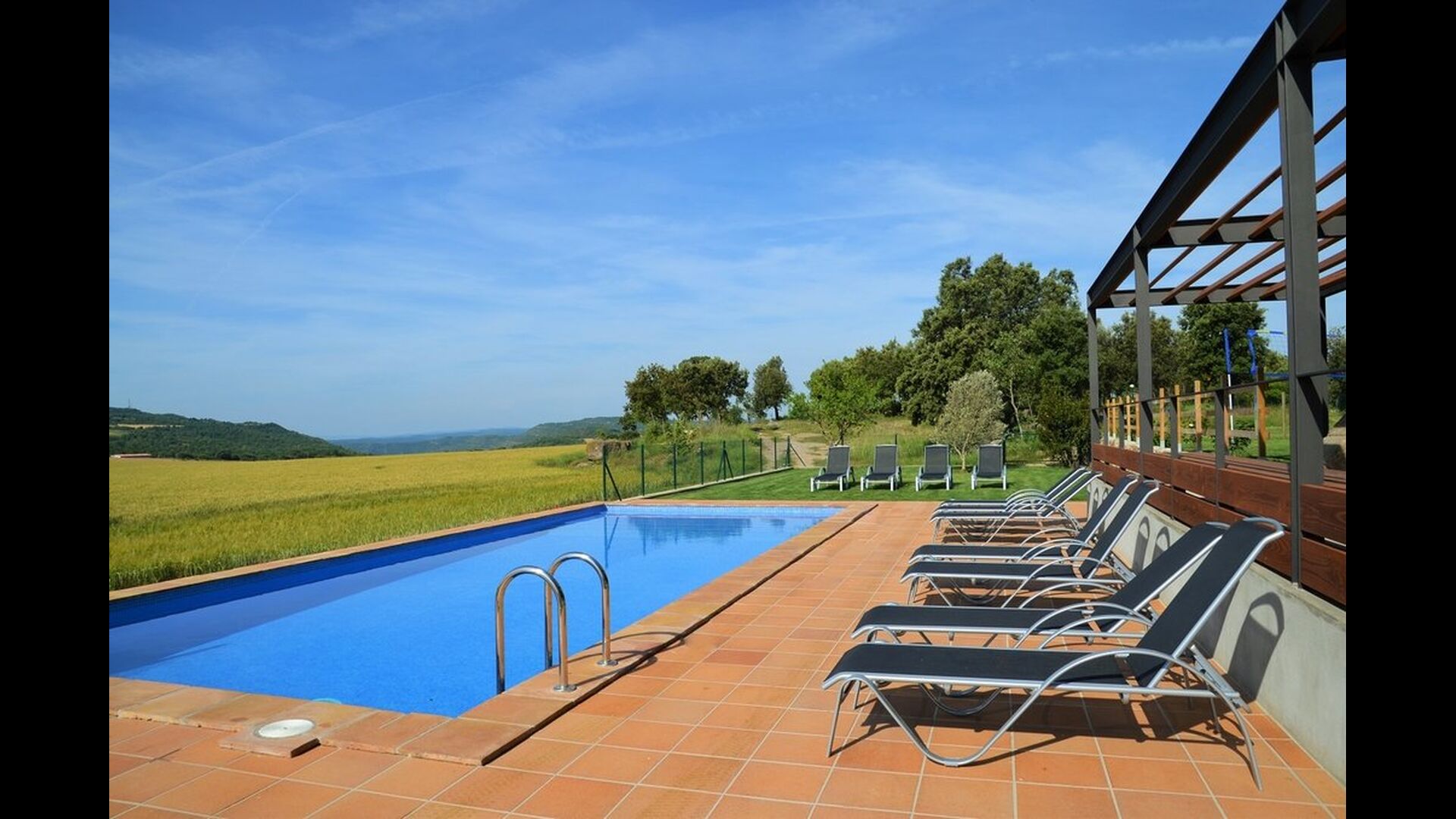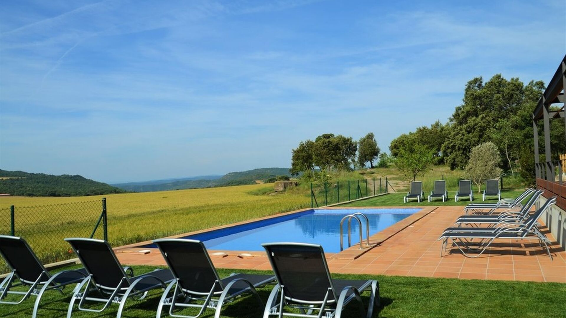 Im Garten gibt es zwei Entspannungsbereiche mit bequemen Aussensofas. Der eine am Pool, wo es auch eine Menge Liegestühle gibt, und der andere auf einer erhöhten Terrasse mit einem fantastischen Blick über die schöne Landschaft. Das Ferienhaus Masia del Cerdaña ist in der Tat auf einem Hügel gelegen mit einer wunderbaren Aussicht - fast den ganzen Weg rund.