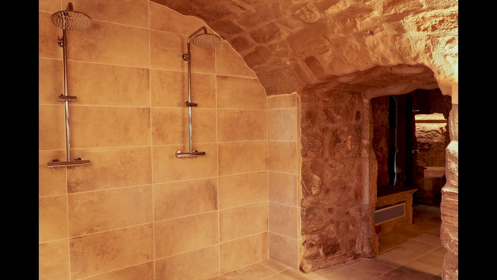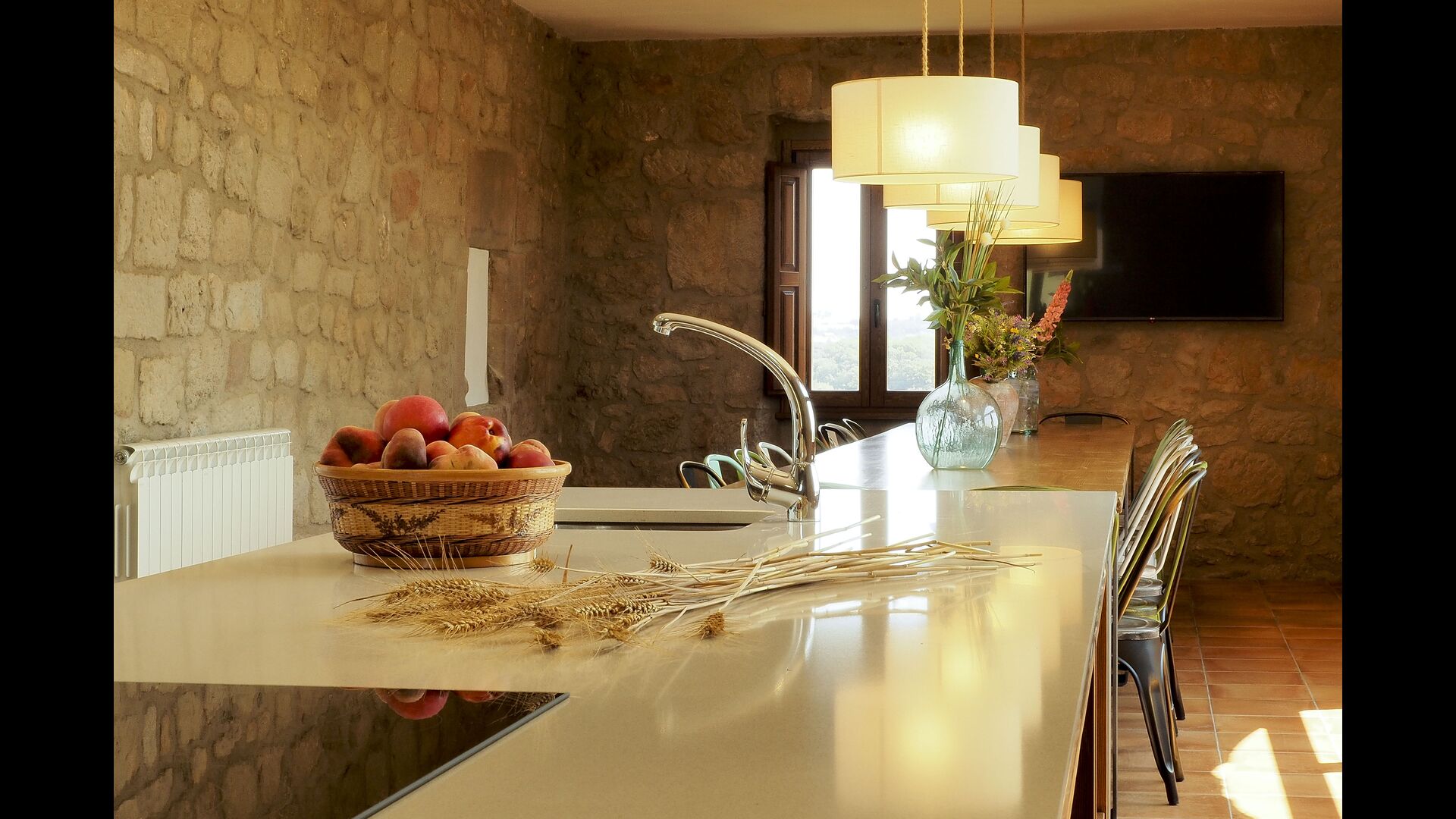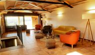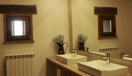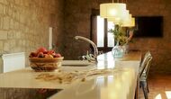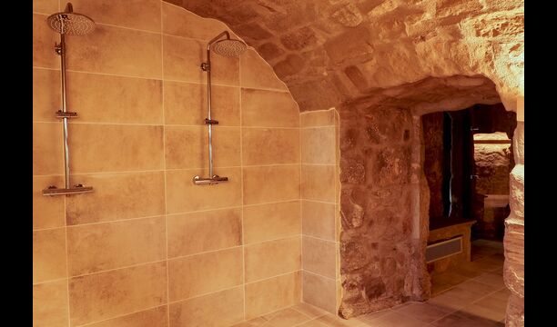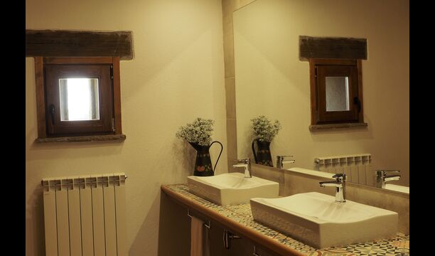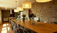 Die große und voll ausgestattete Küche befindet sich im Erdgeschoss. Sein offener Raum macht es zu einem großartigen Ort, um große Mahlzeiten für die gesamte Gruppe zuzubereiten. In Erweiterung der Küche befindet sich der Essbereich mit einem langen Holztisch. Der Bereich bietet Platz für die gesamte Gruppe, um gemeinsam zu speisen. Neben der Küche und dem Essbereich befindet sich im Erdgeschoss das geräumige Wohnzimmer mit bequemen Sofas und einem gemütlichen Kamin. Acht der Doppelzimmer befinden sich ebenfalls im Erdgeschoss. Jedes Schlafzimmer ist mit einem TV und einem eigenen Bad ausgestattet.