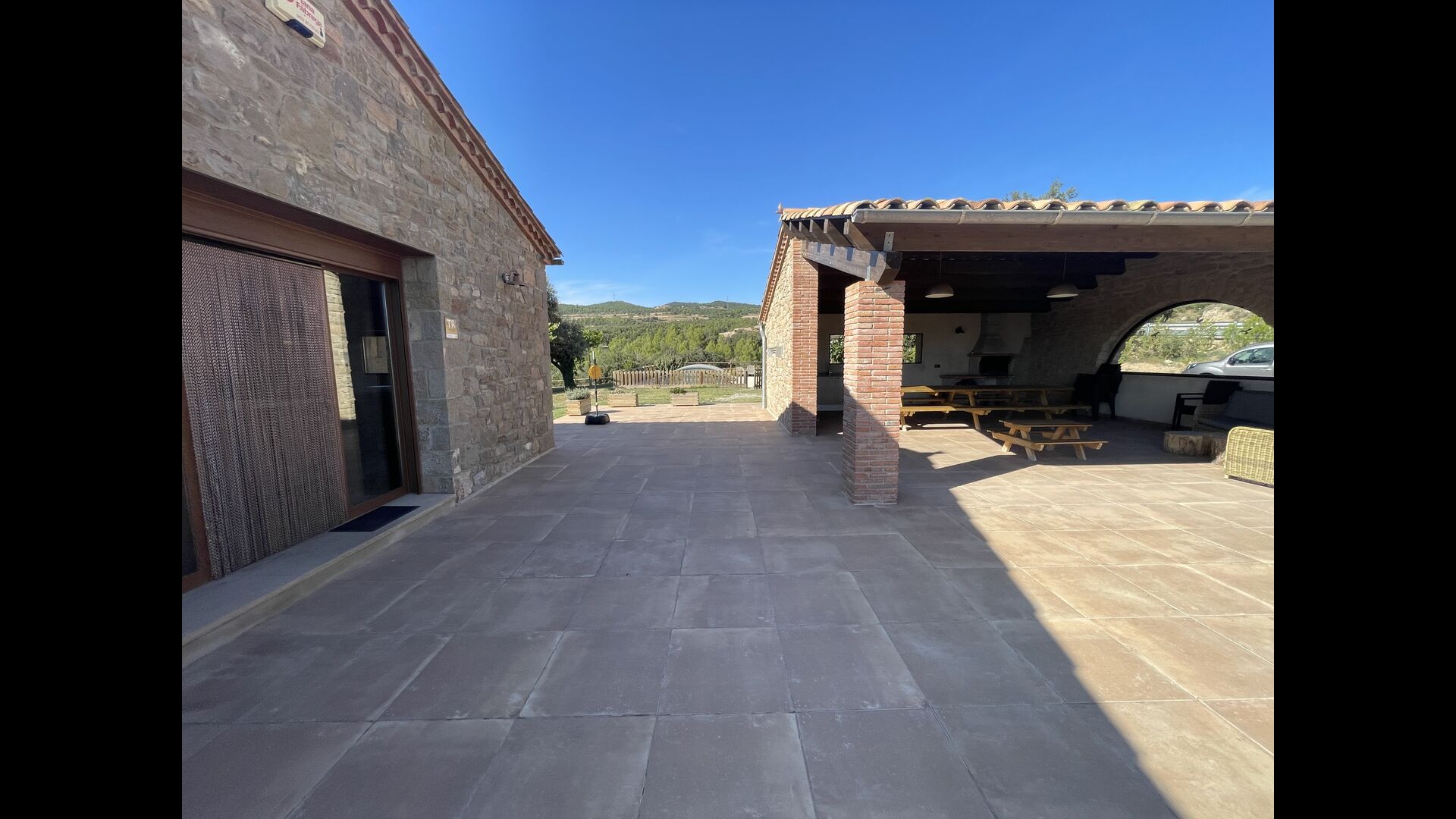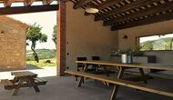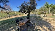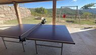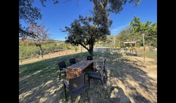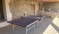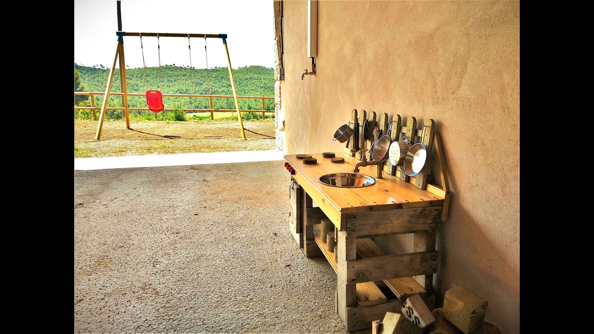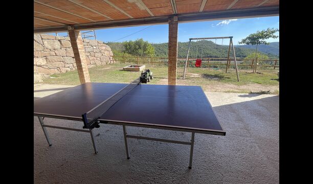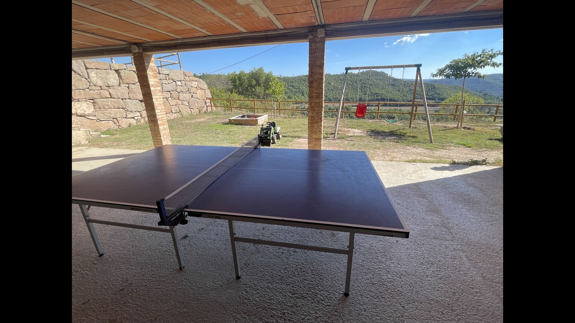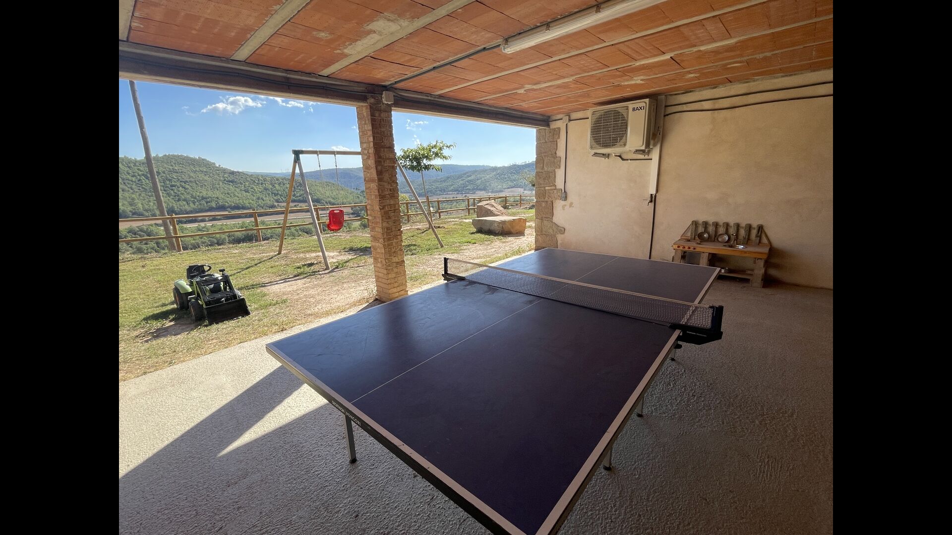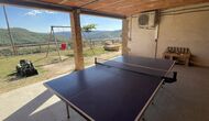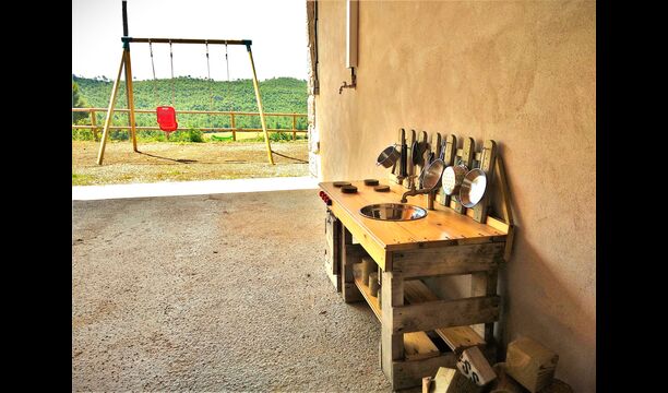 Außerhalb des Haupthauses gibt es einen Grillplatz/Terrasse, wo Sie auch eine lange Essbank und Sofasessel finden >, eine Miniküche mit Spüle und eine der beiden Veranden, mit Blick auf das wunderschöne Tal darunter. Das Anwesen verfügt auch über viele Einrichtungen für Kinder. Schaukeln, ein Trampolin, ein Sandkasten/Spielplatz und – egal, ob Sie jung oder alt sind – eine Tennisplatte für Nachmittagsspaß mit der Familie.