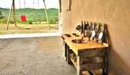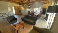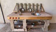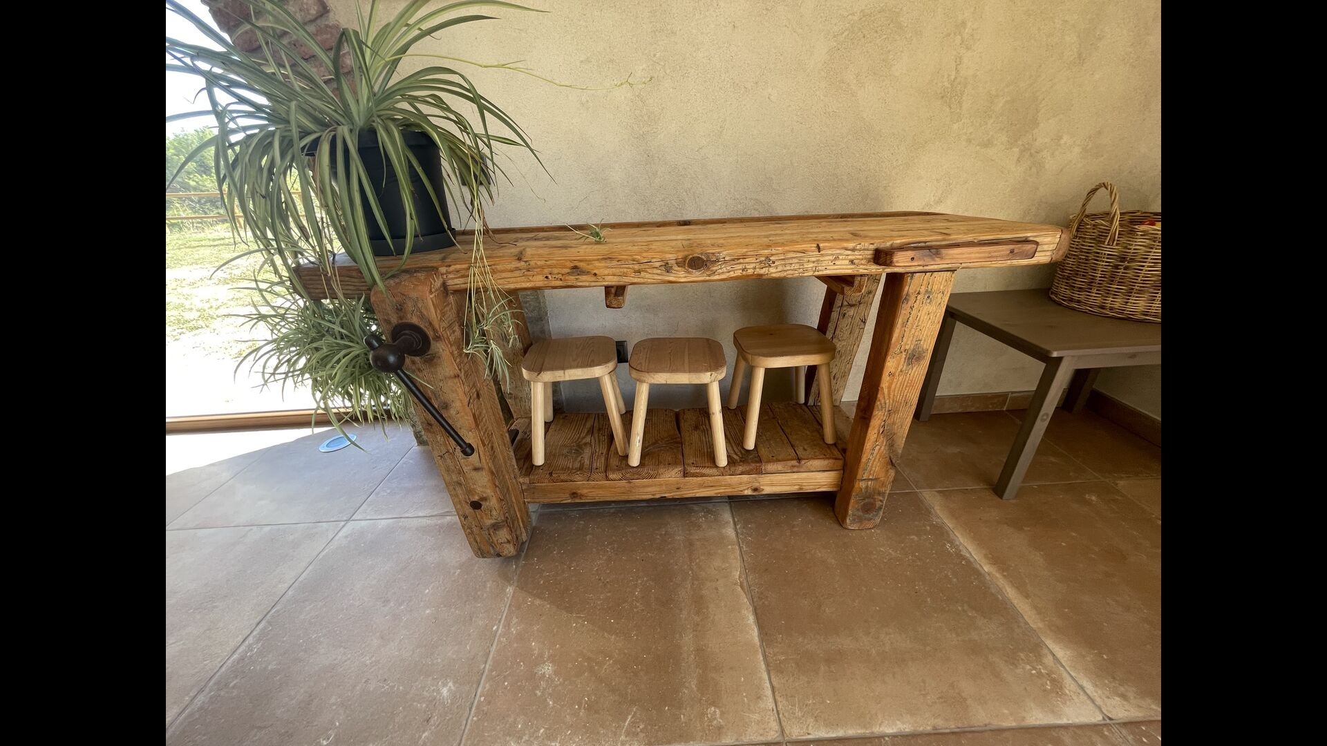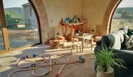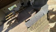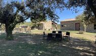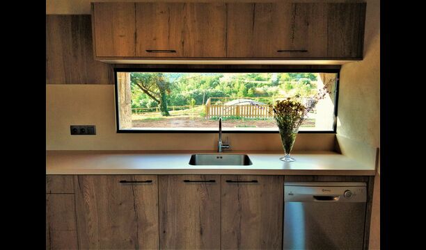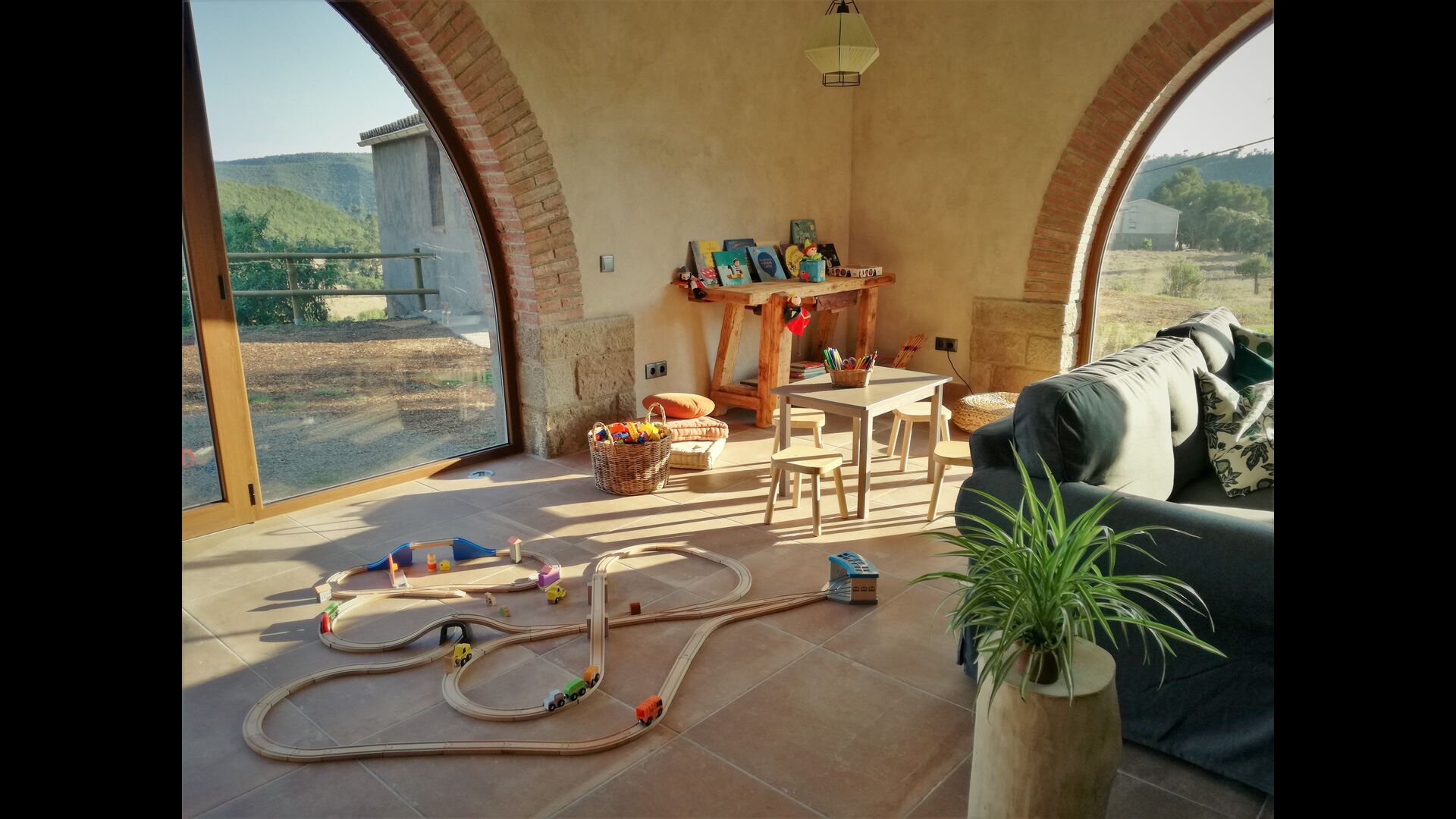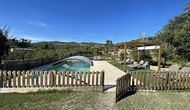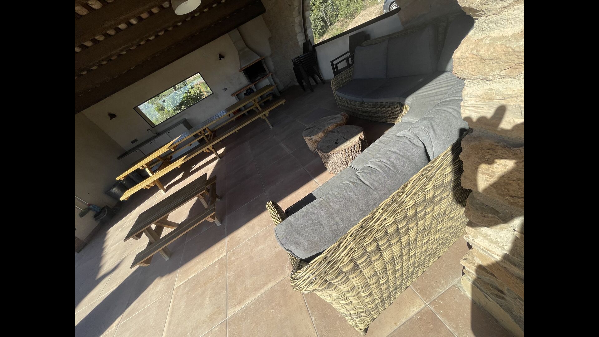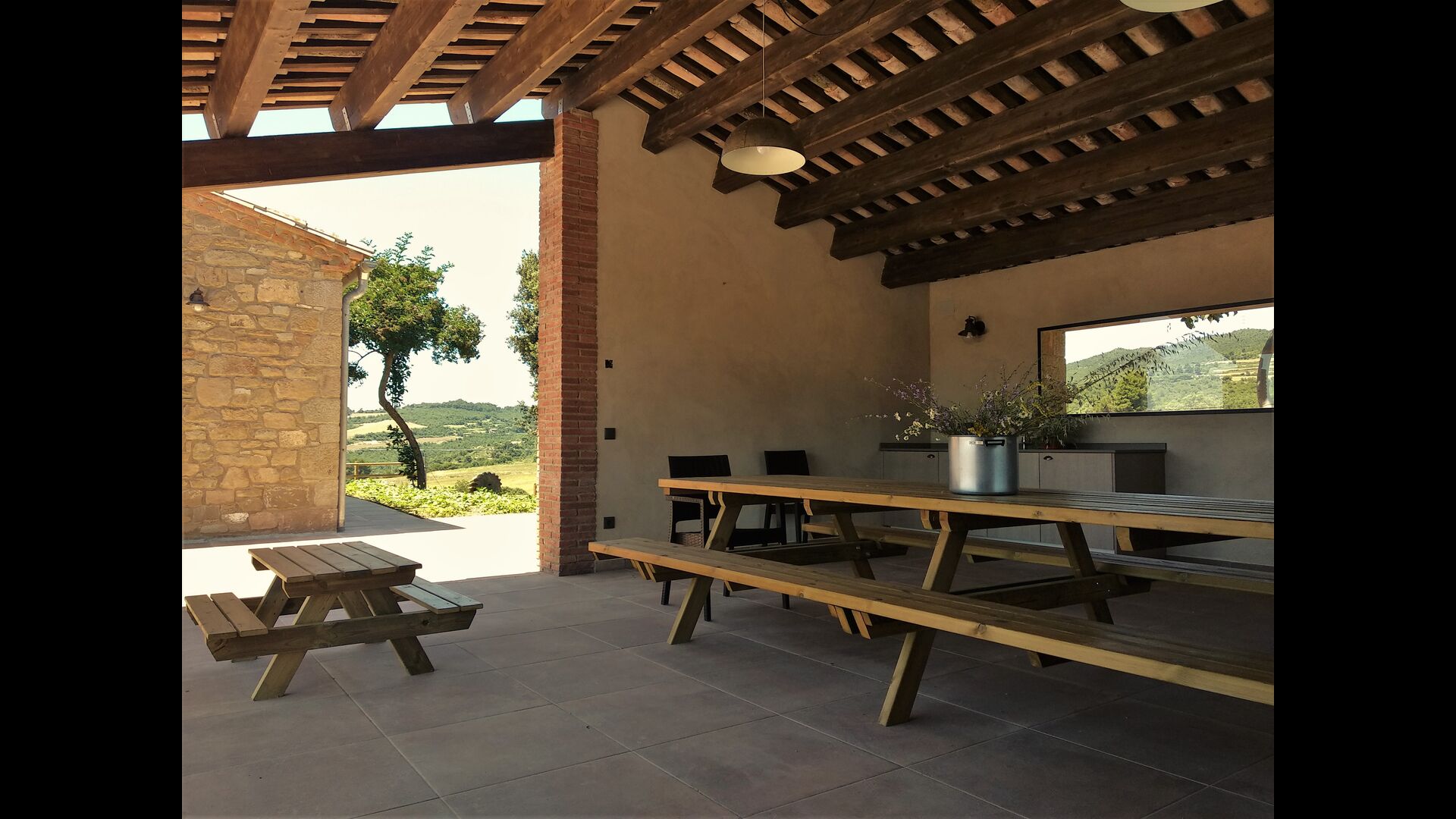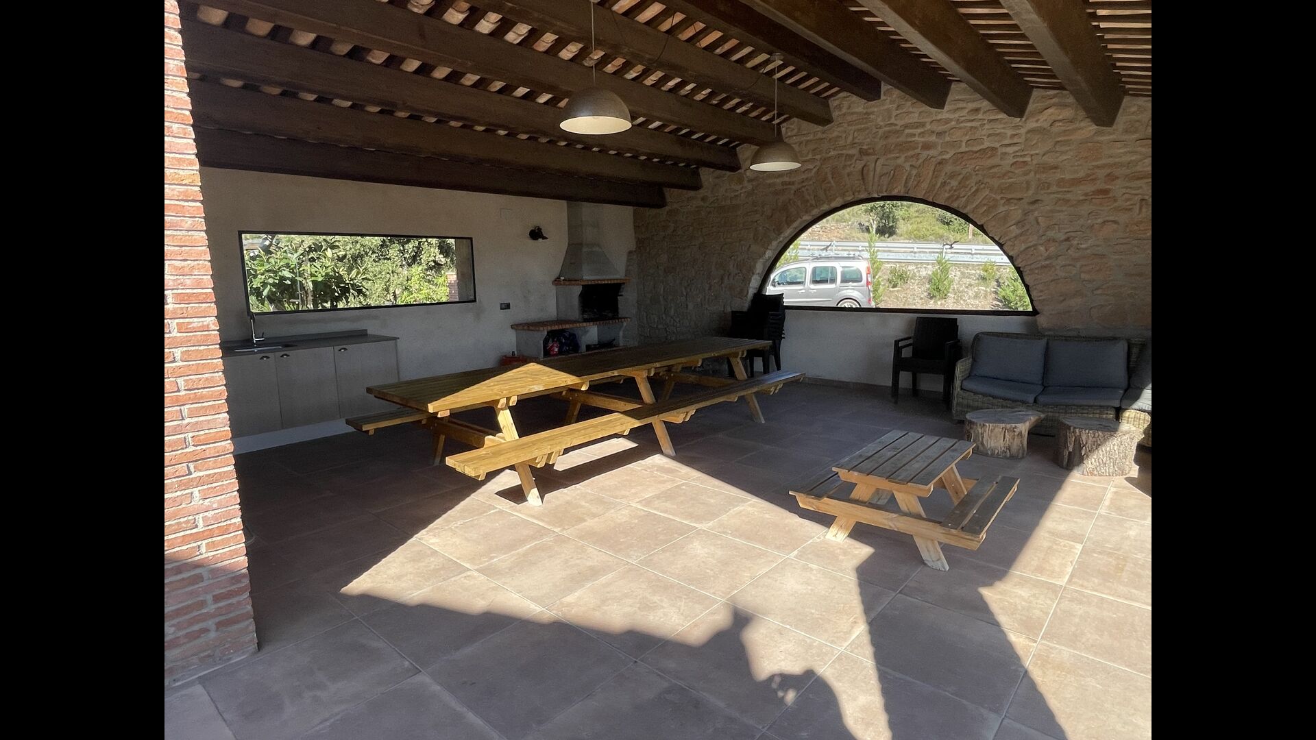Außerhalb des Haupthauses gibt es einen Grillplatz/Terrasse, wo Sie auch eine lange Essbank und Sofasessel finden >, eine Miniküche mit Spüle und eine der beiden Veranden, mit Blick auf das wunderschöne Tal darunter. Das Anwesen verfügt auch über viele Einrichtungen für Kinder. Schaukeln, ein Trampolin, ein Sandkasten/Spielplatz und – egal, ob Sie jung oder alt sind – eine Tennisplatte für Nachmittagsspaß mit der Familie.