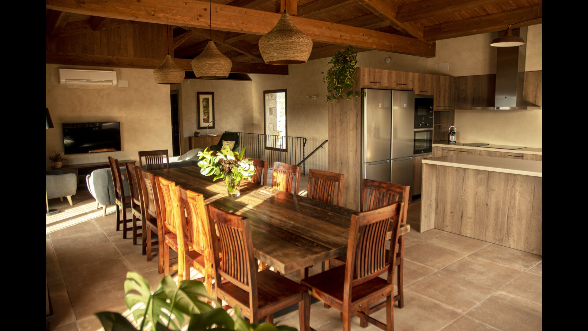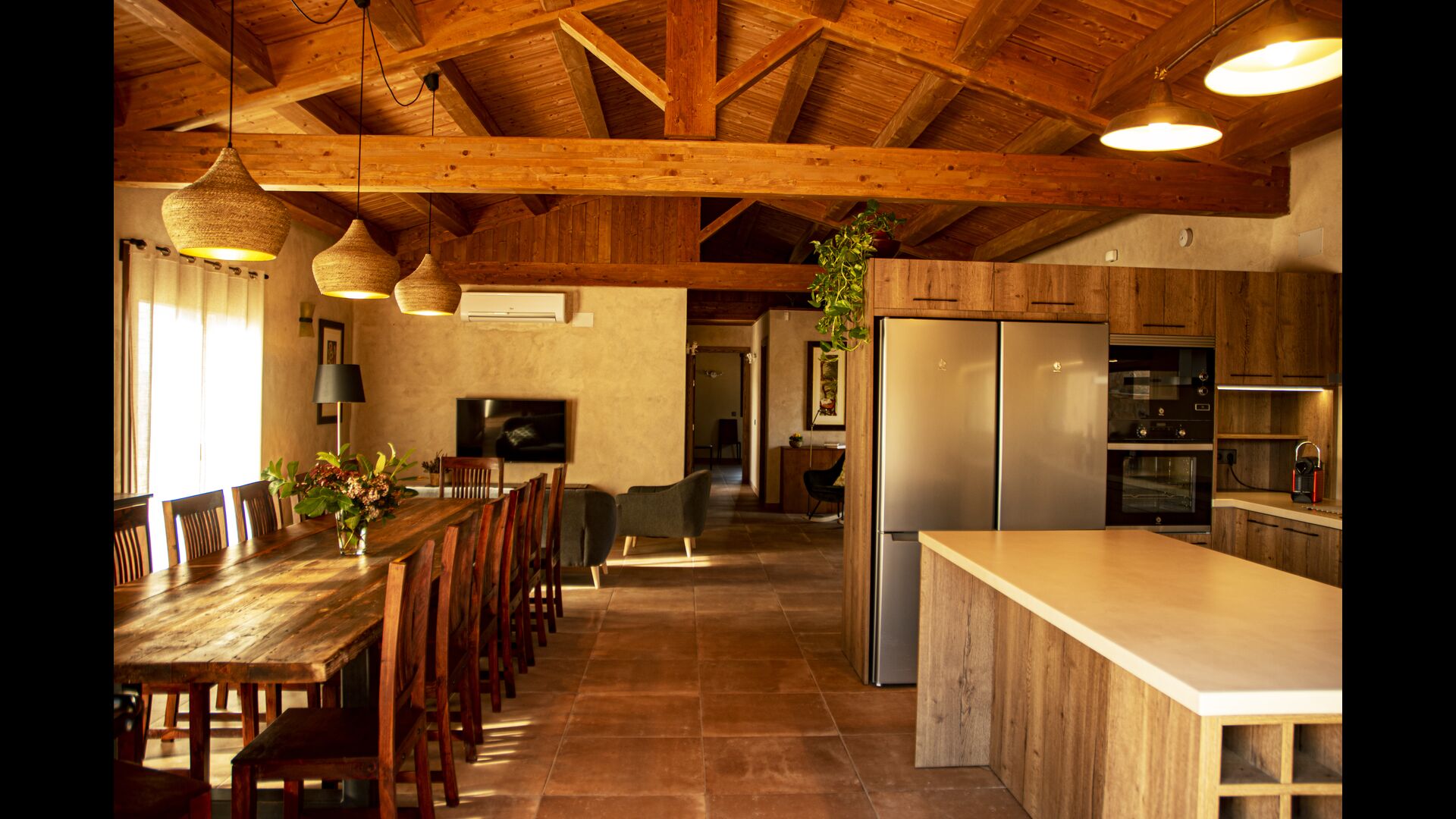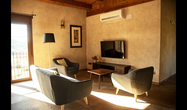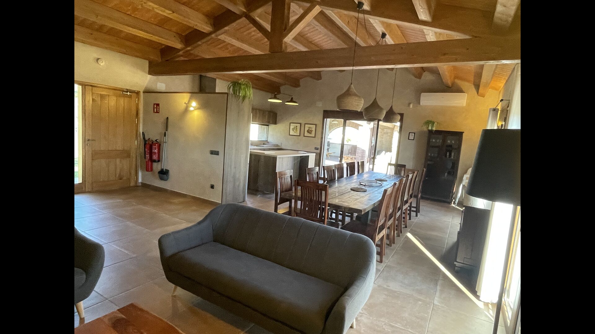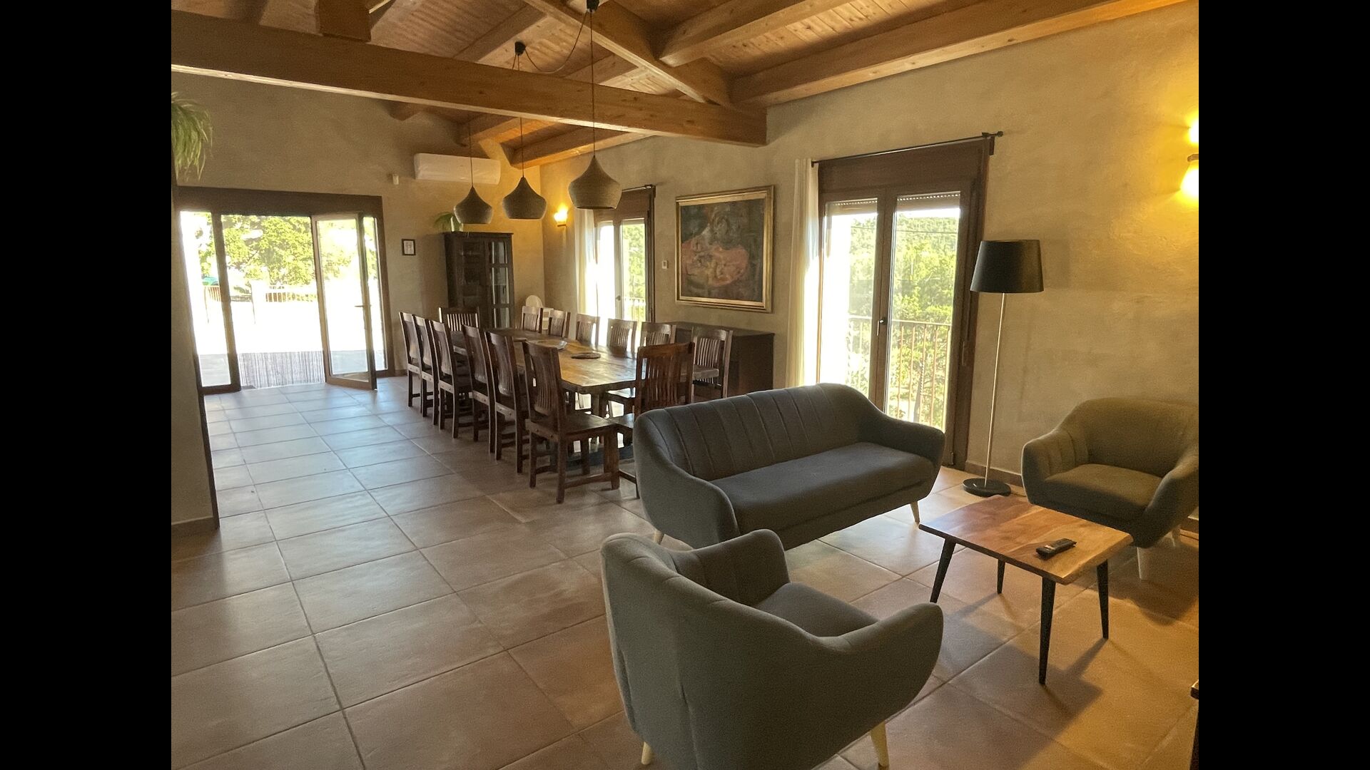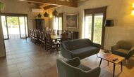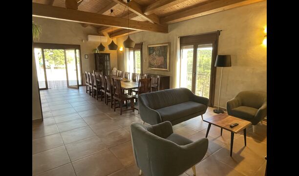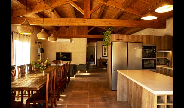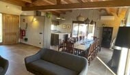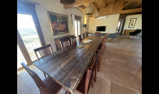 Der schöne und ruhige Flur/Wohnzimmer enthält einen großen, hölzernen, langen Esstisch und – direkt angeschlossen an diesen Bereich – ist die modernisierte, hochwertige Küche mit 2 Kühlschränken (mit Gefrierkombinationen), einem Backofen und allem Notwendigen Küchengeräte. Beide Bereiche sind in die warmen Sonnenstrahlen getaucht, was sie zu einem wunderschönen verlockenden Ort macht, an dem Sie Ihr Frühstück, Mittag- und Abendessen einnehmen können. Hinter dem Essbereich befindet sich das zusammengeschlossene Wohnzimmer, ausgestattet mit einem Kamin, bequemen Sofasesseln, einem Couchtisch und einem Fernseher . Der Raum ist außerdem klimatisiert. Wenn Ihnen also die Hitze zu schaffen macht, ist er der perfekte Ort zum Entspannen in den wärmsten Stunden des Tages.