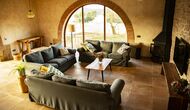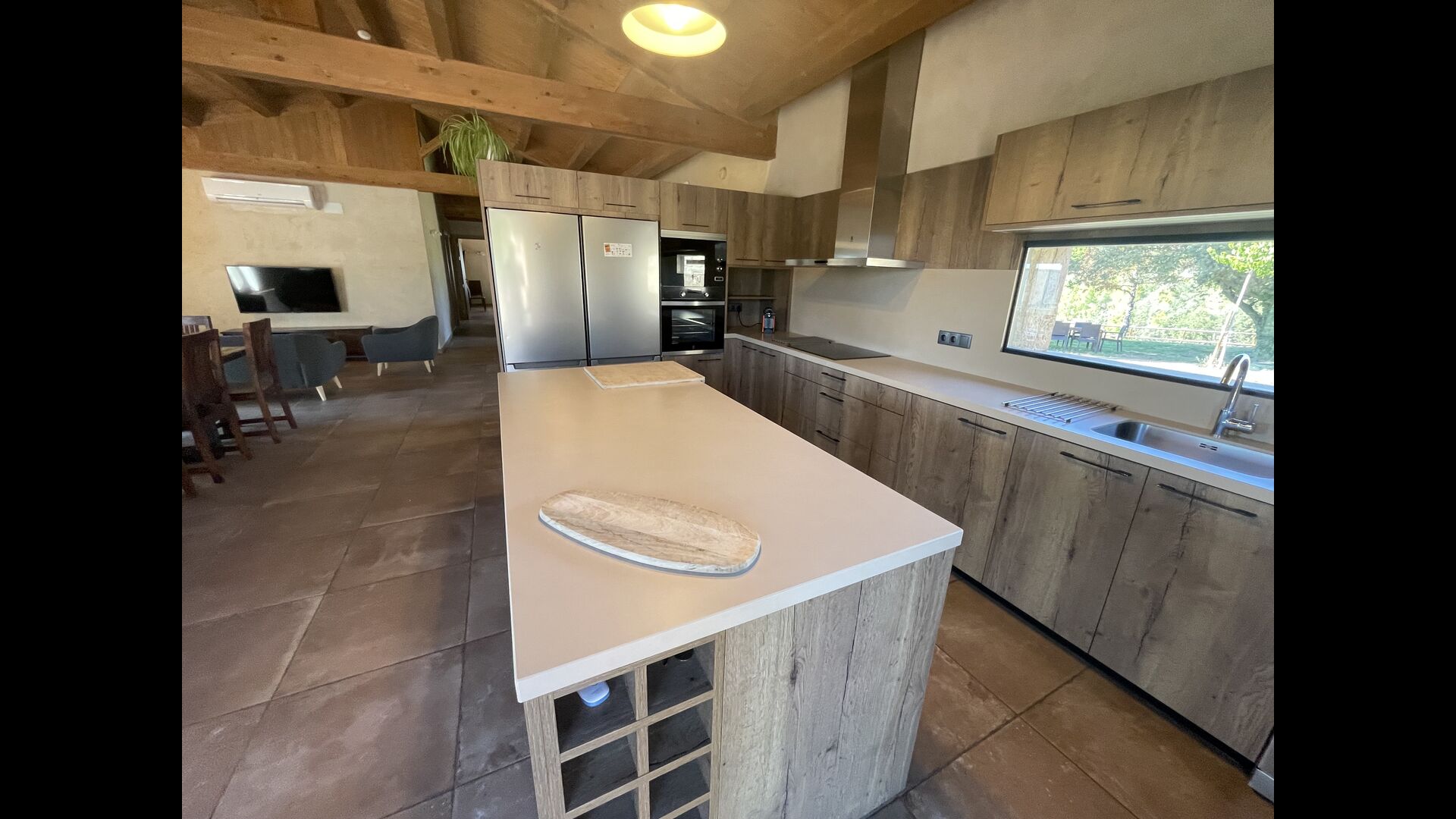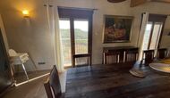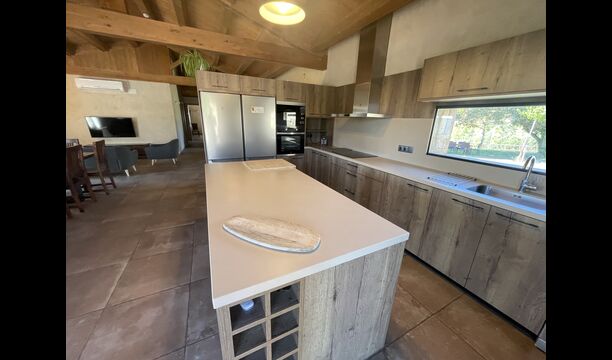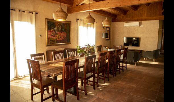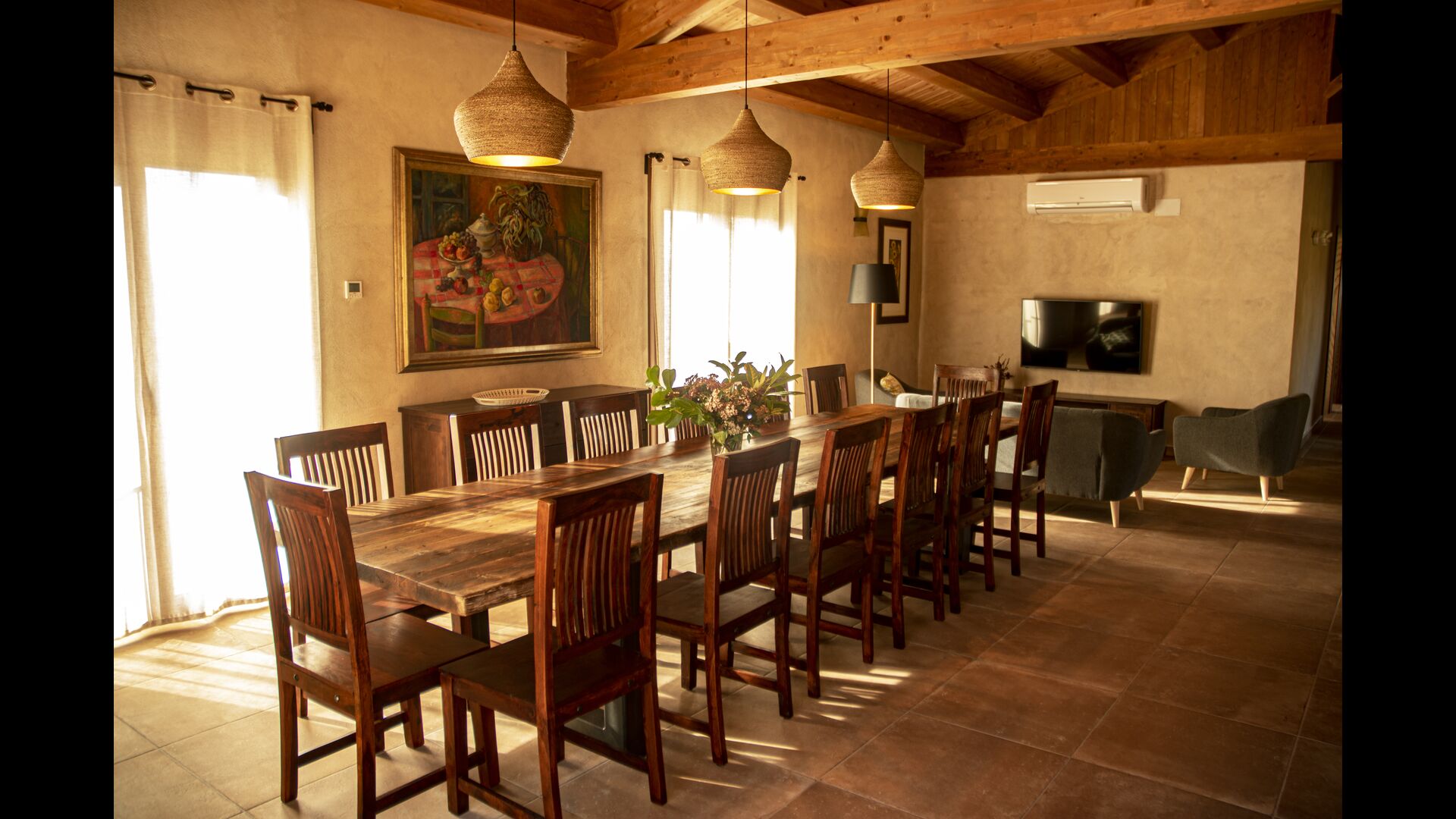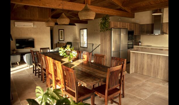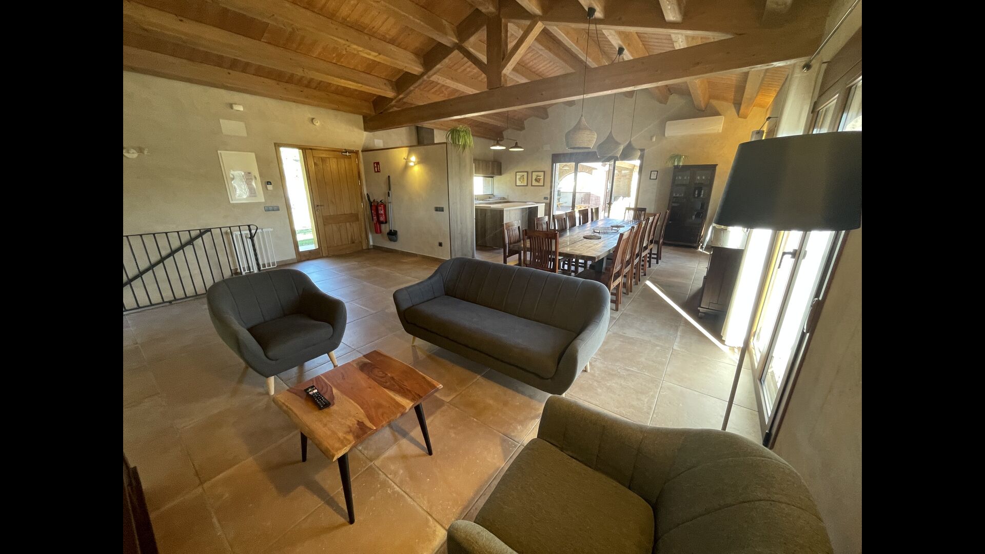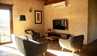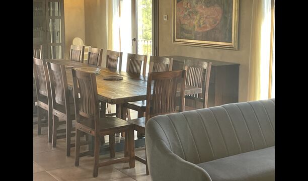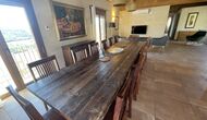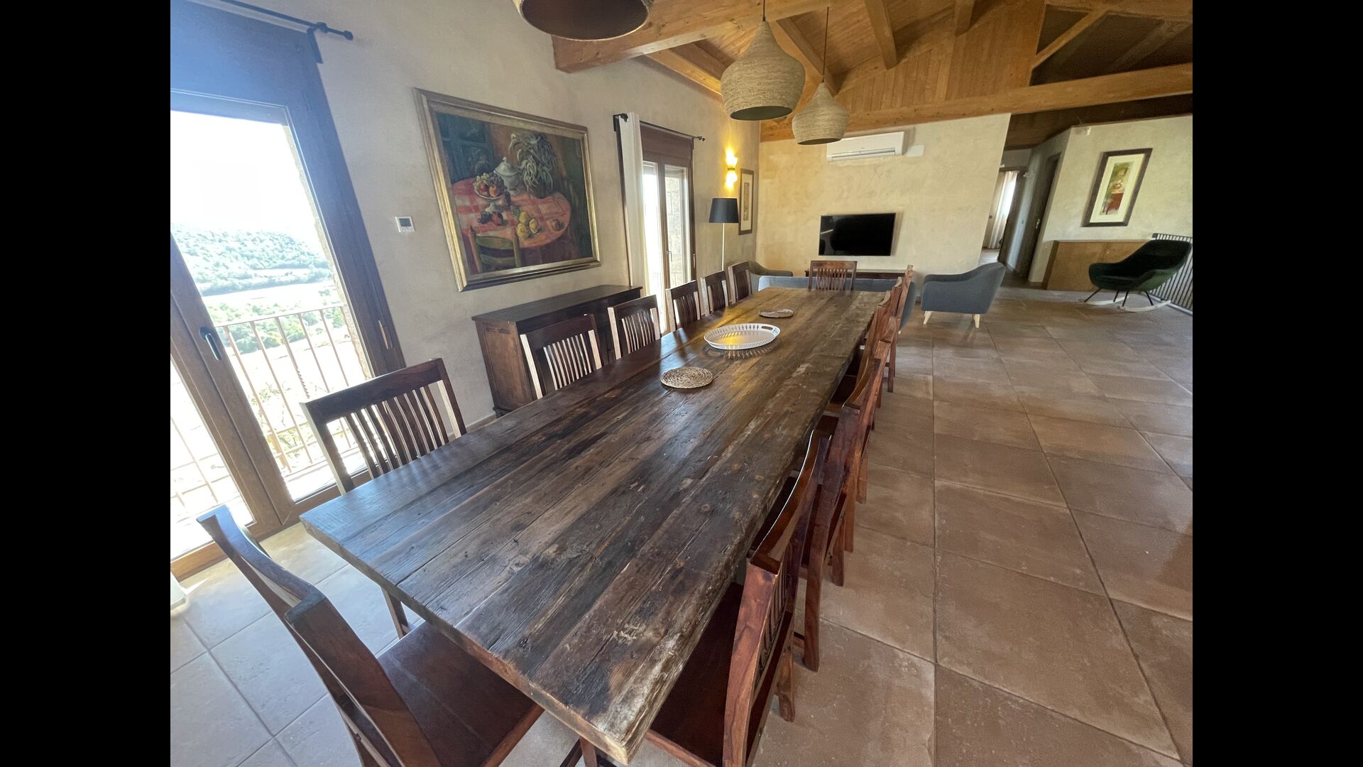 Der schöne und ruhige Flur/Wohnzimmer enthält einen großen, hölzernen, langen Esstisch und – direkt angeschlossen an diesen Bereich – ist die modernisierte, hochwertige Küche mit 2 Kühlschränken (mit Gefrierkombinationen), einem Backofen und allem Notwendigen Küchengeräte. Beide Bereiche sind in die warmen Sonnenstrahlen getaucht, was sie zu einem wunderschönen verlockenden Ort macht, an dem Sie Ihr Frühstück, Mittag- und Abendessen einnehmen können. Hinter dem Essbereich befindet sich das zusammengeschlossene Wohnzimmer, ausgestattet mit einem Kamin, bequemen Sofasesseln, einem Couchtisch und einem Fernseher . Der Raum ist außerdem klimatisiert. Wenn Ihnen also die Hitze zu schaffen macht, ist er der perfekte Ort zum Entspannen in den wärmsten Stunden des Tages.