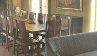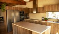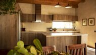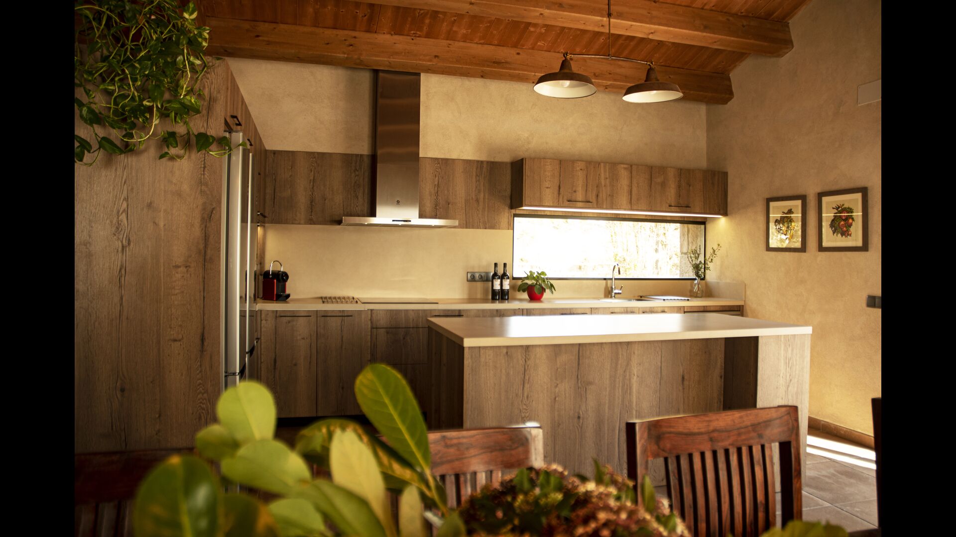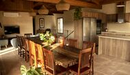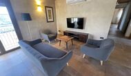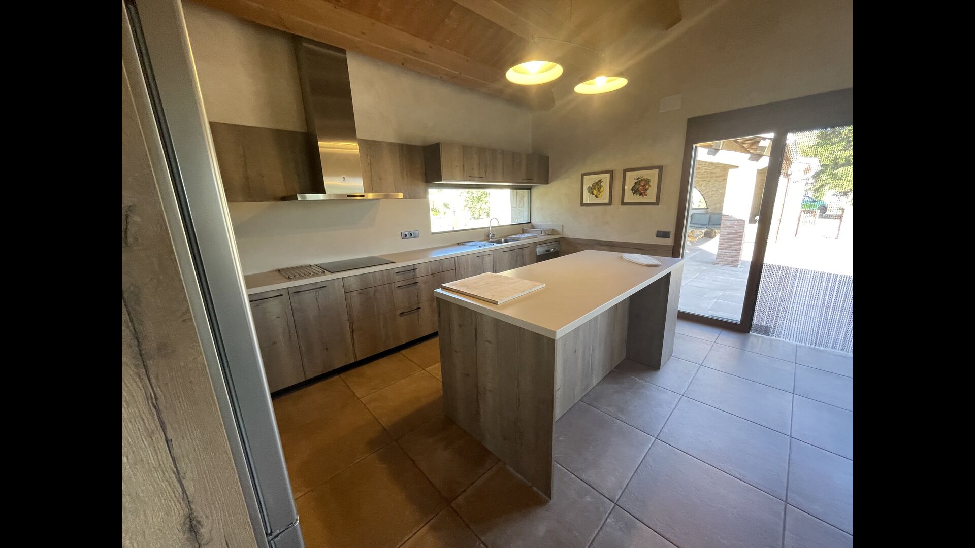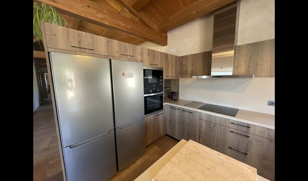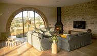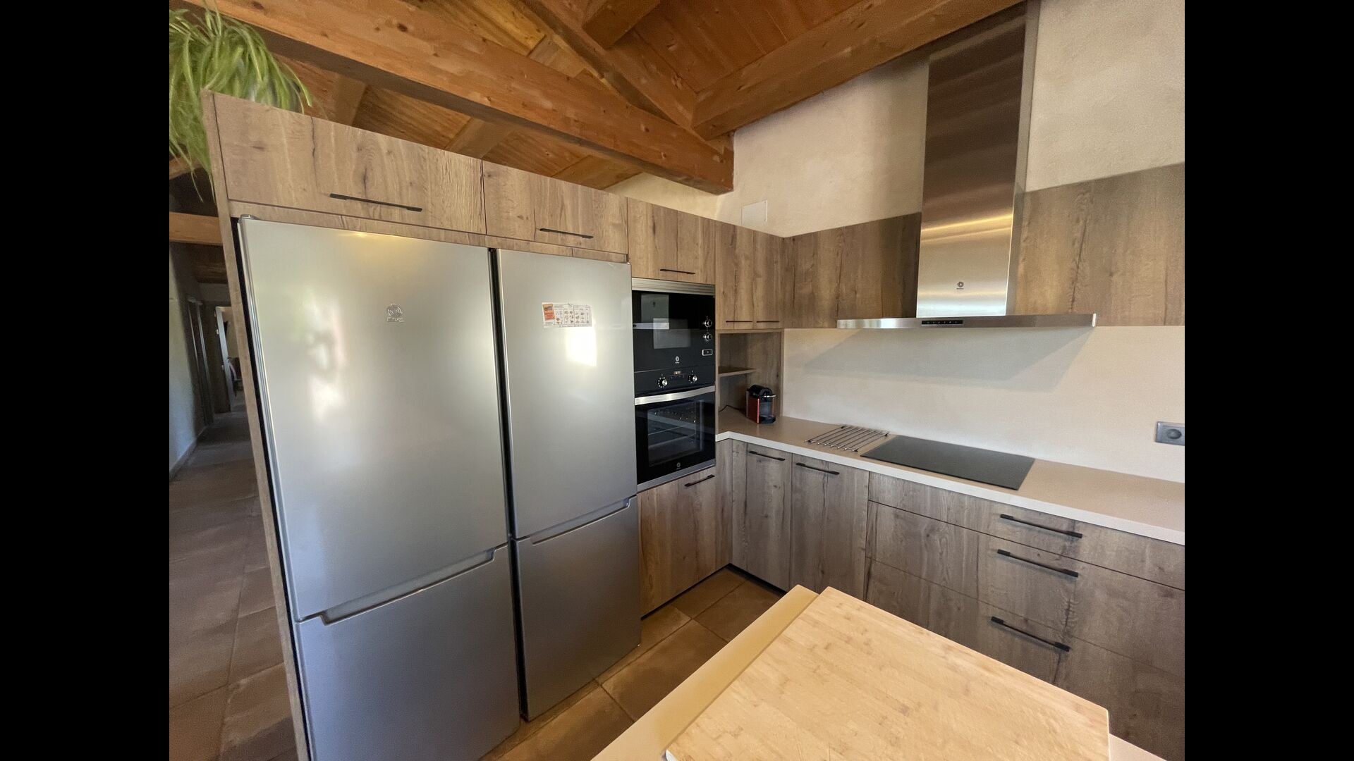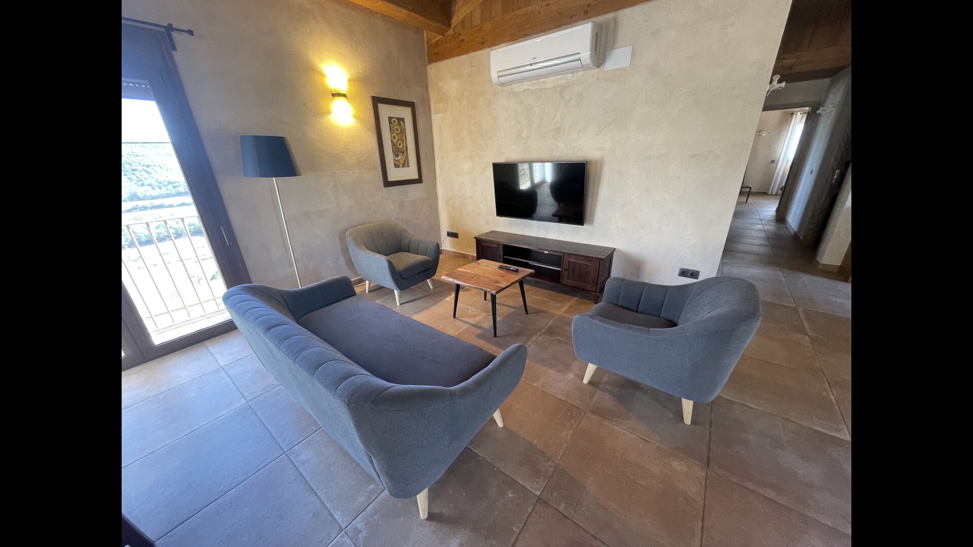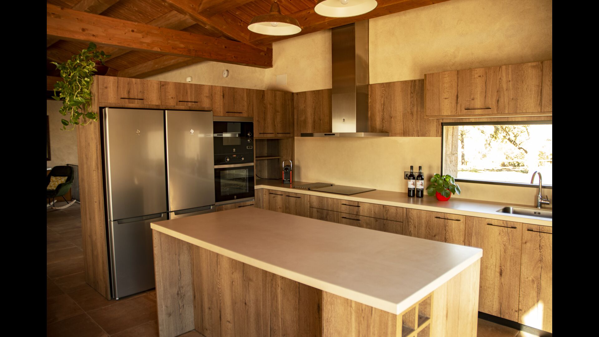 Der schöne und ruhige Flur/Wohnzimmer enthält einen großen, hölzernen, langen Esstisch und – direkt angeschlossen an diesen Bereich – ist die modernisierte, hochwertige Küche mit 2 Kühlschränken (mit Gefrierkombinationen), einem Backofen und allem Notwendigen Küchengeräte. Beide Bereiche sind in die warmen Sonnenstrahlen getaucht, was sie zu einem wunderschönen verlockenden Ort macht, an dem Sie Ihr Frühstück, Mittag- und Abendessen einnehmen können. Hinter dem Essbereich befindet sich das zusammengeschlossene Wohnzimmer, ausgestattet mit einem Kamin, bequemen Sofasesseln, einem Couchtisch und einem Fernseher . Der Raum ist außerdem klimatisiert. Wenn Ihnen also die Hitze zu schaffen macht, ist er der perfekte Ort zum Entspannen in den wärmsten Stunden des Tages.