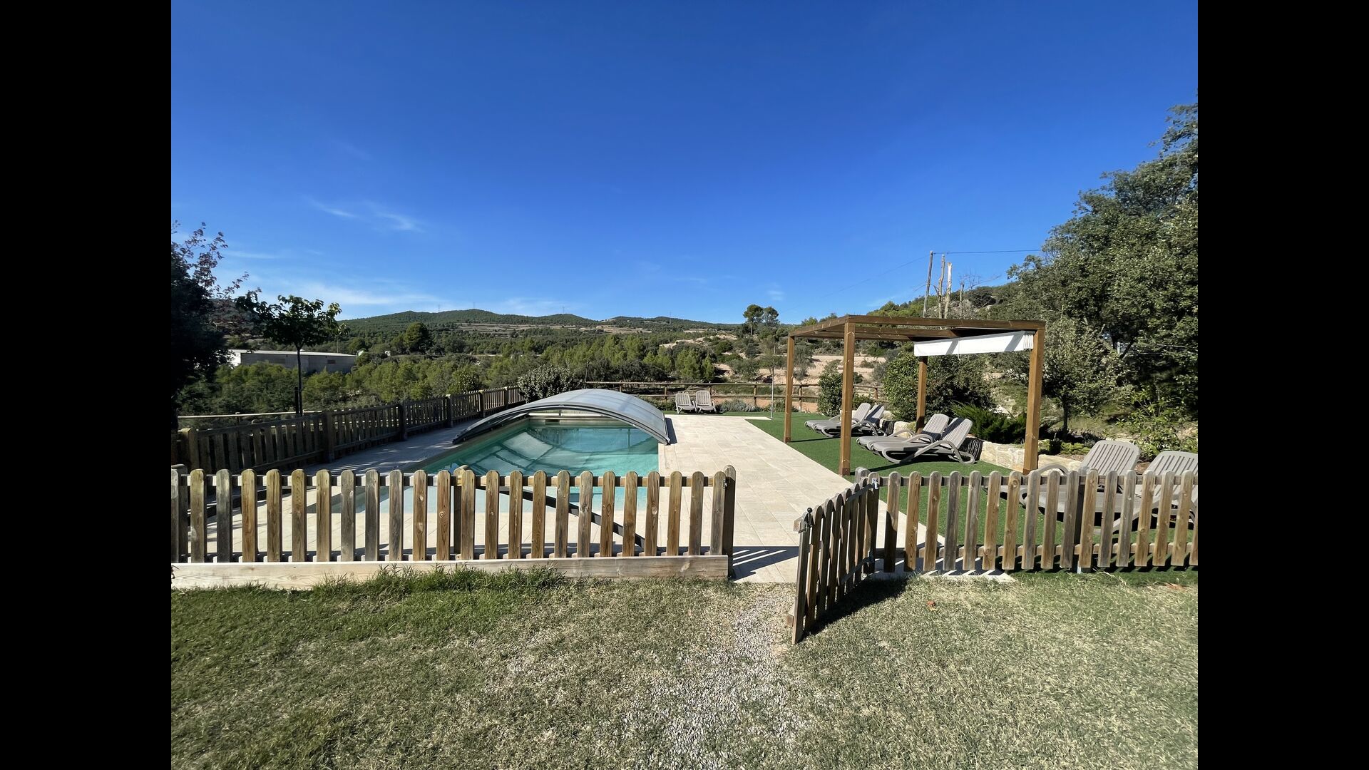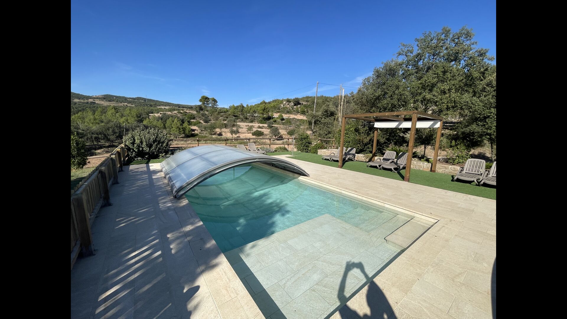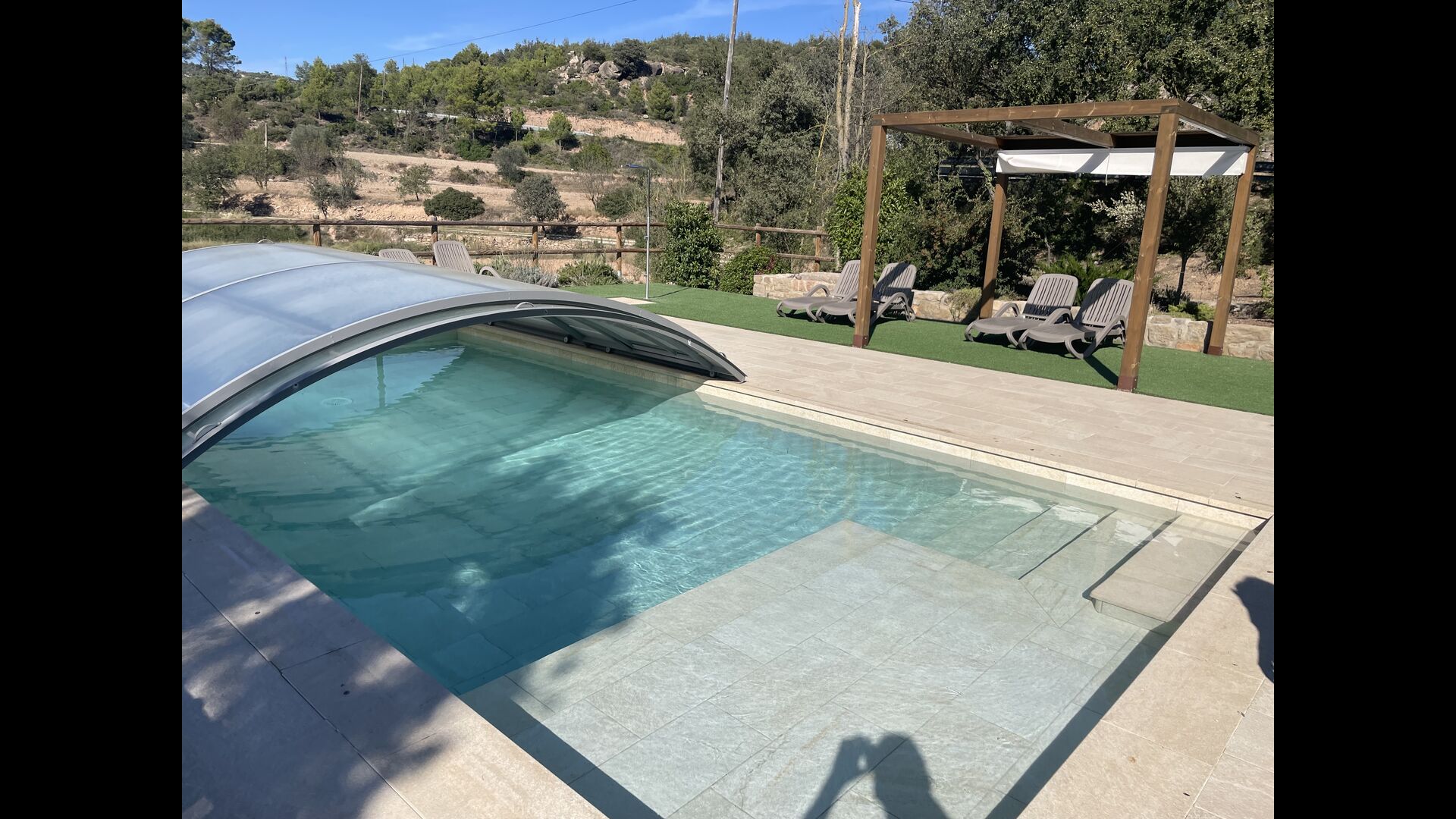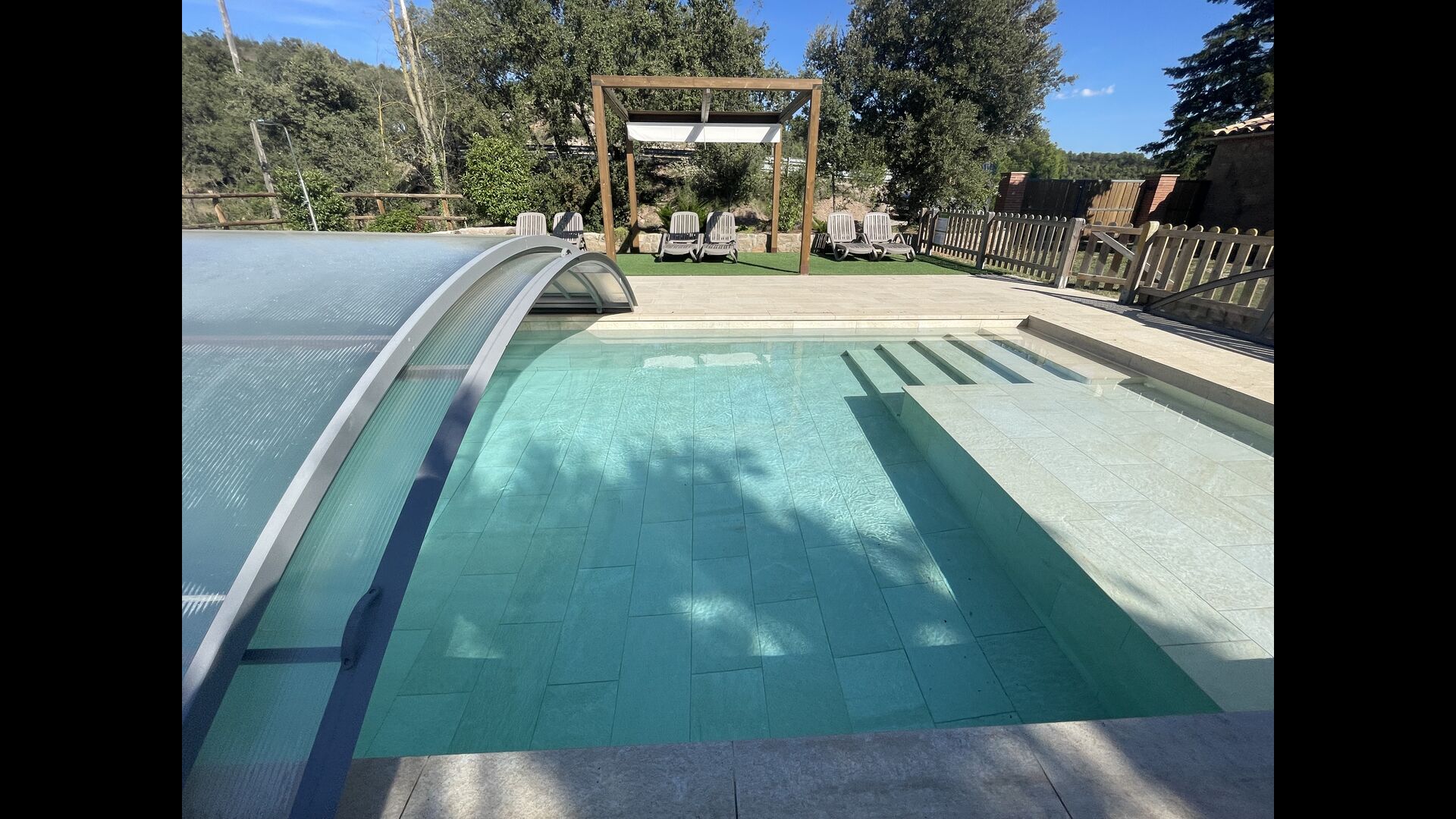 Der wunderbare umzäunte Poolbereich verfügt über viele Liegestühle und eine offene Mini-Terrasse (die Sie abdecken können). zum Beschatten) zum Entspannen im Schatten. Der Pool selbst ist groß und geräumig – Mit Stufen, die bis zum Poolboden reichen, was die Sicherheit für Kinder und ältere Menschen erhöht, und einem überdachten, durchsichtigen Bereich</ stark> auf einer Seite.