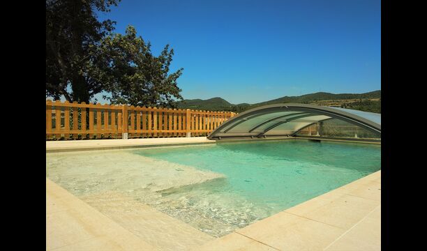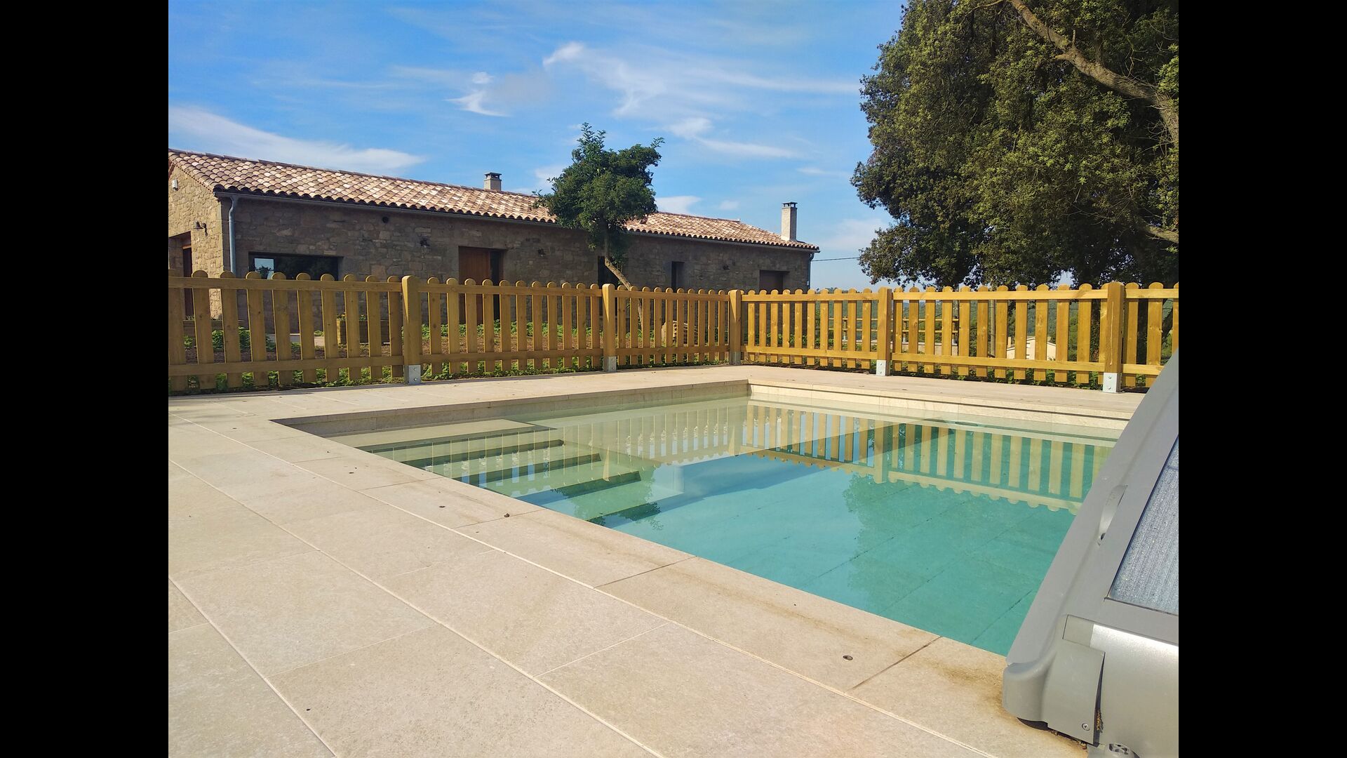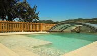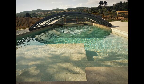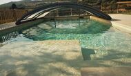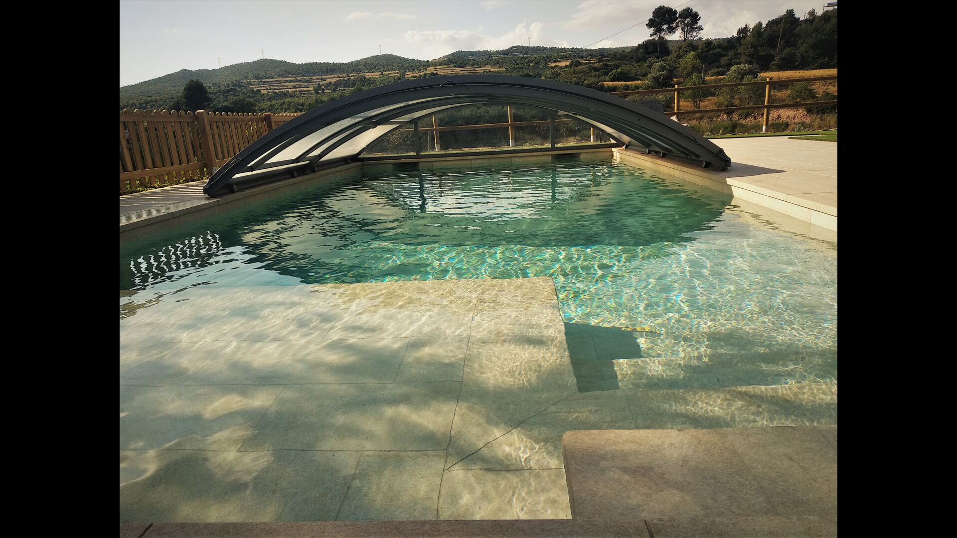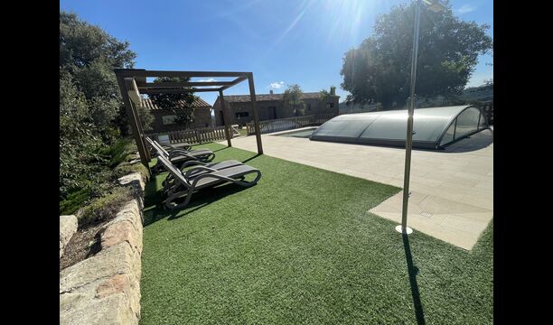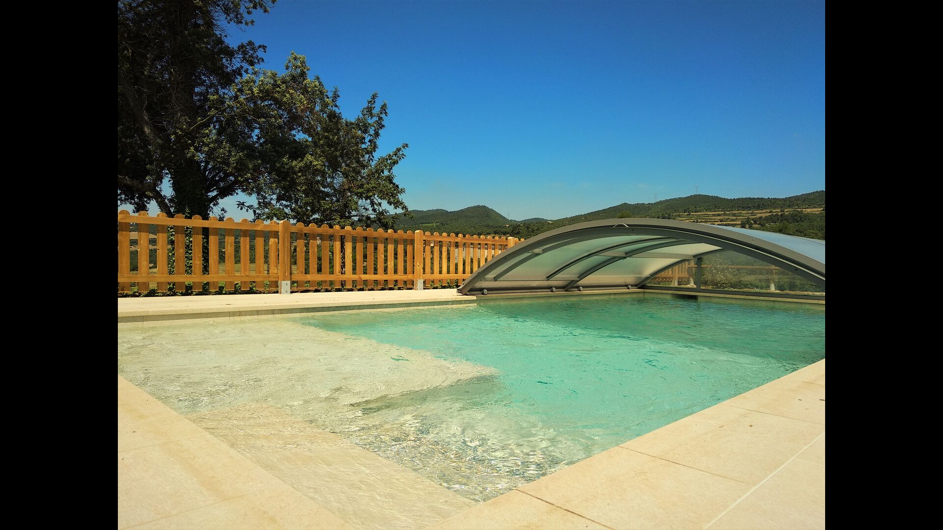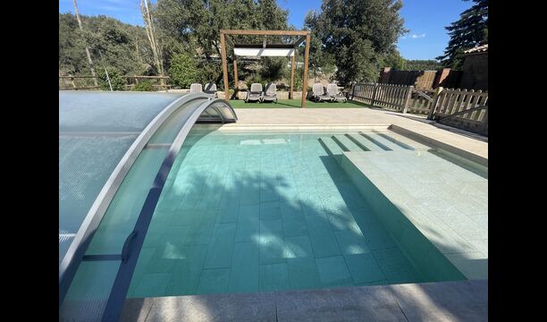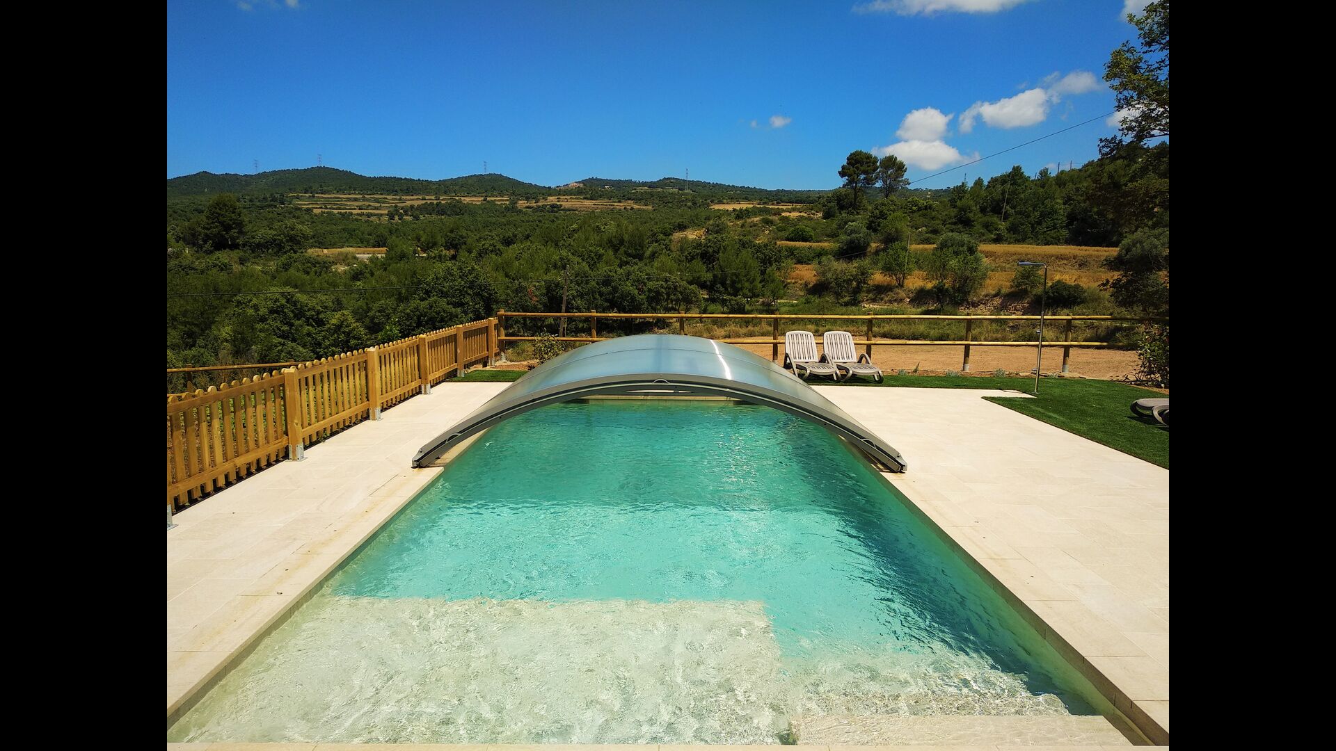 Der wunderbare umzäunte Poolbereich verfügt über viele Liegestühle und eine offene Mini-Terrasse (die Sie abdecken können). zum Beschatten) zum Entspannen im Schatten. Der Pool selbst ist groß und geräumig – Mit Stufen, die bis zum Poolboden reichen, was die Sicherheit für Kinder und ältere Menschen erhöht, und einem überdachten, durchsichtigen Bereich</ stark> auf einer Seite.